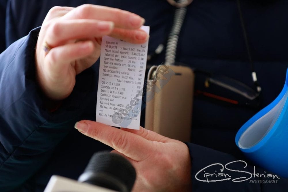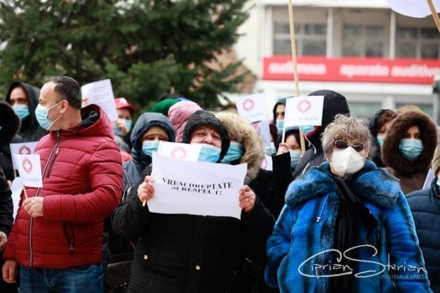 Protestatarii au venit în fața Prefecturii înarmați cu stegulețe, pancarte iar unul dintre brancardieri a venit echipat în costumul alb de protecție pe care este obligat să îl poarte la locul de muncă pe care a scris guvernanților că, deși a lucrat cu pacienții Covid-19, nu a primit sporurile promise.