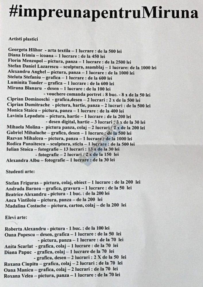 Expoziția organizată timp de trei zile la Muzeul Județean a reușit să adune la un loc mai mulți artiști care și-au donat lucrările spre vânzare iar banii strânși vor ajunge în contul deschis pentru Miruna unde părinții acesteia, Bogdan și Ana-Maria, încearcă să strângă cât mai repede banii necesari unei operații care nu se poate face decât în Anglia și ale cărei costuri se ridică la aproximativ 60.000 de lire sterline.