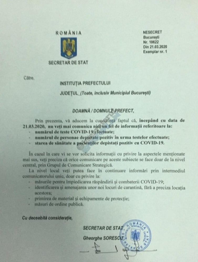 Apelul vine în condițiile în care Institutul de Sănătate Publică a eliminat harta cazurilor de infecție cu coronavirus pe județe iar MAI a interzis prefecților să ofere informații despre numărul de cazuri depistate, numărul de teste efectuate și starea de sănătate a pacienților.