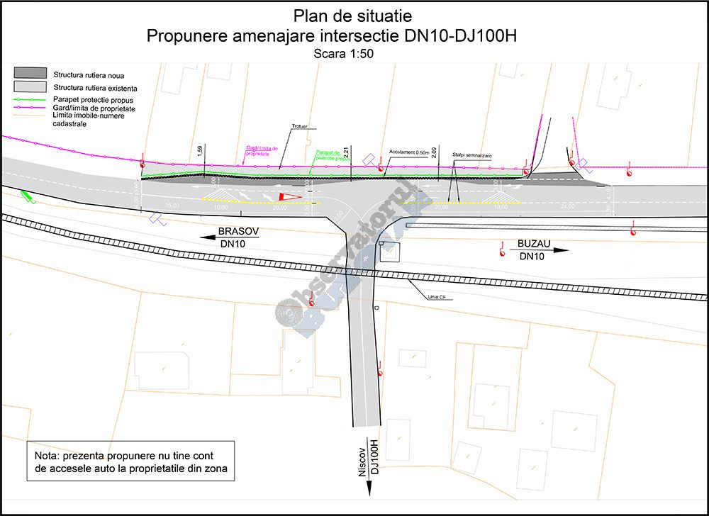 În urma demersurilor Instituției Prefectului – Județul Buzău, Compania Națională de Administrare a Infrastructurii Rutiere a demarat procedurile pentru resistematizarea intersecției prin realizarea unei benzi suplimentare de încadrare la stânga pe DN10 spre DJ100H, concomitent cu lărgirea sensului de mers Buzău-Brașov. Atașăm planul de situație propus de CNAIR pentru amenajarea intersecției.