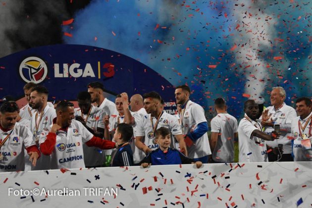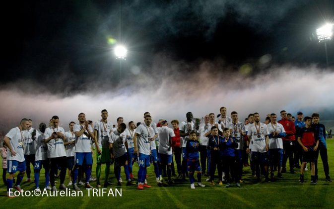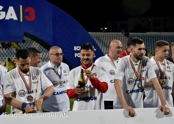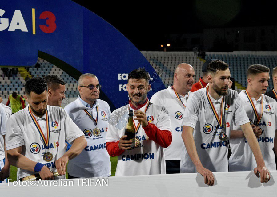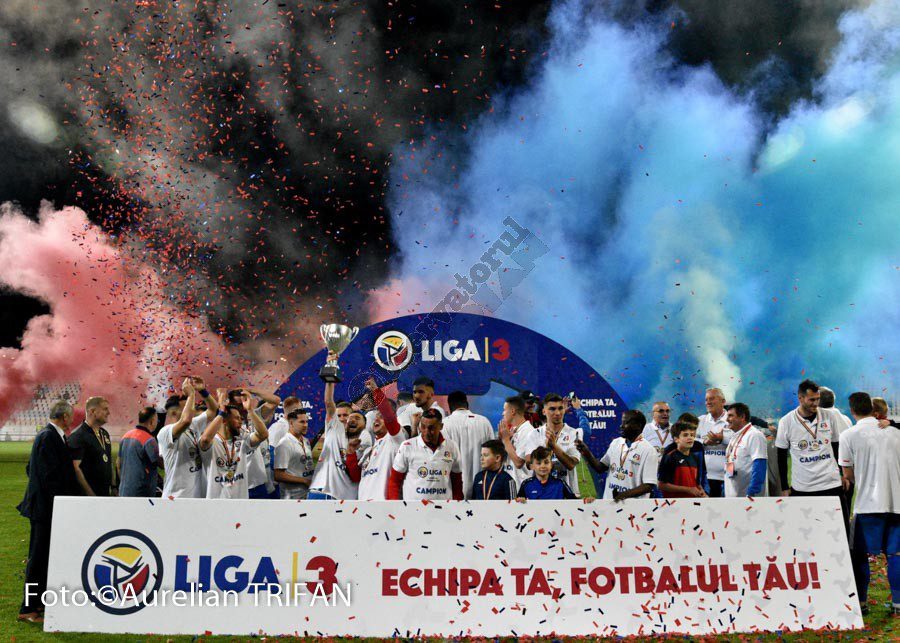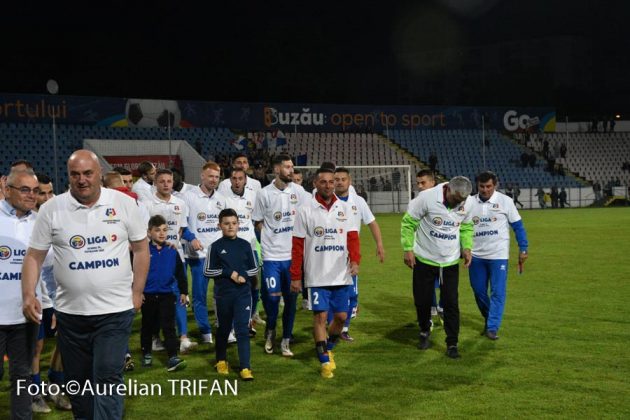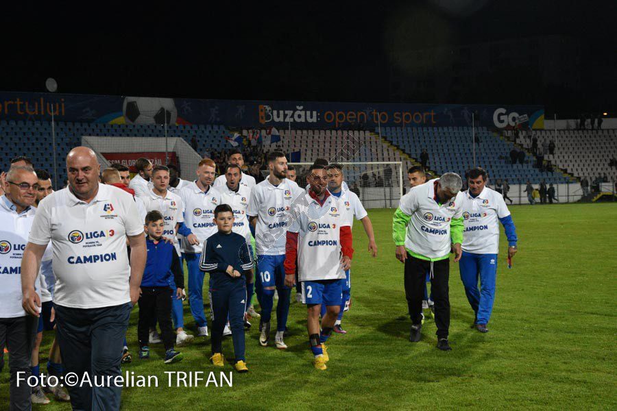 Promovați matematic deja de câteva săptămâni, fotbaliștii glorioși ai Buzăului au intrat în posesia trofeului de campionă a Ligii a III-a abia sâmbătă seară. Pe stadionul din Crâng, în fața tuturor autorităților și a câtorva sute de spectatori, Federația Română de Fotbal și-a trimis reprezentanții pentru a oficia premierea elevilor lui George Timiș. Focul de artificii și confetti au venit și ele în completarea show-ului organizat la finalul partidei câștigate contra CSM Focșani (2-1), iar ridicarea trofeului de către căpitanul Ciprian Petre a fost elementul suprem al unui sezon de excepție. Vorbim de singura echipă din fotbalul românesc care a rămas neînvinsă în toate meciurile disputate în campionat, de un club care a început de la cuțit și furculiță să progreseze, cu oameni, buzoieni sufletiști, care au muncit în ultimii doi-trei ani pentru a face uitate prostiile din perioadele Tulpan – I. Viorel, iar aici o să-i nominalizez și pe ceilalți doi antrenori care au realizat promovările succesive din ligile județene, Vasile Tudose și Gabriel Ibris.
