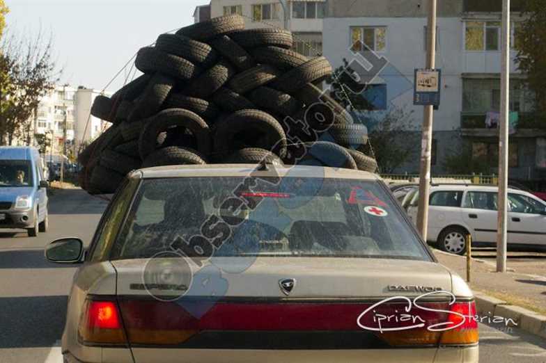Din această categorie face parte și șoferul din fotografie care, pentru a nu fi prins pe picior greșit nici acum, dar nici în următorii zeci de ani, s-a gândit că nu ar fi rău să-și facă ceva provizii de anvelope de iarnă. Și ca să nu fie observat de oamenii legii, pentru că transportul său depășea cu mult gabaritul mijlocului de transport, el s-a gândit că nu ar fi rău să se camufleze pe cît posibil între mașinile aflate în trafic. Ceea ce i-a și reușit.