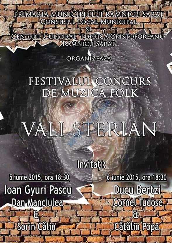 Primăria Râmnicu Sărat împreună cu Centrul Cultural „Florica Cristoforeanu” organizează la începutul lunii iunie cea de-a treia ediție a Festivalului de muzică Folk „Vali Sterian”. Evenimentul, programat pentru week-end-ul 5-6 iunie, va aduce pe scena Casei de Cultură din Râmnicu Sărat nume celebre din folk-ul românesc precum Ioan Gyuri Pascu și Ducu Bertzi dar și vedete locale precum Cornel Tudose sau Dan Manciulea. Înscrierile la festival au început de ceva vreme și marți, pe 19 mai, este ultima zi în care se mai primesc înregistrări. În concurs se pot înscrie toți folkiștii începând cu vârsta de 14 ani, care trebuie să trimită pe adresa de email a organizatorilor două înregistrări, una cu o piesă compoziție proprie și o alta cu una din melodiile lui Vali Sterian, urmând ca până la începutul lunii iunie organizatorii să anunțe concurenții selectați pentru festival.