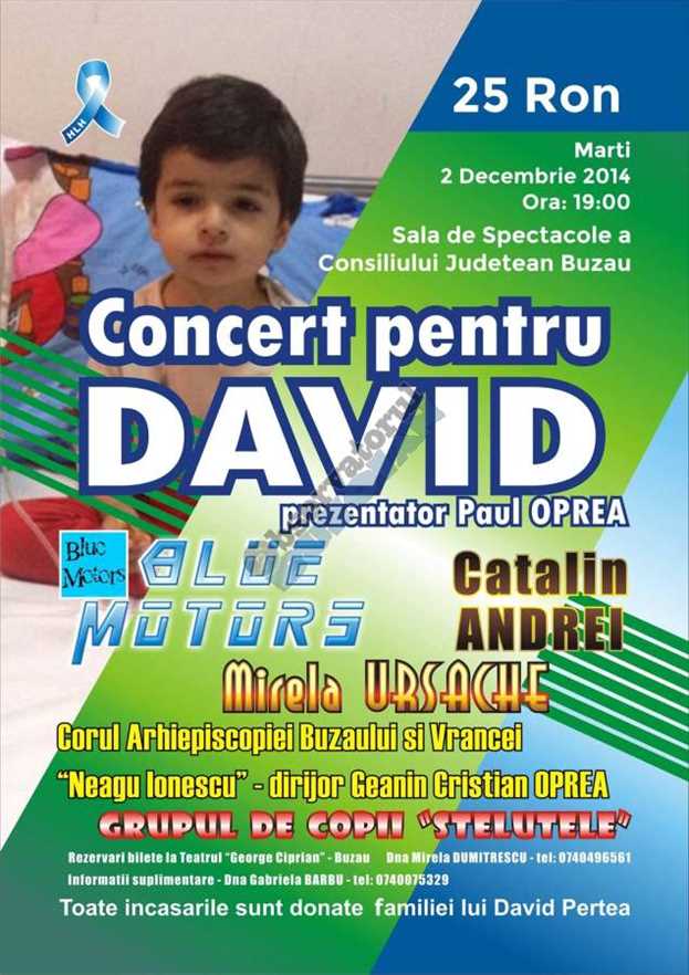 Marți, 2 decembrie, în Sala de Spectacole a Consiliului Județean Buzău, va avea loc un concert caritabil în urma căruia se speră a se mai strânge ceva fonduri care să ajute la tratamentele de care depinde viața lui David.