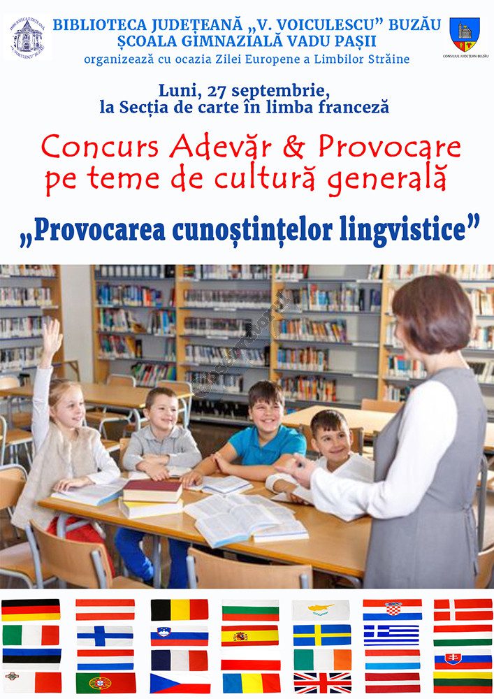 Biblioteca Județeană „V. Voiculescu” Buzău, instituție de cultură ce funcționează sub autoritatea Consiliului Județean Buzău, organizează, luni, 27 septembrie, în parteneriat cu Școala Gimnazială Vadu Pașii, un concurs de cultură generală, cu ocazia Zilei Europene a Limbilor Străine. Este vorba despre o competiție destinată elevilor, bazată pe jocul „Adevăr și Provocare”, dar de data aceasta întrebările și provocările vor fi de cultură generală.