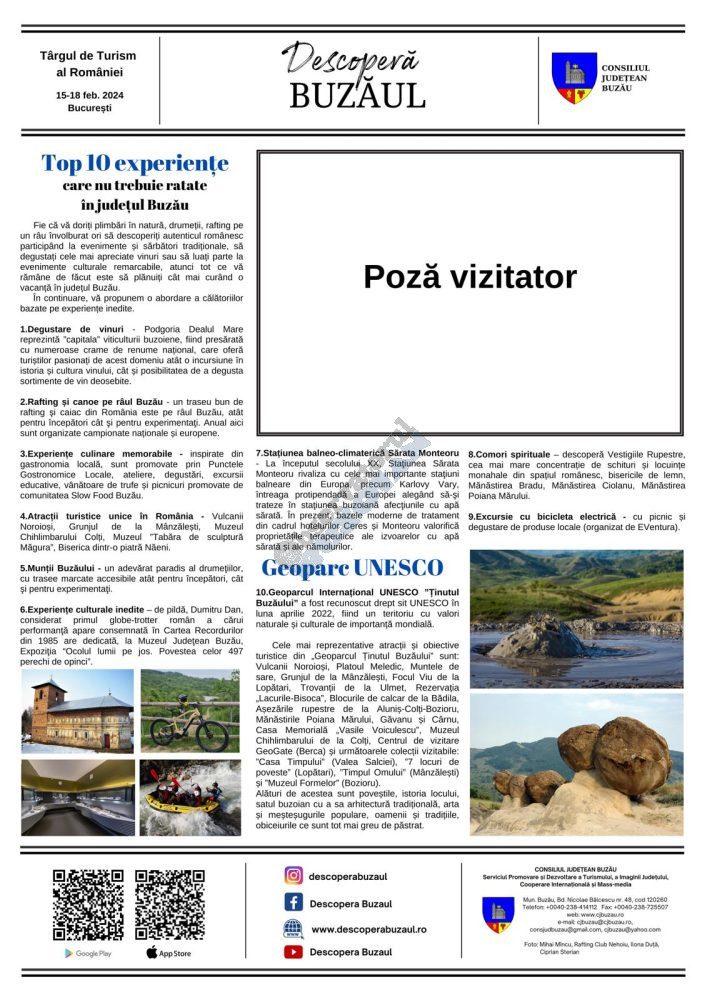 Anul acesta vrem să vorbim mai mult vizitatorilor standului Consiliului Județean Buzău despre experiențele pe care le poți avea în județul Buzău. Le vom prezenta într-o manieră inedită – o ”pagină de ziar” cu tema ”Top 10 experiențe ce nu trebuie ratate în județul Buzău” va fi personalizată cu poza vizitatorului, facută pe loc la stand cu ajutorul unei cabine foto.