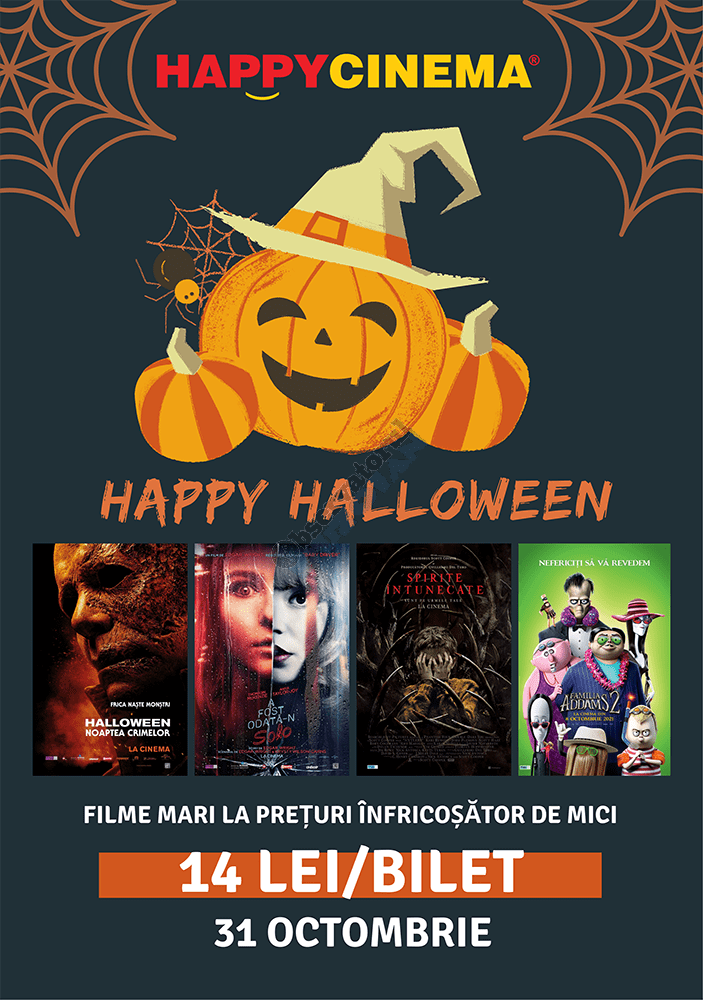 Nu lăsa gândurile să te bântuie, vino la Happy Cinema în Galleria Mall! Doar pe 31 octombrie vezi patru filme mari la prețul unic, înfricoșător de mic, de numai 14 lei/ bilet.