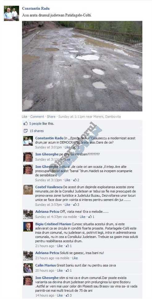 Președintele Consiliului Județean Buzău, Cristi Bîgiu invită buzoienii să îi aducă la cunoștință, pe pagina personală de Facebook, problemele cu care se confruntă în județ pentru ca împreună să poată identifica soluții ce pot duce la rezolvarea acestora. Președintele Consiliului Județean Buzău a luat această decizie după ce, în ultima vreme , mai mulți buzoieni i-au postat pe pagina creată pe cea mai populară rețea de socializare, imagini cu diverse drumuri din județ aflate într-o stare extrem de avansată de degradare, dar și cu alte probleme, solicitându-i în același timp soluții.