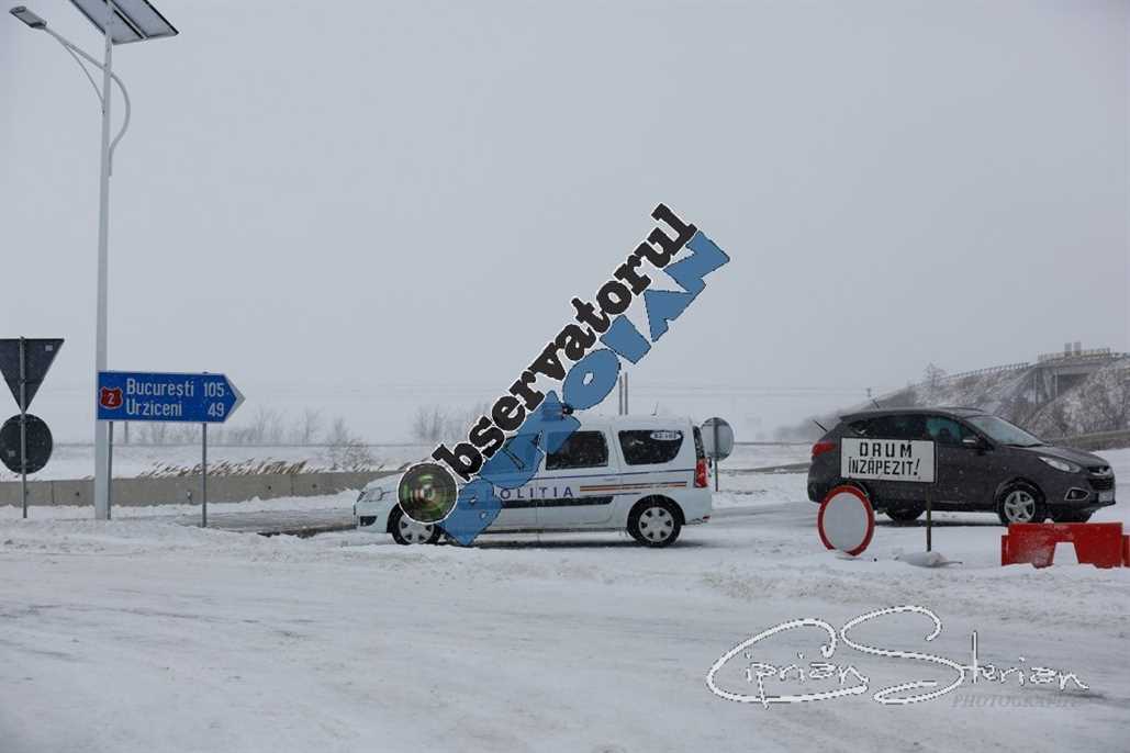 Porțiunea de drum european care face legătura între Buzău și județul Ialomița a fost închisă încă de la primele ore ale dimineții iar drumarii nu pot acționa pentru a reda drumul circulației publice din cauza vântului puternic care ia zăpada de pe camp și o așterne, din nou, pe carosabil.