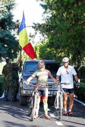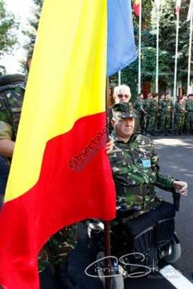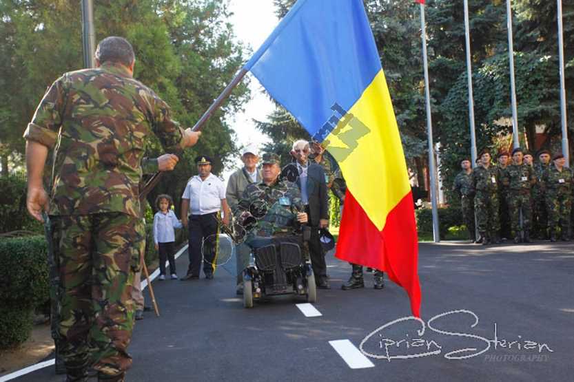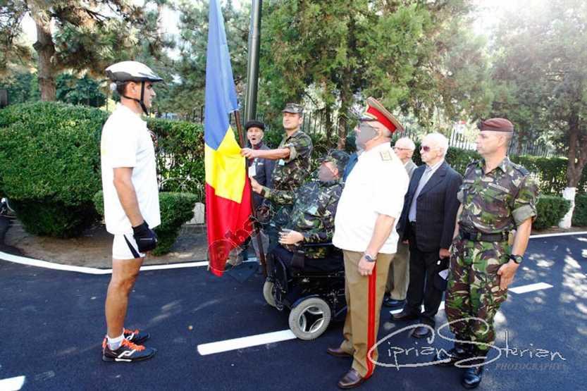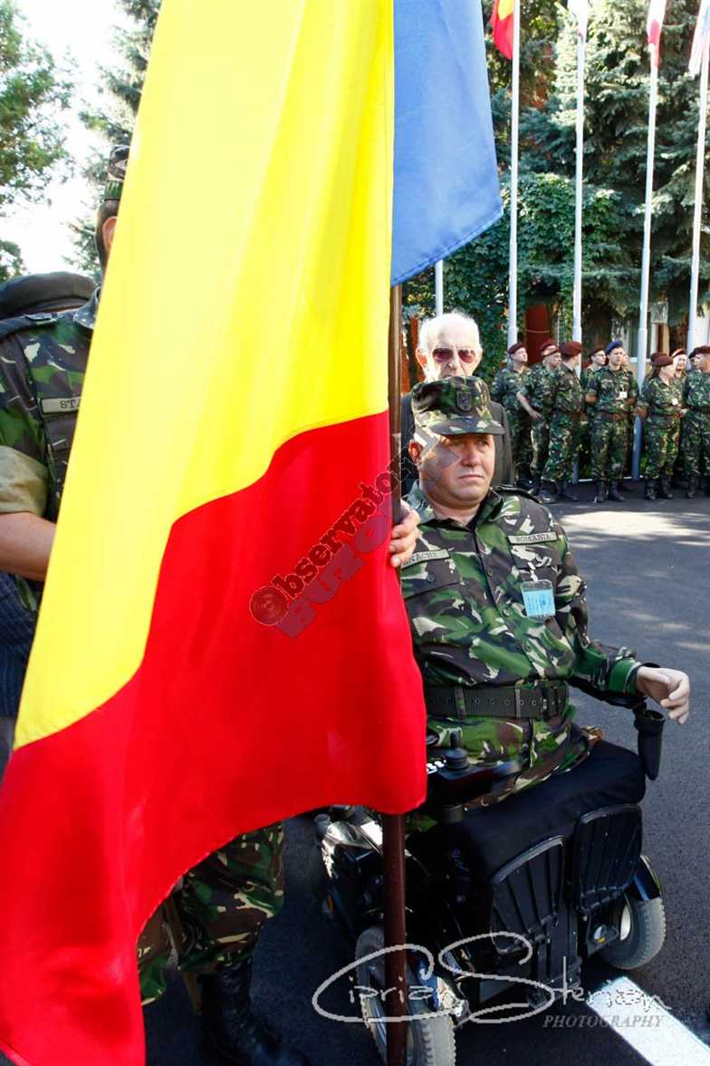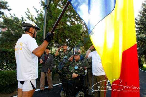 Plutonierul-adjutant principal, Florinel Enache, militarul care și-a pierdut picioarele și o mână în teatrul de operații din Afganistan pe 4 mai 2012 a înmânat, marți dimineață, Drapelul Național al României unui colonel care va parcurge cu bicicleta aproximativ 130 de kilometri pentru a-l arbora pe vârful Penteleu.