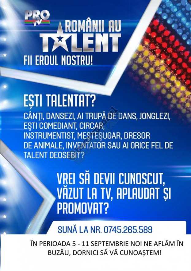 Aveți un talent deosebit și nu ați reușit să vă afirmați până acum ori sperați să rupeți gura târgului cu aptitudinile dumneavoastră? Într-o astfel de situație trebuie să știți că echipa ”Românii au talent” se află la Buzău în căutarea talentelor românești autentice, până pe data de 11 septembrie.