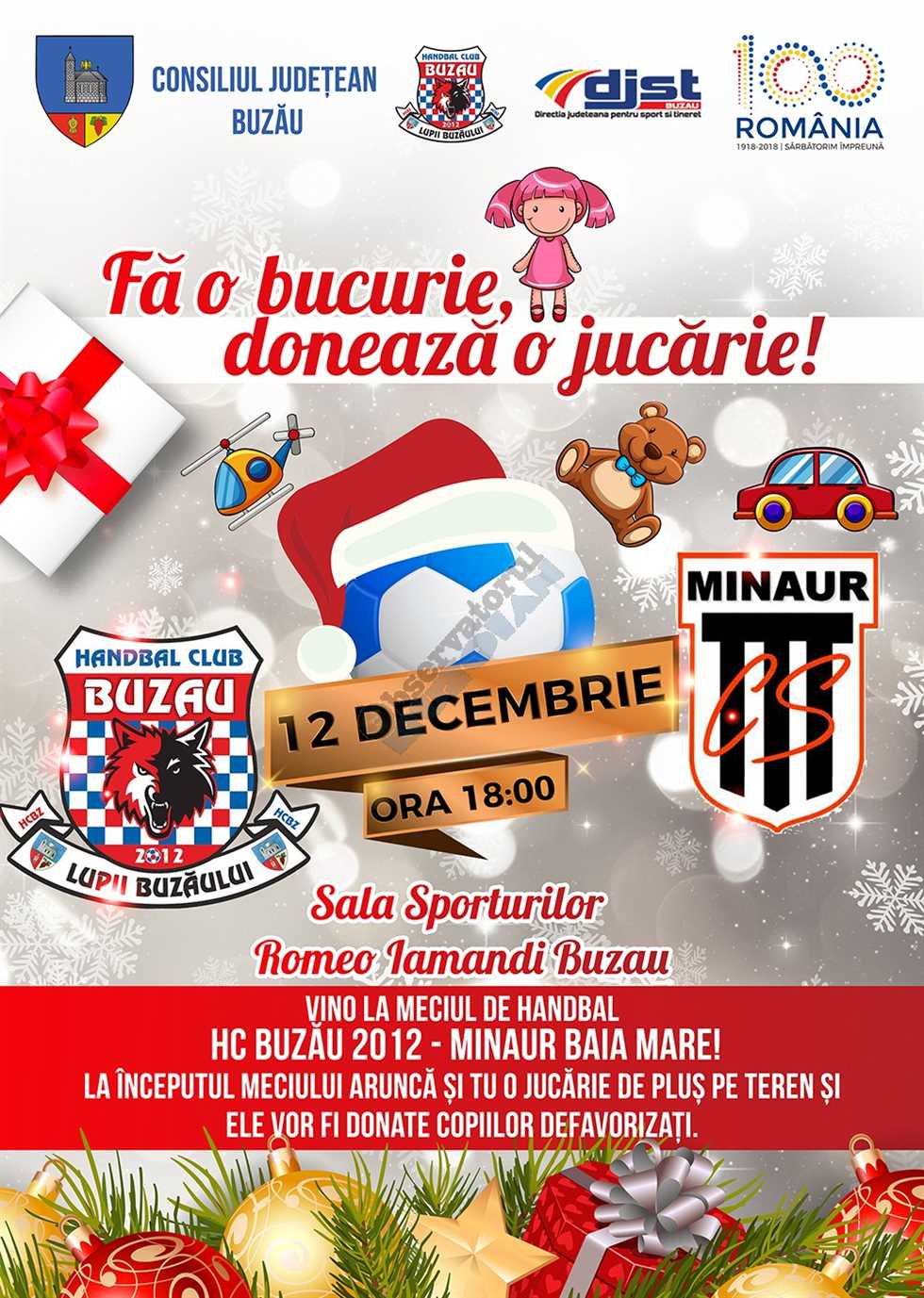În acest sens la ultimul meci de handbal disputat pe teren propriu în acest an de către HC Buzău 2012 în compania echipei Minaur Baia Mare spectatorii sunt invitați să aducă câte o jucărie de pluș pe care să o arunce în trenul de joc. De asemenea pentru cei care nu pot ajunge la meci și au posibilitatea de a dona jucării și hăinuțe la Sala Sporturilor „Romeo Iamandi” a fost organizat un punct de colectare pentru ca astfel darurile oferite de buzoieni să ajungă mai repede la copiii mai puțin norocoși din întreg județul.