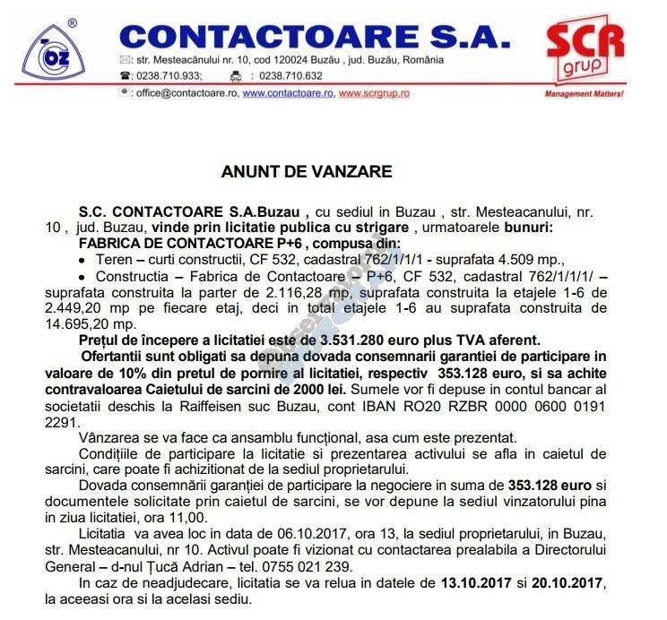 Fabrica Contactoare deținută de omul de afaceri Ștefan Vuza este scoasă la vânzare. Conform anunțului vânzare se va face prin licitație publică iar prețul de pornire este de 3,5 milioane de euro plus TVA. În prețul cerut de omul de afaceri din Piatra Neamț se oferă peste 4.500 de metri pătrați de teren și aproape 17.000 de metri pătrați de suprafață construită dispusă pe 7 nivele.