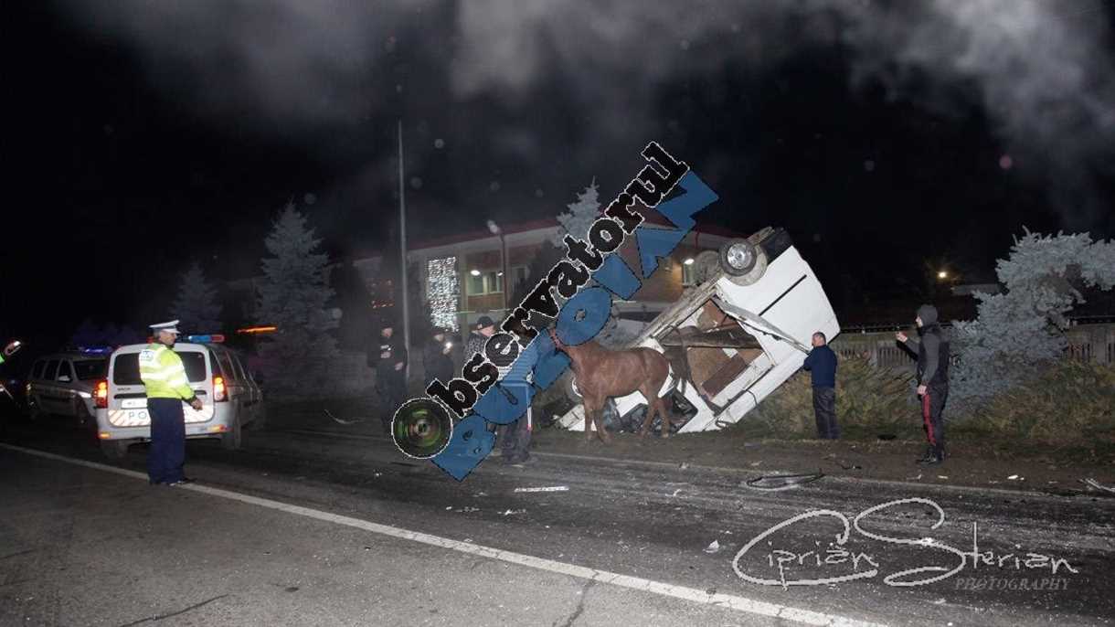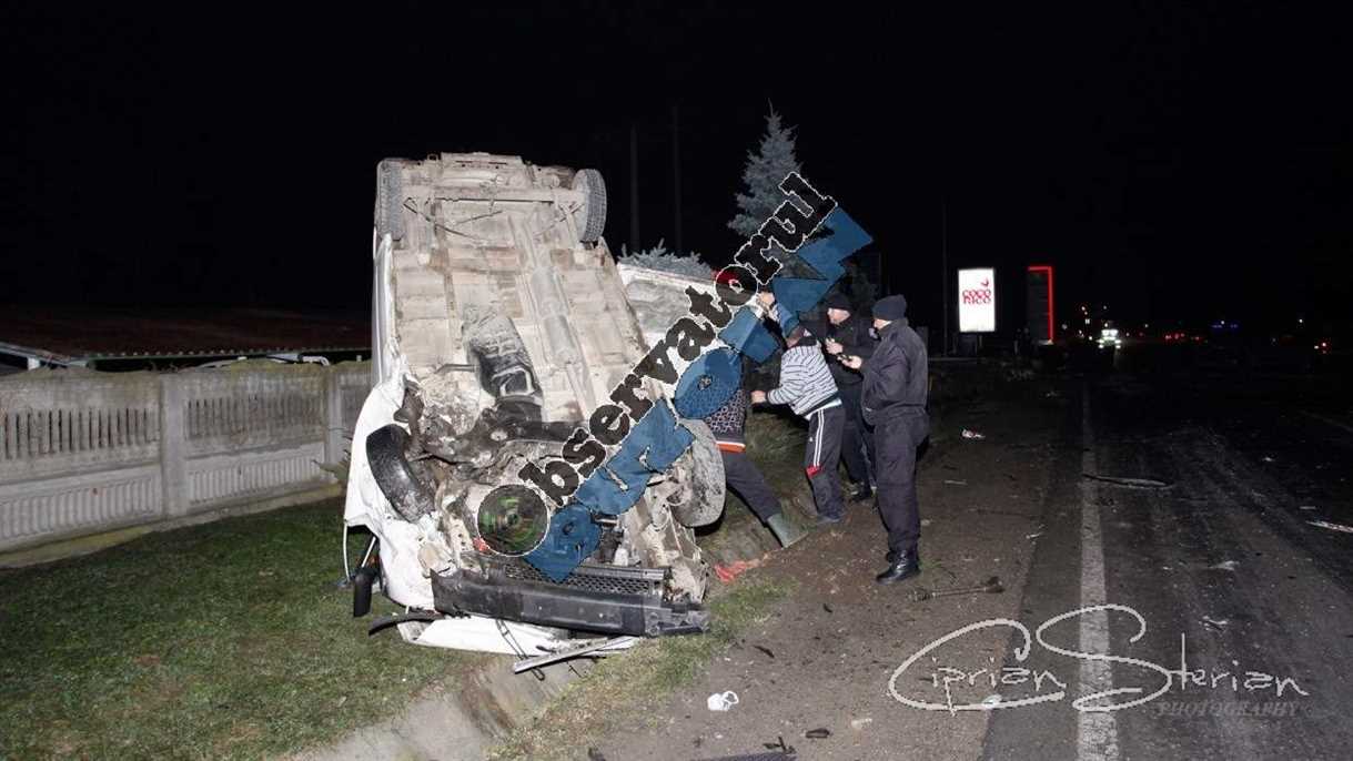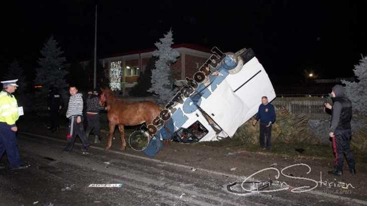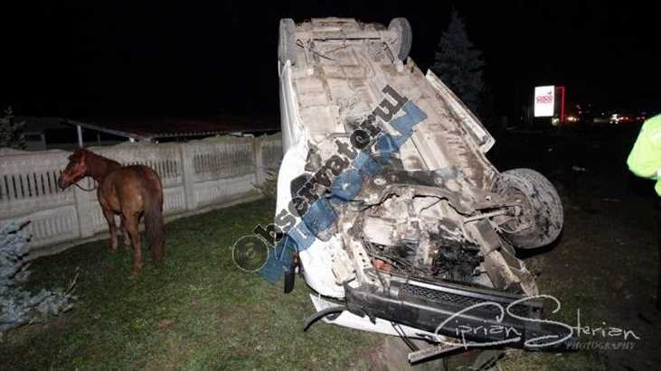 Un grav accident s-a produs, vineri seară, pe DN2B Buzău Brăila la ieșirea din municipiul Buzău. Patru oameni au ajuns la spital cu răni grave după ce un autoturism înmatriculat în Timișoara și o dubă înmatriculată în Bulgaria s-au ciocnit frontal. În urma impactului motorul autoturismului a fost aruncat pe câmp la mai bine de 10 metri de locul accidentului iar duba s-a răsturnat și a rămas înfiptă cu botul în șanțul de pe marginea drumului. Doi pasageri din Dubă au rămas încarcerați și a fost nevoie de intervenția pompierilor pentru a putea fi scoși din mașină. Din primele date se pare că șoferul autoturismului ar fi fost cel care ar fi pătruns pe contrasens și s-ar fi izbit frontal de duba care circula dinspre Brăila spre Buzău și care transporta un cal care s-a ales doar cu o sperietură zdravănă. Circulația în zonă a fost oprită zeci de minute iar posesorii de mașini de teren sau ceva mai înalte au trecut de locul accidentului pe câmp. La ora redactării acestei știri traficul a fost reluat alternativ pe un singur sens sub supravegherea polițiștilor rutieriști.