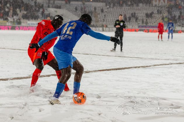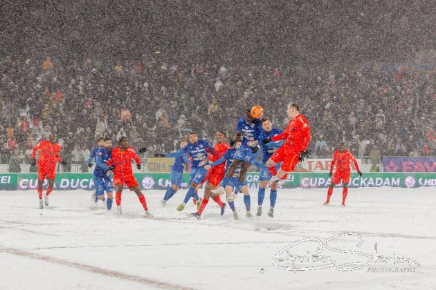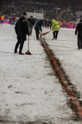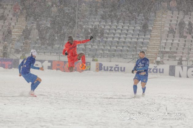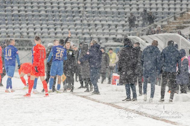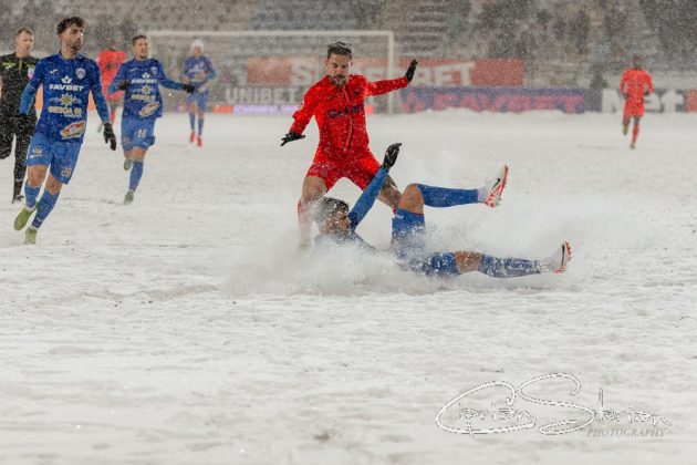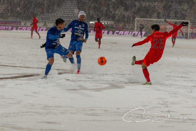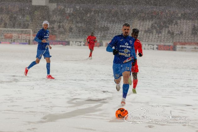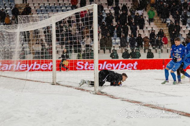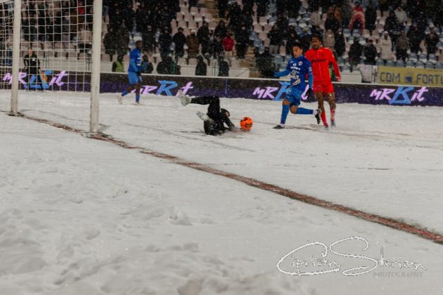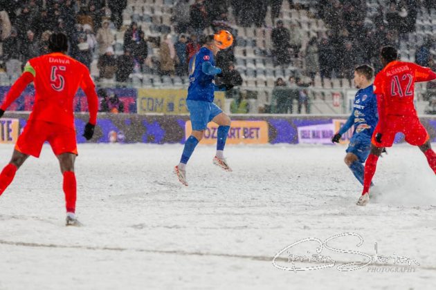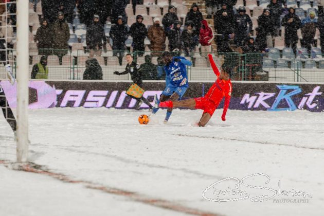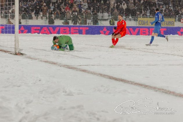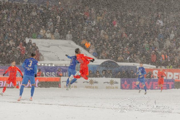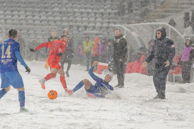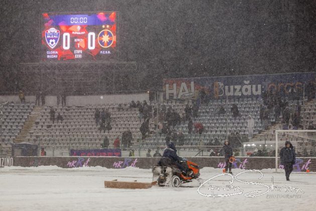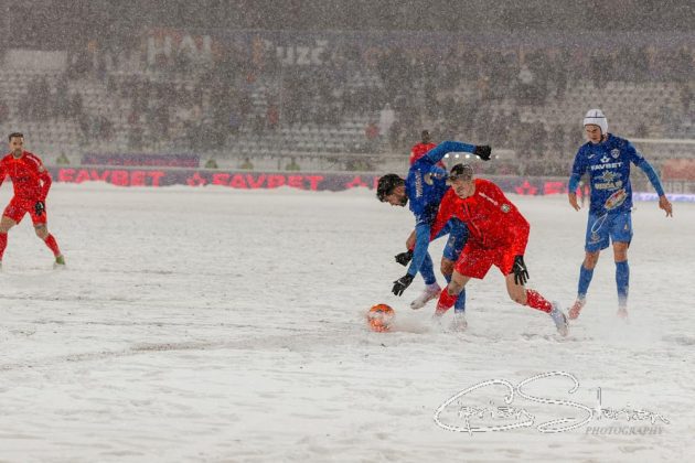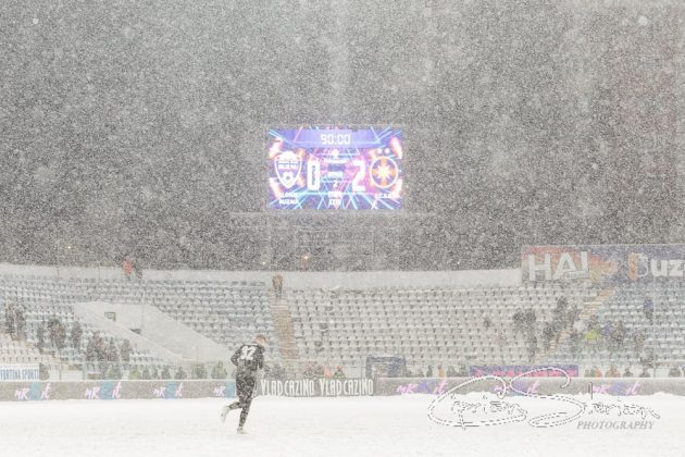 În ciuda unei deszăpeziri „la banchetă” prestată de angajații clubului până la debutul partidei, duelul s-a dat pe un teren acoperit de omăt și sub o ploaie de fulgi de care acoperea rapid tușele trasate în glumă. Elevii lui Elias Charalambous au reușit să se impună în a doua repriză când arbitrul le-a acordat un penalty iar jucătorii Gloriei, ca să nu fie mai prejos, le-au făcut și ei cadou un gol.