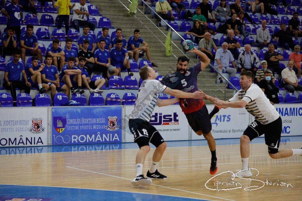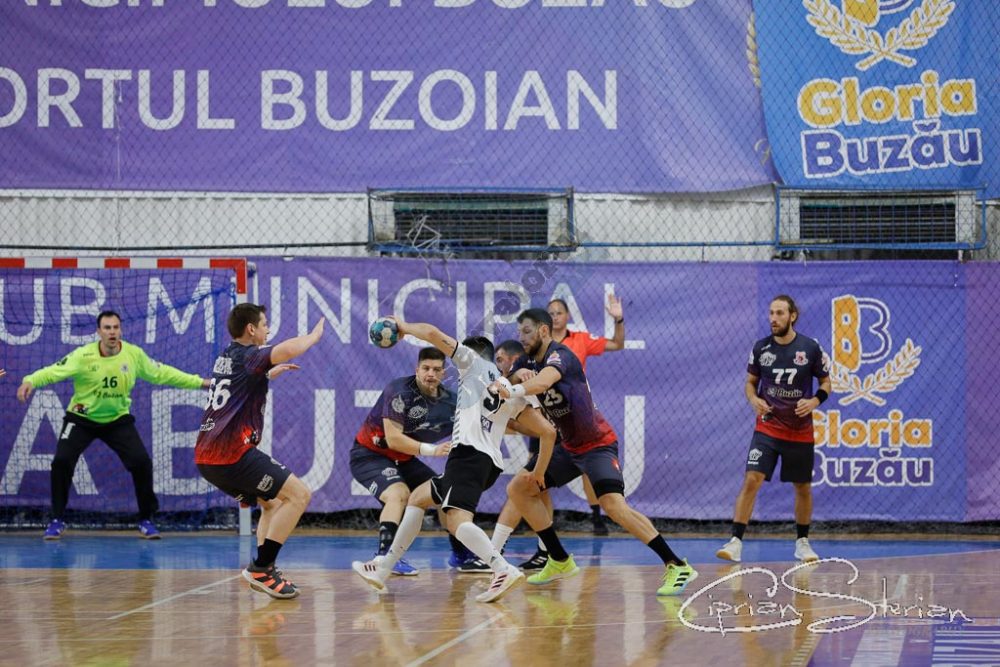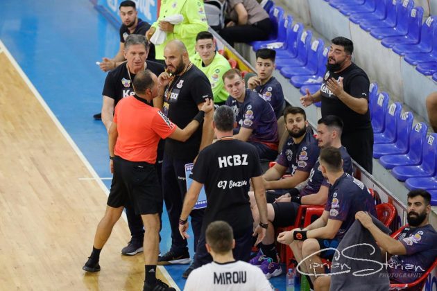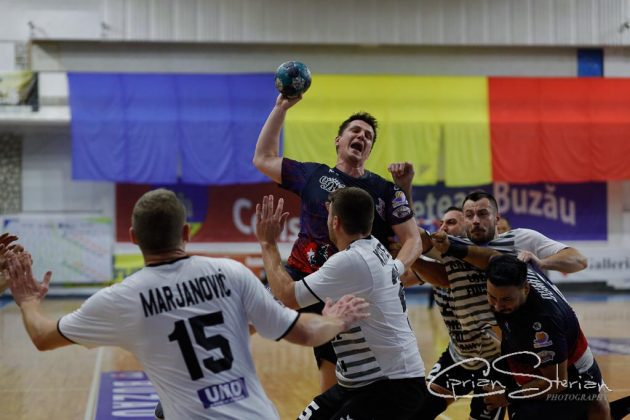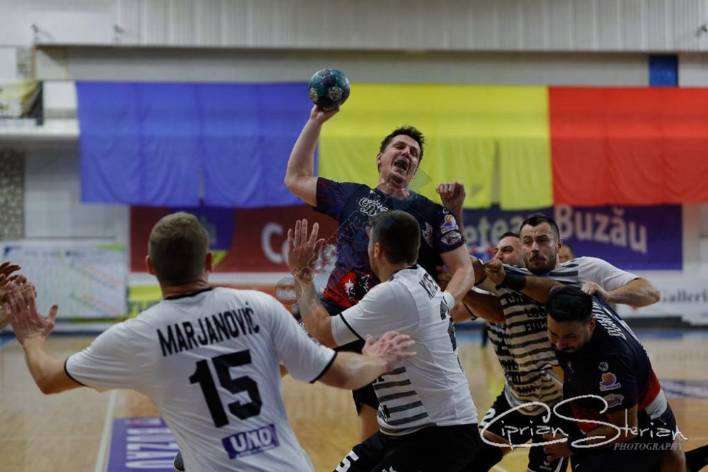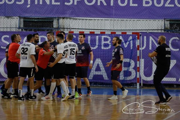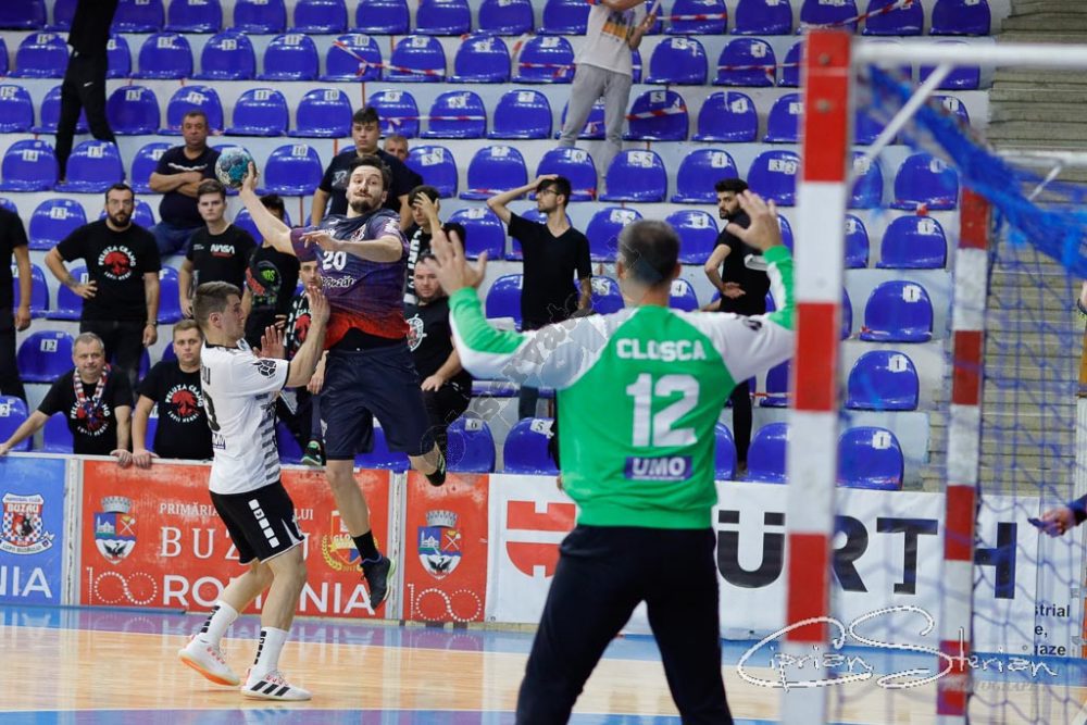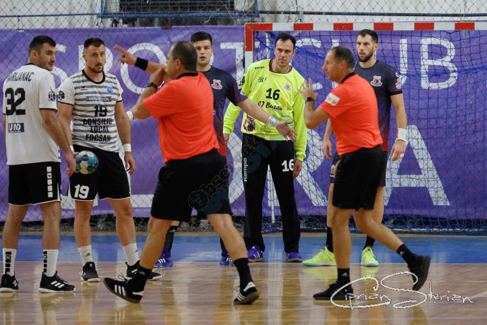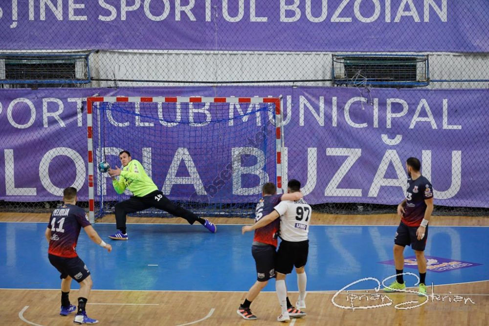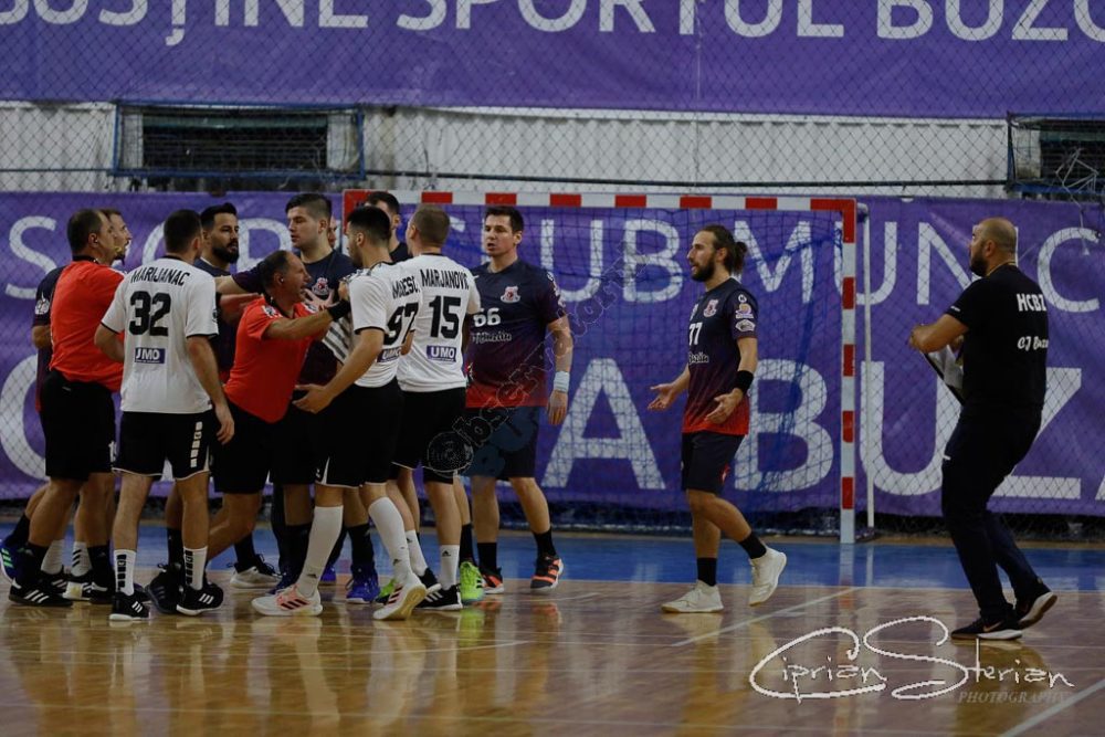 Ambițiile și nervii din cele două tabere s-au arătat la față chiar din minutul 3, atunci când sângele fierbinte al spațiului ex-iugoslav a adus la rampă pe „vrânceanul” Marijanac contra unui trio buzoian venit din aceeași zonă geografică, Vuk-Pelidija-Glendza. S-a lăsat cu câte o eliminare din fiecare tabără, iar scorul a mers aproape cap la cap până la mijlocul reprizei. Când am avut două goluri avans, dar am irosit două atacuri consecutive ce ne-ar fi putut umple un pic plămânii cu aer de victorie. Și tot așa până când oaspeții au reușit să treacă în avantaj, 10-11 în min. 21. Barele porții adverse, trei șuturi la rând (și apoi încâ una la 12-14!) se cereau unse cu mir la pauză, dar de unde să aduci așa ceva într-o seară de duminică? Istoria primei părți se scrie într-un final plin de nervi, cu ambii arbitri cautând nod în papură alor noștri, cu antrenorul Pero Milosevic sub forma unei bombe atomice și un 13-16 pe tabela de marcaj.