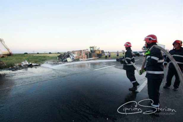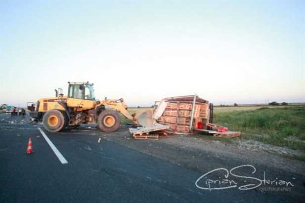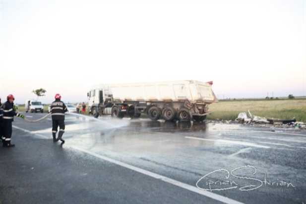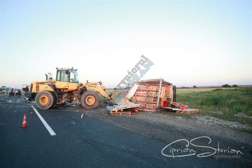 Pentru degajarea șoselei polițiștii au apelat la ajutorul unui utilaj cu care au împins în afara părții carosabile resturile autoutilitarei iar pompierii au curățat șoseaua cu jet de apă.
