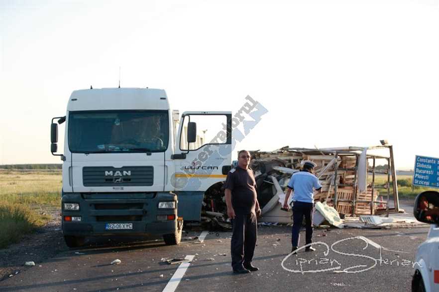 Impact nimicitor la ieșirea din Buzău către Ploiești. Șoferul unei autoutilitare care transporta paleți a ajuns la spital după ce din cauza neatenției și a vitezei neadaptate a observat prea târziu un tir oprit pe partea dreaptă a drumului pe care nu l-a mai putut evita. Șoferul autoutilitarei, un bărbat de 49 de ani din Botoșani, a intrat puternic în bena autovehiculului staționat iar mașina pe care o conducea a fost distrusă în totalitate. Potrivit martorilor șoferul ar fi ieșit ca prin minune din cabina contorsionată și a fost preluat de o ambulanță care l-a transportat la Spitalul Județean de Urgență Buzău. Traficul la locul producerii accidentului s-a desfășurat alternativ pe o singură bandă de circulație vreme de mai bine de o oră iar cozile formate s-au întins pe kilometric întregi.
