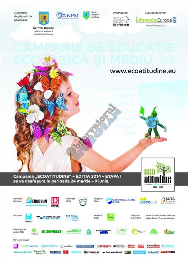 De asemenea, vineri, la Sala de Festivități a Consiliului Județean Buzău, va avea loc festivitatea de premiere din cadrul proiectului „EcoAtitudine = Responsabilitate,Informaţie, Acţiune” Campanie de Educaţie Ecologică şi Mediu – Etapa I, Ediţia 2014, eveniment organizat de Grupul European de Presă Reporter prin revista InfoMediu Europa, realizat sub patronajul Ministerului Mediului și Schimbărilor Climatice, Agenţiei Naţionale pentru Protecţia Mediului și a Gărzii Naţionale de Mediu.