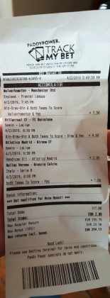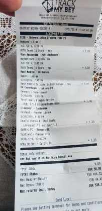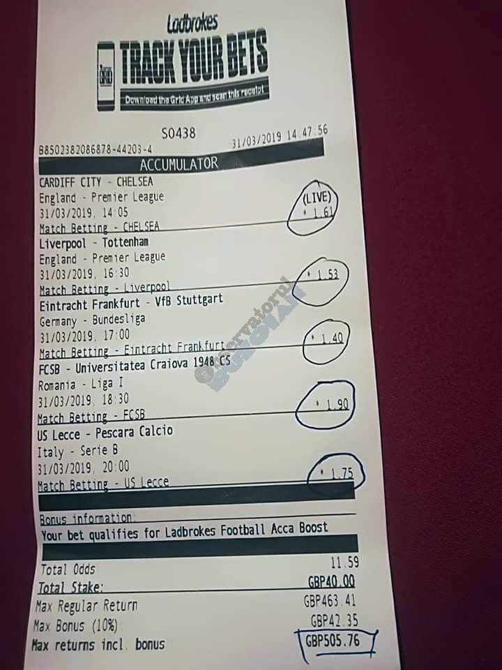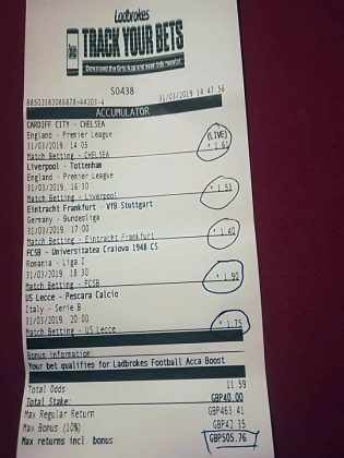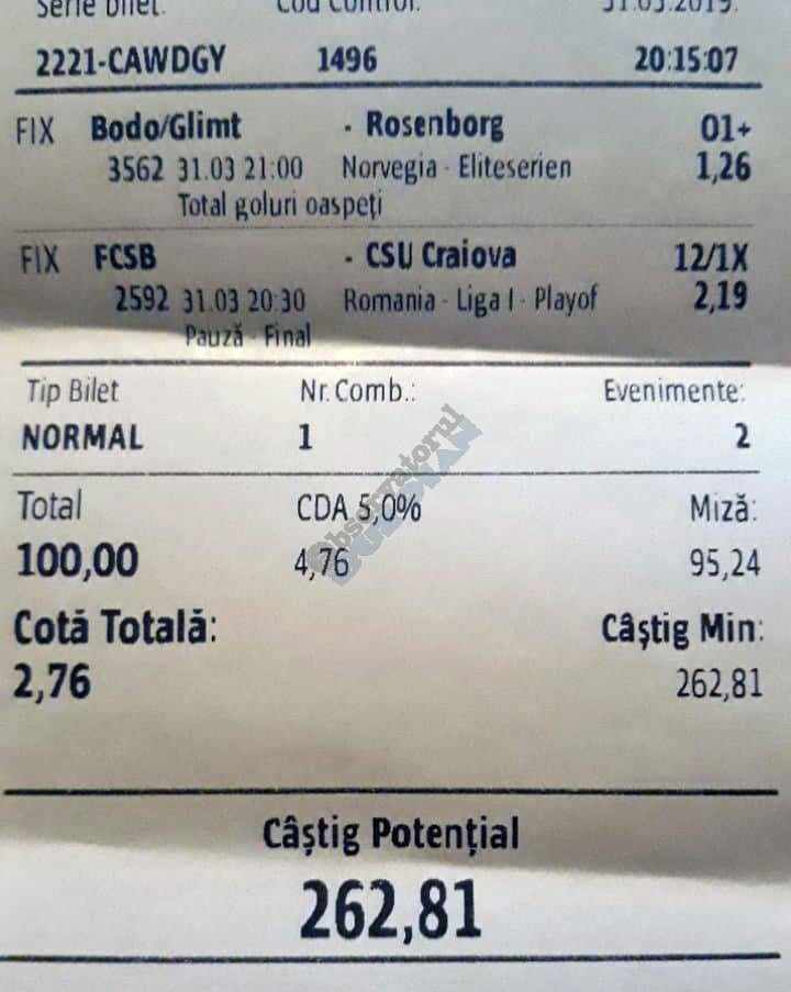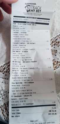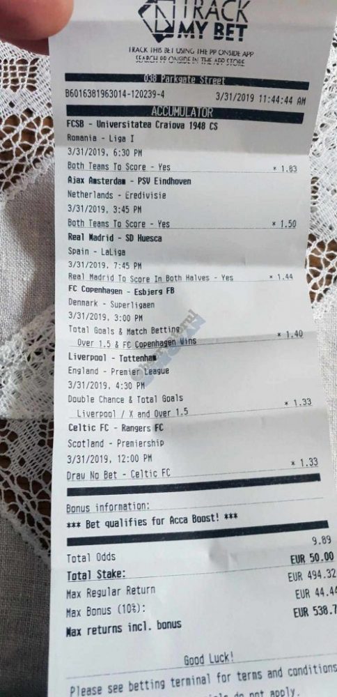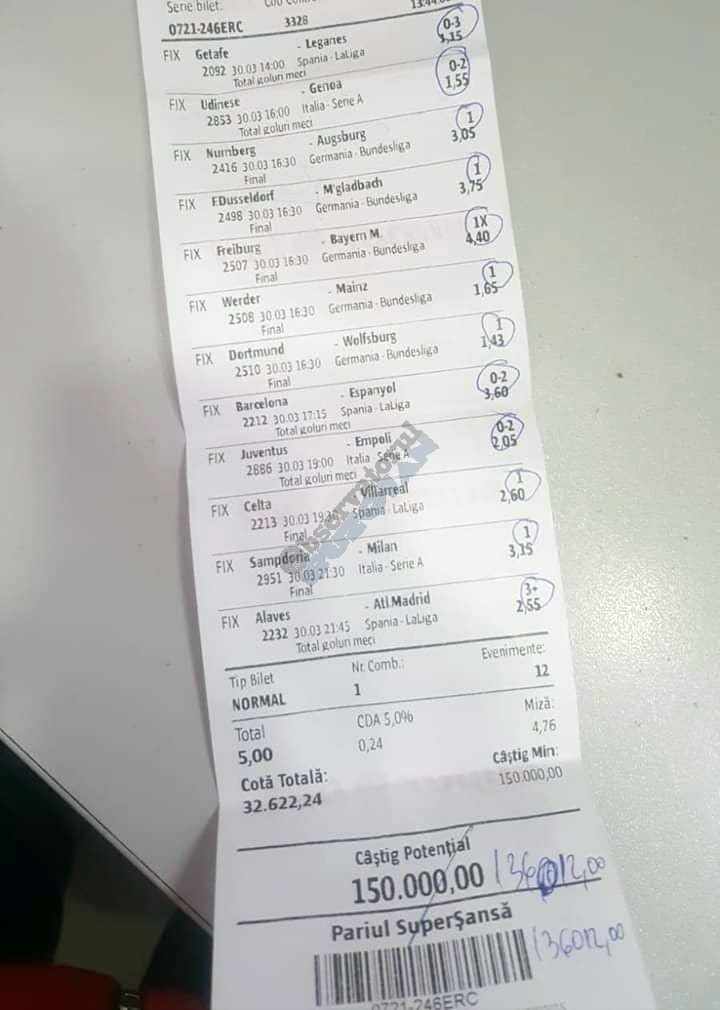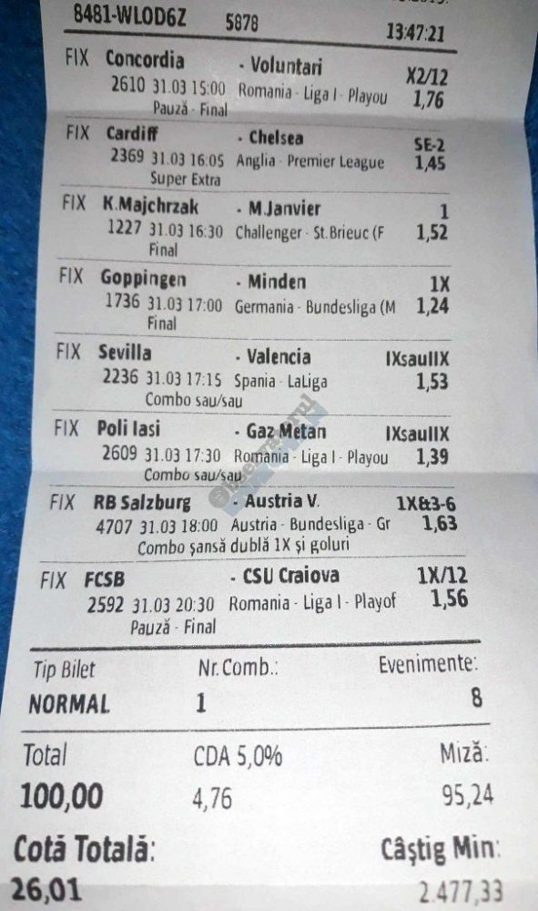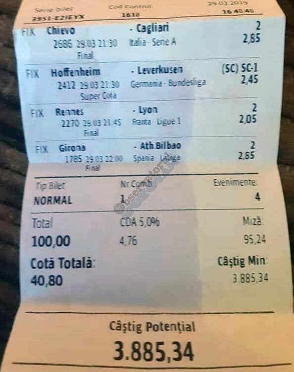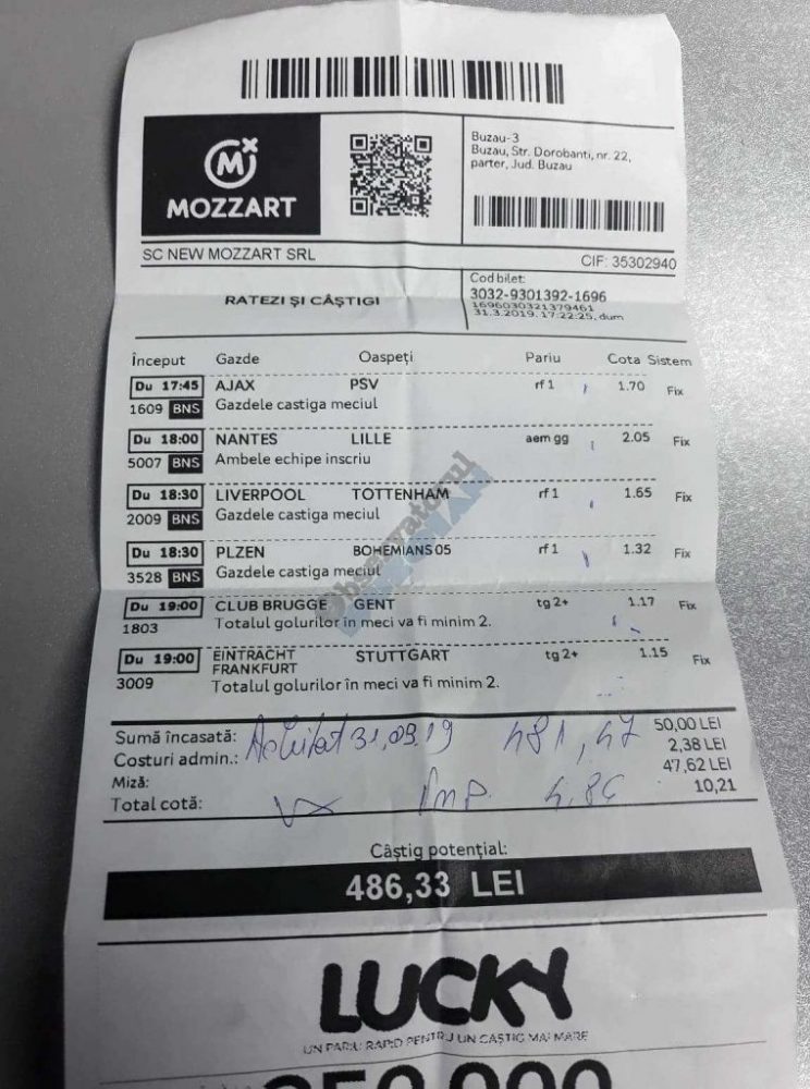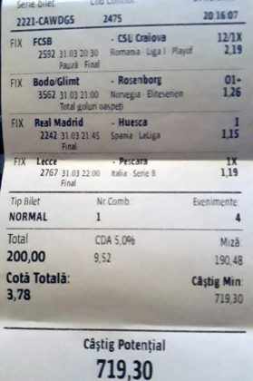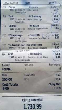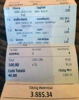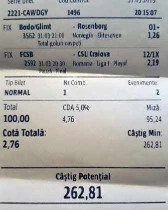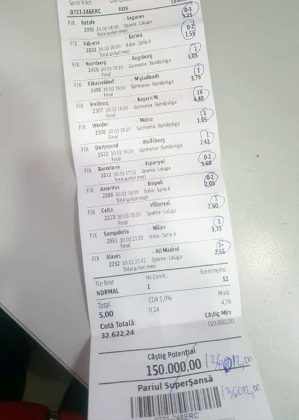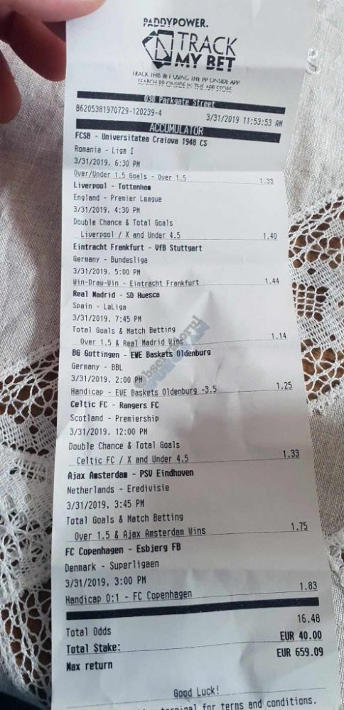 Ultima parte a episodului de față este rezervată biletelor trimise de voi sau jucate de mine. Primul dintre ele (foto 1) este pierdut de mine pentru un singur gol la meciul câștigat de FC Copenhaga cu 1-0, meci în care am văzut ce înseamnă să te ajute arbitrii, echipă mare fiind în acea țară. Cel puțin 5-6 ofsaiduri inexistente ale oaspeților semnalate de tușierul din partea a doua a meciului, iar centralul a fluierat toate, dar absolut toate contactele fizice dintre jucători în favoarea multiplei campioane a Danemarcei! În foto nr. 2 e biletul meu de duminică, verde de data aceasta, și cu un alt arbitru în prim plan, tușierul de pe atacul lui Chelsea care nu a ridicat fanionul la un ofsaid de 2 m la golul egalizator al echipei lui Sarri. În rest, toate celelalte evenimente bifate fară emoții. La nr. 3 și 4 sunt două bilete trimise de Franco Swiss, ambele ratate pe aceleași două meciuri: gol marcat de Rosemborg și o “dublă de duble” la FCSB – Craiova. A pus amândouă meciurile pe cele două bilete ca să fie sigur că lasă banii în contul casei de pariuri. Tot pierdute sunt nr. 5 și 6, de data asta în Dublin (Irlanda) de Gomez, ambele pe același meci, cel de la Copenhaga, dar cu pariuri diferite. La unul a gândit că vor bate gazdele în handicap -1, iar în celalalt a văzut “1 și 2+”. Scorul îl știți, vi l-am zis la biletul ratat de mine, 1-0. Am primit biletul nr. 7 de la Alexandru Ioan Luca și este excepțional! Patru soliști, noroc fantastic cu golul din final al lui Lyon și revenirea lui Bilbao de la 0-1, dar un bilet de nota 10. Biletul nr. 8 este al lui Iorga Maradona (plasat în Anglia) și, din nou, nota 10! Cinci soliști și norocul sosit pe filierele Chelsea și Liverpool cu goluri ale victoriilor pe finalurile celor două partide. De la Cucu Rareș (și el rezident în Marea Britanie) vin următoarele 5 bilete, de la 9 la 13, toate câștigate, chiar dacă la unele a dat cash out în momentul în care nu a mai fost sigur pe rezultatul ultimului meci plasat pe bilet. Ultimul dintre ele (foto 13), tot cu suma retrasă, pariat 30 de lire – retras 180, chiar dacă cele două meciuri ramase (St. Etienne – Nîmes și Arsenal – Newcastle) păreau sigure, gazdele să câștige și omul nostru să încaseze aproape 470 de lire. Iar în acele două meciuri chiar au învins gazdele în cele din urmă… Omul nostru, Rareș din Newbury, a trimis și foto nr. 15 cu cash out-ul de la acel ultim bilet, care a fost de fapt de 340 de lire și nu 180 așa cum înțelesesem eu la foto 13. (Sunt un pic zăpăcit, dar credeți-mă că primesc câteva sute într-un weekend și vreo 50-70 într-o zi din mijlocul săptămânii.) Biletul nr. 14 este “BOMBA ZILEI”! Trimis de Francezu ATFC, dar plasat de “un moșulică”, așa cum s-a exprimat chiar el, conține 12 evenimente, miza este 5 lei, iar inspirația ne lasă fară aer! Limite mici de goluri în meciuri clare de 3+, soliști, spectacol… și 150 de mii de lei câștigați. La mai mare, moșule, oricine ai fi tu! Biletul cu nr.16, penultimul al articolului de azi, este al lui Păcală din Dorobanți, dar postat de Bogdann Bogdan. Nu mai am nimic de comentat, a pus omul 10 lei și a încasat aproape 500 cu 6 meciuri simple la prima vedere, combinate cu gust și inspirație așa cum ne-ar trebui tuturor zi de zi. Iar ultimul bilet, nr.17, vine de la George Valentin din Dublin, cu niște mici bombe, dar cu un noroc uluitor la meciul de la Villareal unde Barca egalează de la 2-4 în ultimele 4 minute de prelungiri. 2 euro pariați la cotă de 117, zice Georgică al nostru, “la mișto, că s-a saturat de nebuniile pe care le fac favoriții”. Pe ei pe mama lor!