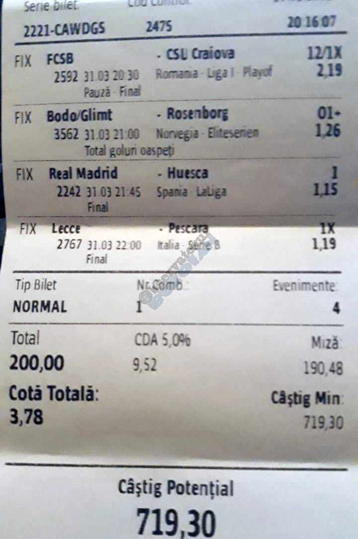 Recapitulam împreună propunerile mele pentru meciurile din episodul nr. 24. Au fost inițiate idei interesante de pariere, nu am ratat niciun meci din listă, iar pe cel mai slab dintre ele tot am avut două din trei predicții verzi! Pentru jucători, rezultatul meciului SEVILLA – VALENCIA a fost o surpriză după ce oaspeții au învins 1-0, gol în min. 45. Și pe mine m-a surprins, dar nu m-a prins nicicum pe picior greșit! Banii sunt la mine, o să postez biletul în ultima parte a articolului. Eu am văzut bine “X în oricare dintre reprize” și “0-1 gol în prima și 0-3 în a doua”, iar cu “1X și 0-4” am dat-o de gard. Seara de duminică s-a încheiat cu derby-ul nostru pentru locul al doilea (nu cred nici măcar 1% că ardelenii mai pot pierde campionatul!) FCSB – CRAIOVA, despre care ziceam că “nu cred că va mai aduce ploaia de goluri (5 la număr) din urmă cu cîteva săptămâni, am impresia că ambii antrenori vor prefera să închidă culoarele înainte să-și pregătească atacul decisiv”. Din punctul ăsta de vedere m-am păcălit, dar când a fost vorba să vă propun ce să jucați, și eu împreună cu voi, am lovit în plin: “gol în ambele reprize”, “minim un gol în prima și peste 1,5 goluri în meci” și “1-3 goluri în repriza a doua”. Acesta a fost meciul cu care am închis biletul câștigător de duminică seara, iar varianta aleasă de mine a fost cu totul alta decât vă spusesem vouă să jucați: 1X/12. Luni nu am jucat deloc cu voi, am făcut-o de unul singur și m-am “bucurat” de ceea ce am văzut la Botoșani, “capra de serviciu” a doritorilor de puncte pe bani. Două meciuri am analizat pentru seara de marți, ambele rezolvate cu câte două din trei predicții bune, deci bine, per total. La WATFORD – FULHAM am ratat doar numărul golurilor marcate de gazde, eu am zis 2-3, ei au dat chiar 4. N-a fost o pagubă, nu cred că jucau nici nebunii o asemenea variantă, eu mai jonglez printre ele ca să nu vă plictisesc cu 1,15-1,22. Am văzut bine pronosticurile de bază: “1 solist” și dubla de duble “1X/12”. Thrillerul serii a fost în Cupa Germaniei, în Augsburgul bavarez. (Aici am ales eu să joc, pentru că dacă mă bagăm să fac pe deșteptul la Lyon mi-o trăgeau de-mi mergeau fulgii! Pe bilet la agenție i-am jucat, să nu credeți c-am fost atât de inteligent să-i evit…) Deci revin la AUGSBURG – LEIPZIG. Am vrut să fac un experiment la “dubla de duble X2/12”, aceeași cu care ratasem meciul și în campionat, și s-a găsit islandezul Finbogasson s-o bage în ațele taurilor în ultimul minut regulamentar. Dar am pus verde lângă alte două idei cu cote de 1,40: “X2 și 0-4 goluri” și “0-2 goluri în prima și 0-2 în a doua”, fară nici-o emoție că scenariul jocului va fi mutat în direcția inversă celui închipuit de mine. Seara de miercuri a fost o catastrofă pentru mine! Degeaba vin cu idei bune în ziar, dacă la agenție mă trezesc cu CFR pe bilet… V-am zis că ROMA – FIORENTINA e meciul perfect pentru GG-ul (1,60) mijlocului de săptămână și nu m-am înșelat, dar cred că 90% dintre pariori au avut plasat acest eveniment pe biletele lor. Am intuit ușor și varianta “gol în ambele reprize”, dar m-am păcălit un pic la dubla de duble (1X/12) acolo unde luasem victoria Romei drept pronostic de bază. Dar știu că sunt foarte puțini jucători care folosesc asemenea variante de pariere pe bilete. Meciul serii din DFB Pokal, SCHALKE – WERDER BREMEN, n-a avut absolut niciun secret pentru mine. Faptul că aproape un sfert din viață mi-am petrecut-o pe teritorii teutone (și abonat ani la rând al lui FC Koln, VFB Stuttgart și FC Zurich) îmi dă și un pic de autoritate în creier atunci când analizez meciuri să mă consider mai specializat în Bundesliga. Dar, cu toată expertiza, mi-am furat-o și eu uneori, iar cele 25 de episoade ale acestei aventuri îmi sunt martore. Revin la meci și vă zic ce scenariu am văzut eu :“X2 și 2+”și “2-4 goluri în meci”. Doar GG-ul l-am ratat, dar cu un singur șut pe spațiul porții trimis de Schalke era aproape imposibil să se înscrie în ambele porți. Ultimele două meciuri la care voi face analize după disputarea lor sunt cele de joi seara, atunci când am aruncat bani pe fereastră din cauza numărului mic de goluri din Danemarca, dar despre asta în episodul următor, cel de duminică. CRAIOVA – VIITORUL, a doua semifinală de Cupa României, nu a apărut pe niciunul dintre biletele mele, pentru că nu am știut de unde să-l apuc. Vă spusesem de “1X și 0-3 goluri”, dar golul lui Rivaldinho din min. 89 a stricat multe calcule, inclusiv ceea ce gândisem eu ca variantă principală de pariat. Doar că, atunci când a fost să judec prin prisma golurilor marcate în meci, am avut verzi ambele idei: “gazdele vor marca 1-2 goluri în meci” și “0-1 gol în prima repriză și 0-3 în a doua”. Pentru LEGANES – VALLADOLID meritam un tort de ciocolată, dacă s-ar mai fi dat un gol! Din propunerile mele de la ziar două din trei au fost câștigătoare, și încă una separat pe biletul jucat la agenție. Hai să revedem care au fost acestea: “1X/12”, “gazdelor câștigă oricare dintre reprize “și “1X și minim un gol în a doua repriză”-pe bilet. Am ratat doar “1X și 2+”, dar eu zic că mi-am îndeplinit misiunea și săptămâna asta și v-am dat sfaturi utile.