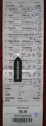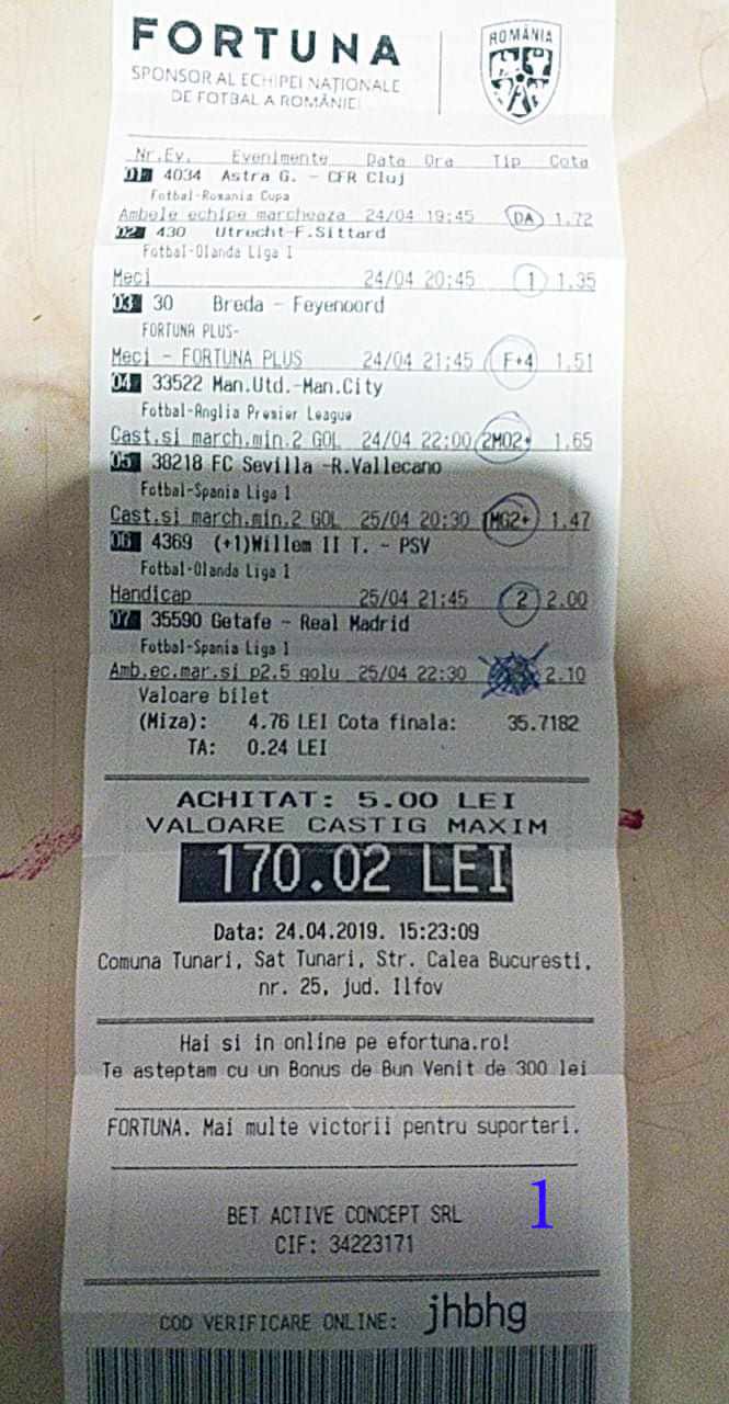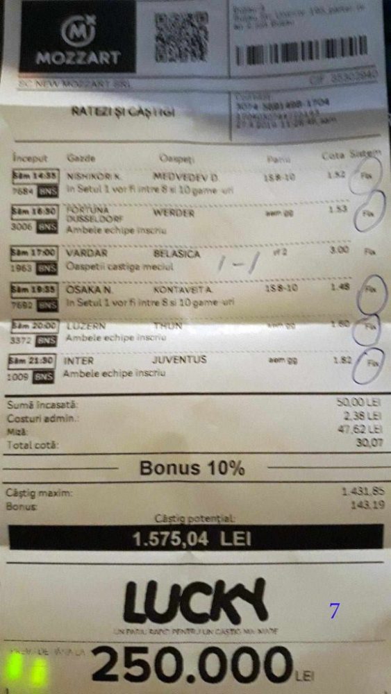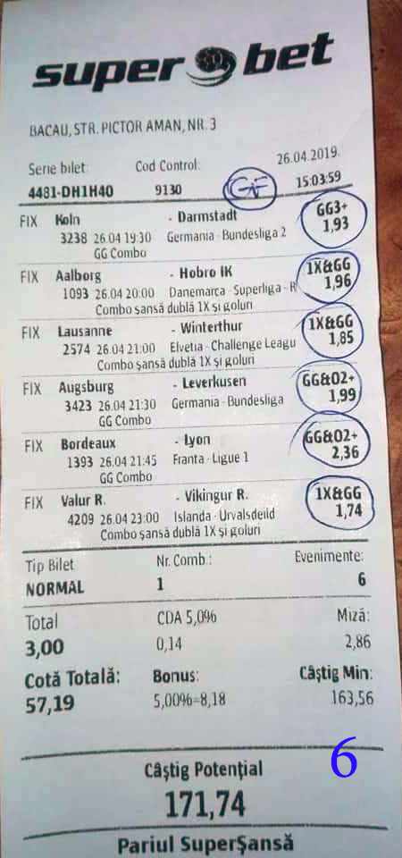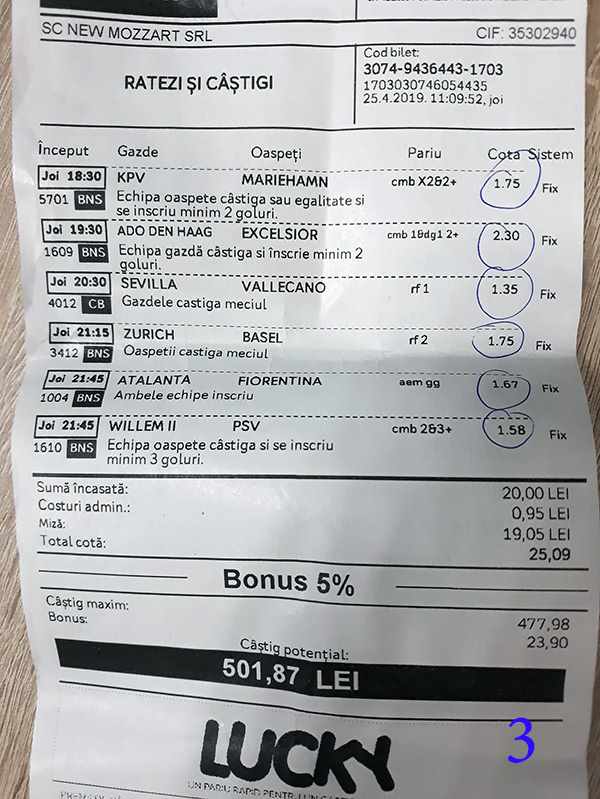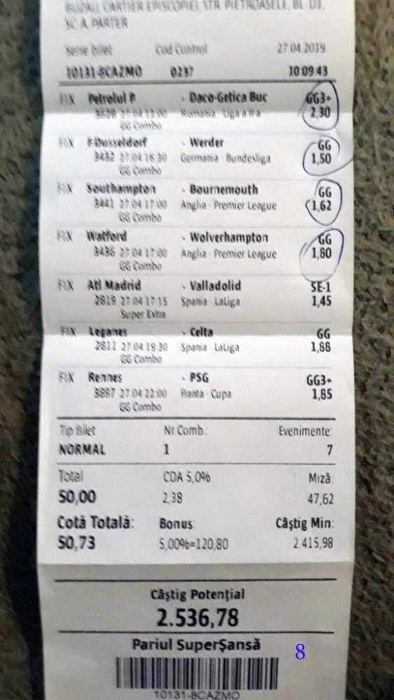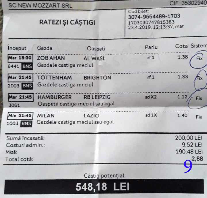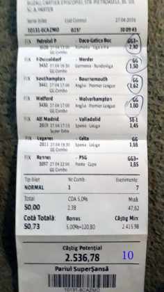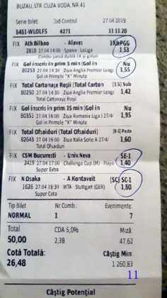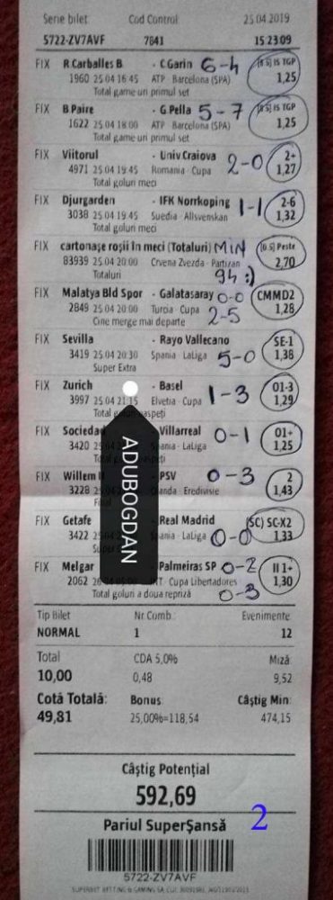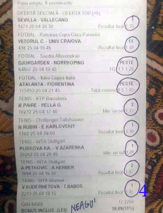 Galeria foto cu biletele selectate din cele vreo 200 primite în ultimele zile e un pic mai bogata decât data trecută.  Îmi cer scuze (a câta oară?) că sunt un bou și uit să notez cine îmi trimite pozele! La unele am scris clar, o să vedeți, la altele, vai de capul meu… Hai la treabă, începem cu foto nr. 1, un bilet de miercuri seara, autor necunoscut cel puțin pentru mine, excelent conceput, cu cote medii, dar corecte, însă pierdut din cauza acelui nenorocit de 0-0 de la Getafe – Real. Al doilea e al lui ADUBOGDAN și e unul din biletele pe care se pot preda cursuri de pariere, deci nota 10. La fel biletul nr. 3, Dumnezeule mare! Postat de Ion Frizerul de lângă Piața Mare, conține meciurile la care ne-am gândit cu toții, dar pe care le-am jucat altfel. Jos pălăria, fratello! Continuăm pe aceeași linie cu biletul 4, meciuri ușoare, simple, cote mici și medii, totul verde de sus până jos, autorul este Neagu în fata căruia îmi exprim tot respectul! Vine iar o gafă făcută de mine că am pierdut autorul, dar biletul nr. 5 a fost lovit de apatia Realului de care vorbeam și mai sus. Dar uitați-vă la ce soliști perfecți a ales anonimul nostru: Viitorul, Vitoria (fotbal feminin brazilian), Villareal sau Atalanta. 6200 au rămas în contul casei de pariuri și mă oftic și eu la fel ca omul cu biletul! Unchiul Florin Ghelbere e tăticul biletului cu nr. 6, el îl numește “Specialul”, iar eu zic că trebuie chiar să gândești în mod special jocul cu banii ca să ajungi la concluzia că acest bilet nu poate fi altfel decât câștigător! Incredibil! Bravo Unkiule! Urmează trei bilete jucate de subsemnatul și pierdute fiecare la câte un meci. La 7 am făcut greșeala să “agăț” un pont care circula cu zor sâmbăta de dimineață, de prin Macedonia, cu Vardar care ar fi trebuit să cedeze jocul cu Belasica disperată să nu retrogradeze. Pe lângă acel meci de 2 lei am plasat și meciurile mele sigure și, binenteles, au ieșit doar ale mele! Apoi, la 8, joc numai meciuri și variante grele, dar cu o mare doză de încredere, duc totul fară emoții până la penultimul joc și deja ieșeam din casă cu 1000 în buzunar să mă pregătesc de contră la meciul lui PSG. N-a mai fost nevoie pentru că la periferia Madridului scorul a fost 0-0. Păcat de celelalte meciuri, doar cote mari, frumoase și inspirate! Biletul cu nr. 9 l-am ratat din cauza panaramelor de la Milan care n-au fost în stare să țină de un 1X nenorocit în semifinala de cupă contra lui Lazio. Foto nr. 10 aduce un alt bilet de nota 10. Postat de Golan HD, ne arată ce înseamnă să fii inspirat , deși biletul e lung, are 12 evenimente, dar cotele nu sunt inimaginabil de mari și de grele, iar norocul a jucat și el rolul lui în colorarea lui cu verdele victoriei. Bun, foarte bun! Penultimul bilet al zilei (foto 11) este al meu, victorios sâmbătă seară, cu o grămadă de evenimente speciale, bine intuite, fară absolul nici-o emoție la vreunul dintre ele, iar cu bănuții, nu mulți ce-i drept, la mine în portofel. Ajung acum la ultimul bilet, îl vedeți în foto nr. 12, 13 și 14 pentru că nu îl am pe hîrtie, ci e alcătuit din 3 screenshot-uri. Eu nu am văzut în viața mea așa ceva până acum, jur! E vorba de toată etapa din liga a 2-a japoneză jucată PSF X și, așa cum deja bănuiți, verde toată băi, oameni buni. Autorul e un coleg al nepotului meu Bogdan, nu vrea să-i spunem numele. Dar ce naiba să mai spui când vezi asemenea minunăție, cu 20 de lei miza a plecat acasă cu 5300! Gata, mă doare capul! Trec acum la tradiționalul Sărbători fericite cu ocazia Paștelui, plus deja obișnuita formulă de încheiere PE EI, PE MAMA LOR!