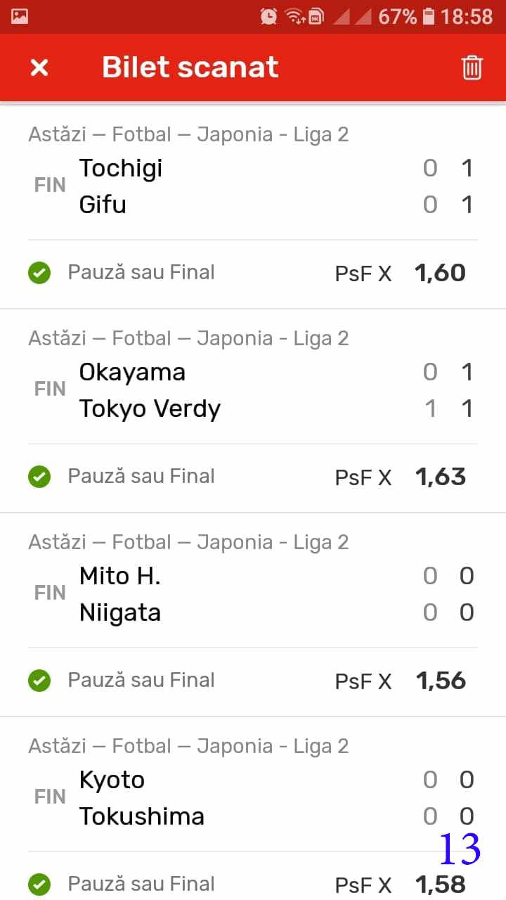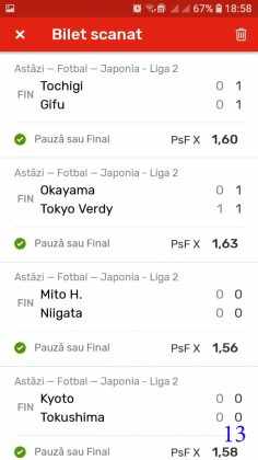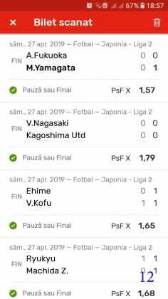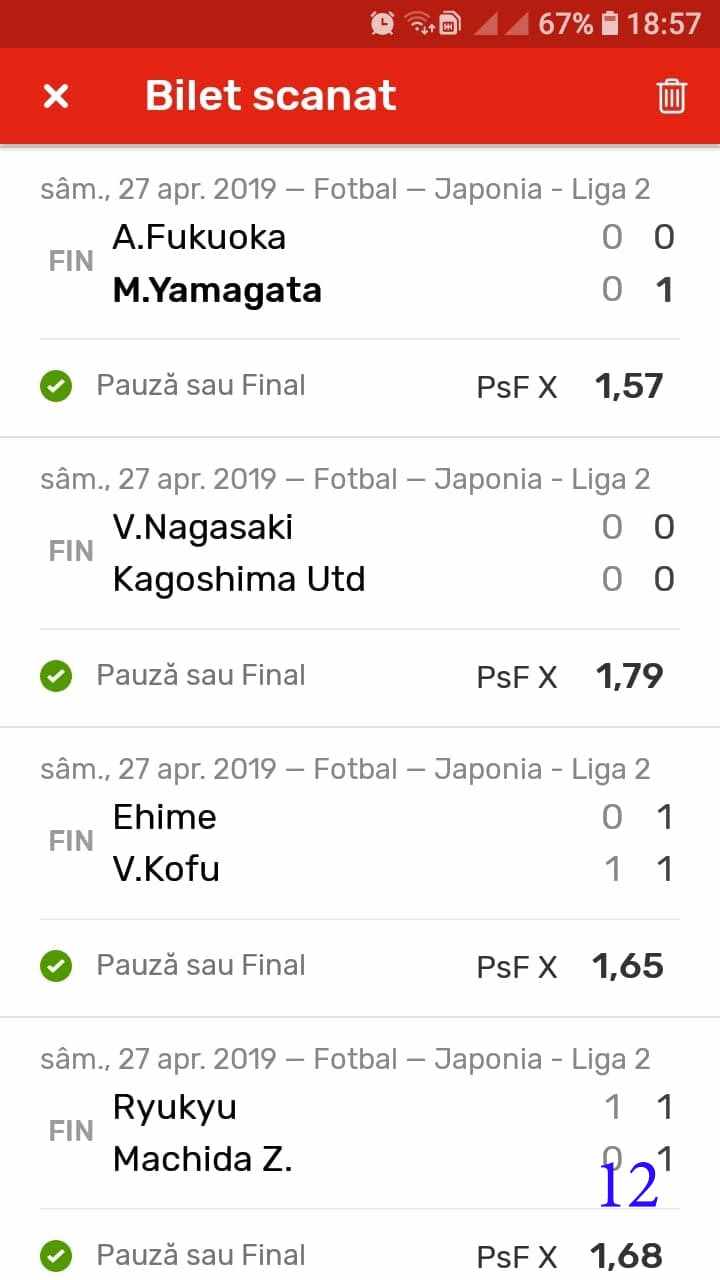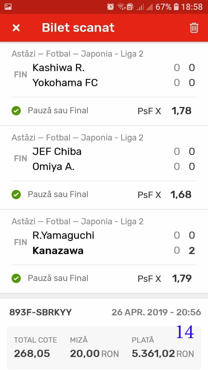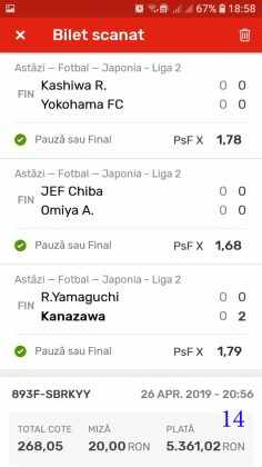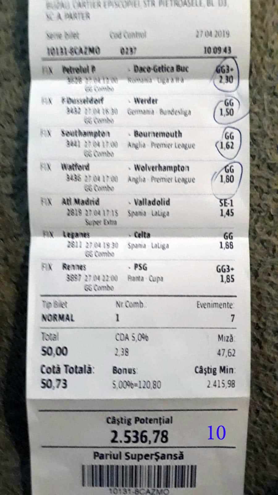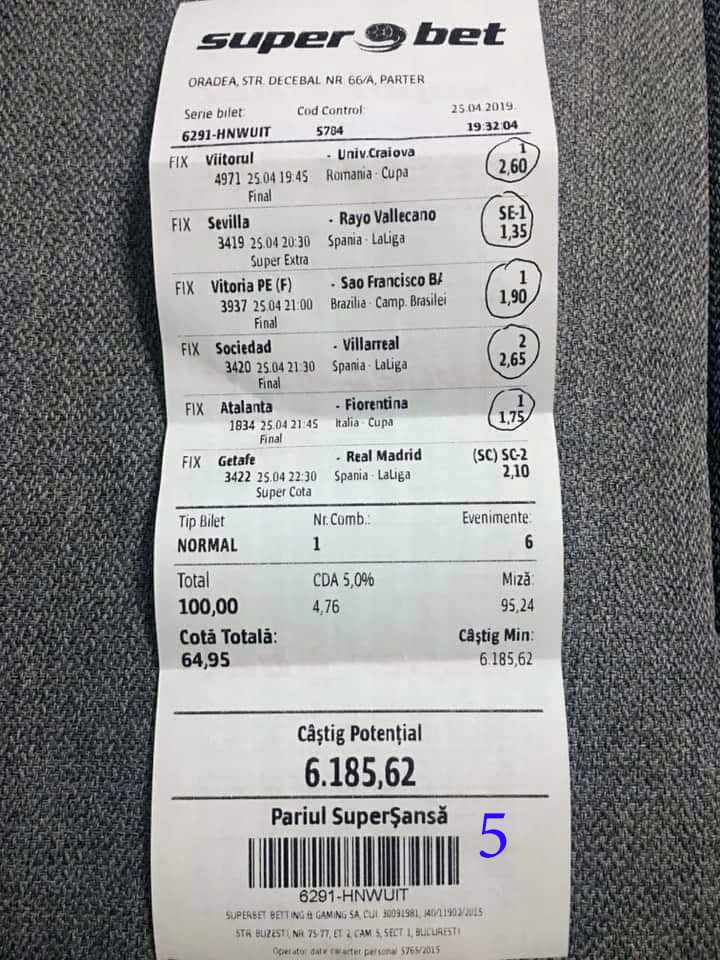 Galeria foto cu biletele selectate din cele vreo 200 primite în ultimele zile e un pic mai bogata decât data trecută.  Îmi cer scuze (a câta oară?) că sunt un bou și uit să notez cine îmi trimite pozele! La unele am scris clar, o să vedeți, la altele, vai de capul meu… Hai la treabă, începem cu foto nr. 1, un bilet de miercuri seara, autor necunoscut cel puțin pentru mine, excelent conceput, cu cote medii, dar corecte, însă pierdut din cauza acelui nenorocit de 0-0 de la Getafe – Real. Al doilea e al lui ADUBOGDAN și e unul din biletele pe care se pot preda cursuri de pariere, deci nota 10. La fel biletul nr. 3, Dumnezeule mare! Postat de Ion Frizerul de lângă Piața Mare, conține meciurile la care ne-am gândit cu toții, dar pe care le-am jucat altfel. Jos pălăria, fratello! Continuăm pe aceeași linie cu biletul 4, meciuri ușoare, simple, cote mici și medii, totul verde de sus până jos, autorul este Neagu în fata căruia îmi exprim tot respectul! Vine iar o gafă făcută de mine că am pierdut autorul, dar biletul nr. 5 a fost lovit de apatia Realului de care vorbeam și mai sus. Dar uitați-vă la ce soliști perfecți a ales anonimul nostru: Viitorul, Vitoria (fotbal feminin brazilian), Villareal sau Atalanta. 6200 au rămas în contul casei de pariuri și mă oftic și eu la fel ca omul cu biletul! Unchiul Florin Ghelbere e tăticul biletului cu nr. 6, el îl numește “Specialul”, iar eu zic că trebuie chiar să gândești în mod special jocul cu banii ca să ajungi la concluzia că acest bilet nu poate fi altfel decât câștigător! Incredibil! Bravo Unkiule! Urmează trei bilete jucate de subsemnatul și pierdute fiecare la câte un meci. La 7 am făcut greșeala să “agăț” un pont care circula cu zor sâmbăta de dimineață, de prin Macedonia, cu Vardar care ar fi trebuit să cedeze jocul cu Belasica disperată să nu retrogradeze. Pe lângă acel meci de 2 lei am plasat și meciurile mele sigure și, binenteles, au ieșit doar ale mele! Apoi, la 8, joc numai meciuri și variante grele, dar cu o mare doză de încredere, duc totul fară emoții până la penultimul joc și deja ieșeam din casă cu 1000 în buzunar să mă pregătesc de contră la meciul lui PSG. N-a mai fost nevoie pentru că la periferia Madridului scorul a fost 0-0. Păcat de celelalte meciuri, doar cote mari, frumoase și inspirate! Biletul cu nr. 9 l-am ratat din cauza panaramelor de la Milan care n-au fost în stare să țină de un 1X nenorocit în semifinala de cupă contra lui Lazio. Foto nr. 10 aduce un alt bilet de nota 10. Postat de Golan HD, ne arată ce înseamnă să fii inspirat , deși biletul e lung, are 12 evenimente, dar cotele nu sunt inimaginabil de mari și de grele, iar norocul a jucat și el rolul lui în colorarea lui cu verdele victoriei. Bun, foarte bun! Penultimul bilet al zilei (foto 11) este al meu, victorios sâmbătă seară, cu o grămadă de evenimente speciale, bine intuite, fară absolul nici-o emoție la vreunul dintre ele, iar cu bănuții, nu mulți ce-i drept, la mine în portofel. Ajung acum la ultimul bilet, îl vedeți în foto nr. 12, 13 și 14 pentru că nu îl am pe hîrtie, ci e alcătuit din 3 screenshot-uri. Eu nu am văzut în viața mea așa ceva până acum, jur! E vorba de toată etapa din liga a 2-a japoneză jucată PSF X și, așa cum deja bănuiți, verde toată băi, oameni buni. Autorul e un coleg al nepotului meu Bogdan, nu vrea să-i spunem numele. Dar ce naiba să mai spui când vezi asemenea minunăție, cu 20 de lei miza a plecat acasă cu 5300! Gata, mă doare capul! Trec acum la tradiționalul Sărbători fericite cu ocazia Paștelui, plus deja obișnuita formulă de încheiere PE EI, PE MAMA LOR!