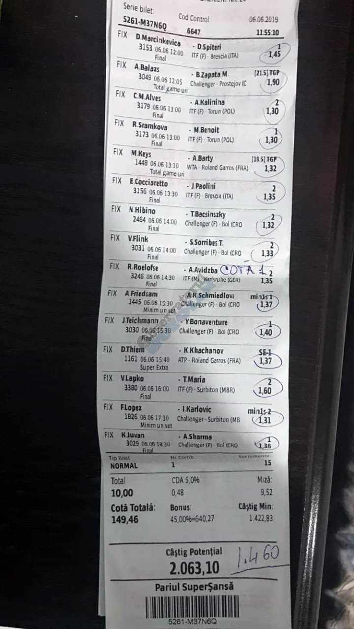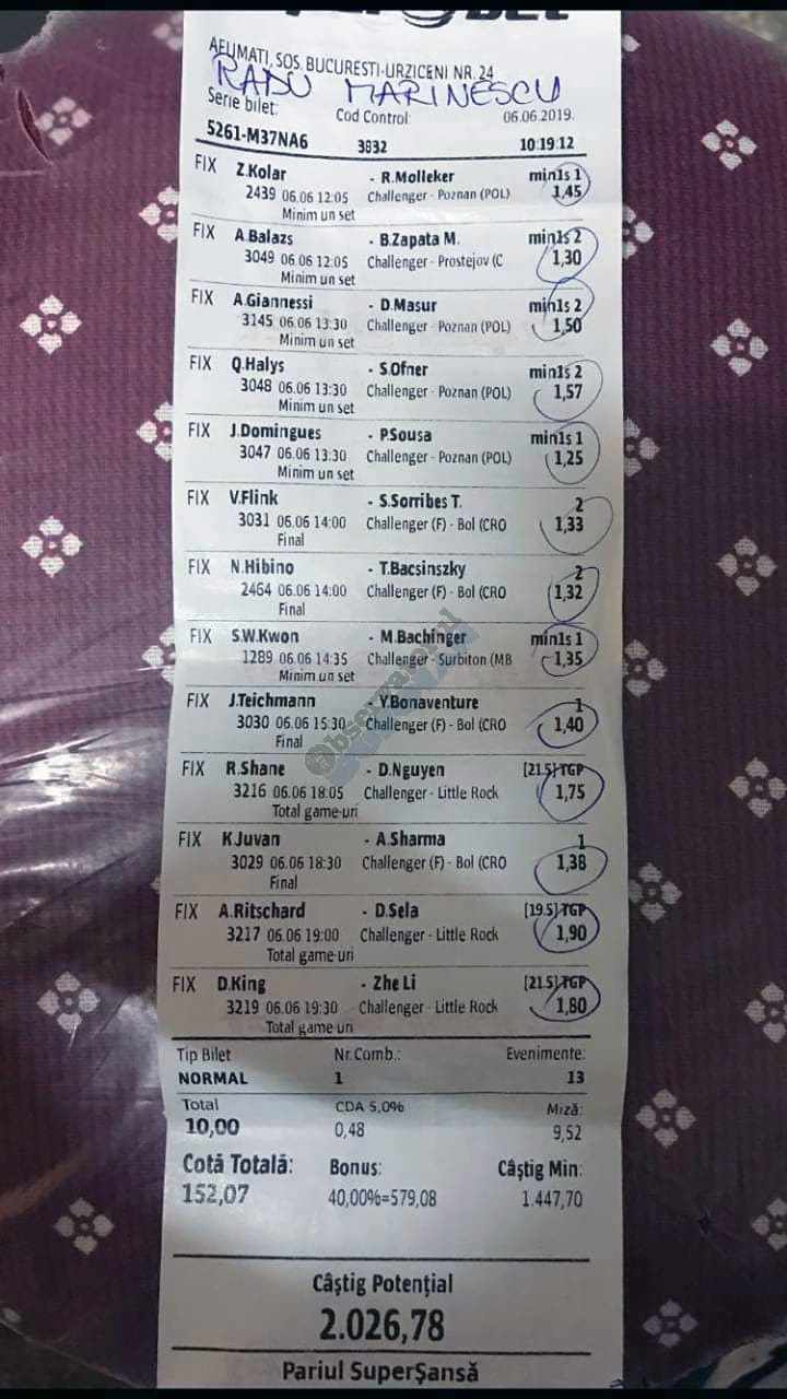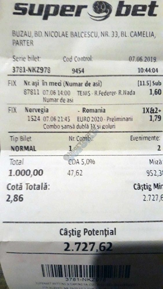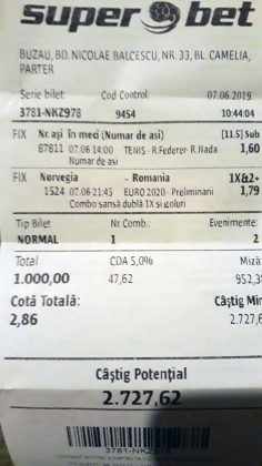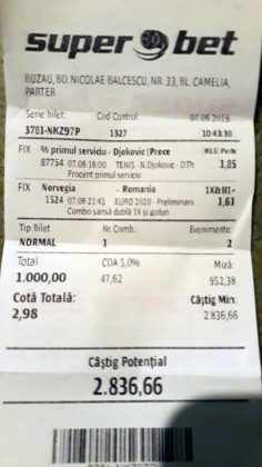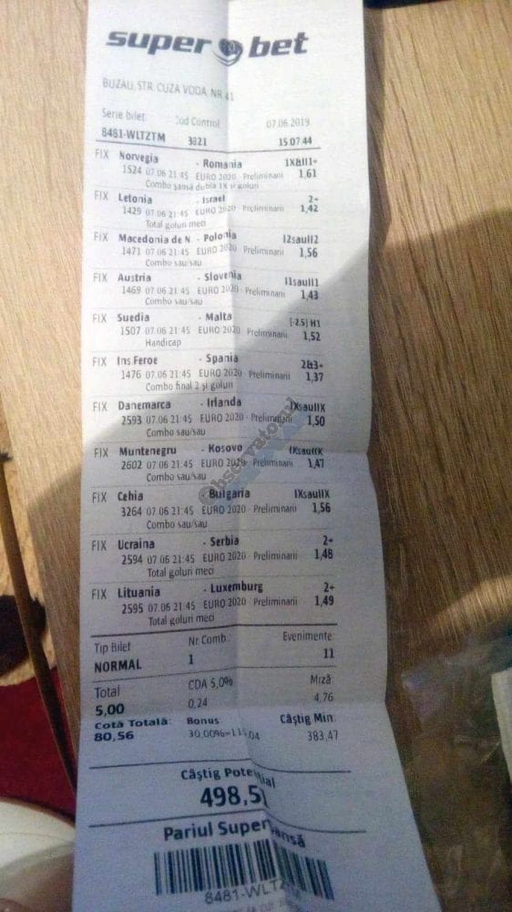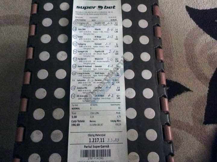 Oameni buni, pentru că e vorba de ultimul episod al sezonului 2018-2019, am pregătit o galerie foto cu bilete de-a dreptul excepționale. Și ca sume câștigate, dar, mai ales, ca maniera de joc. Hai să ne bucuram de ele, dar și pentru cei care au încasat bănuții! Deschidem cu poza nr. 1, un bilet postat de Mihai Petre, care tocmai ce ne spunea că a revenit în business după câteva săptămâni de pauză. Și a revenit cu succes, urmăriți codul de Superbet ca să vedeți inspirație la bătrân. Apoi, cu foto nr. 2 vine prietenul nostru Alin Ticu postând biletul unui văr ce lucrează pe un vas de croazieră și care s-a riscat să joace 1000 de euro pe victoria Salernitanei în turul barajului de rămânere în Serie B. 2-1 a fost scorul, dar în prelungirile meciului Venezia a ratat egalarea din fața porții adverse și doar parada incredibilă a portarului ciociarilor a făcut ca cei peste 2000 de euroi să se lăfăie în portofica pariorului curajos! Alt curajos este Chiriță Lupul Singuratic. Și el joacă 1000 de euro pe biletele nr. 3 și 4, este absolut sigur de victoria lui Liverpool în finala Ligii, și își dublează banii. Simplu și elegant. Ira Irinel, posesorul biletului nr. 5 m-a lăsat fără aer pentru câteva secunde. A pariat 1500 de lire pe trei evenimente din același meci al lui Liverpool, victoria cormoranilor, total goluri și cornerele lui Spurs, iar câștigul e de toată lauda, aproape 4300 de sterline! Și Mihai Banditu cu biletul nr. 6 merge pe mâna băieților lui Klopp și își trece și el în cont o amintire frumoasă după meciul de la Madrid, și-a dublat cele 500 de lire pariate. Biletul nr. 7 e al unui ghinionist, nu se putea să nu avem și așa ceva! Nache Laurențiu e numele lui și pierde un singur eveniment din 11, dar în ce mod! Joacă “gol în ambele reprize” la amicalul Columbiei, ăștia dau 3 goluri în prima parte și uită s-o mai facă în cea de-a doua. Iar 1200 de lei se transformă în doar 20, din păcate! Acum îl avem drept oaspete pe unul dintre cei mai inspirați pariori pe care i-am văzut în viața mea, Radu Marinescu. El ne arată în biletele nr. 8 și 13 ce înseamnă să simți tot felul de chestii din meciuri mai mult sau mai puțin importante din lumea tenisului, iar din partea mea are tot respectul! Un alt musafir cu nume este Cucu Rareș, iar de la el avem biletele cu nr. 9 și 11. Nu mi-a venit să cred ce idei spectaculoase a avut omul ăsta, deși era în vacanța prin Spania (el locuind în Newbury, Anglia)! Că Elveția și Anglia vor marca din penalty pe primul, iar în al doilea joacă niște ponturi pescuite de pe Youtube (pe care eu le-am considerat riscante! Dar ce dracu’ mă pricep eu?) și adună în portofel aprox. 600 de lire. I-aș zice “Jos pălăria” pe engleză, dar nu vreau să mă fac de râs din cauza accentului… Biletul nr. 10 este al lui Laur Balauru, excepțional alcătuit, dar lovit de ghinion la meciul din Muntenegru pe care l-a văzut “X în oricare dintre reprize”. Să fac eu pe deșteptul acum și să-i zic că mergea PSF-ul? N-are rost, eu am jucat GG. În poza nr. 12 avem biletul lui George Tudorache, un alt parior inspirat în prima zi de preliminarii pentru EURO 2020. Joacă 11 meciuri, cred că toate din ziua aia dacă nu mă înșel, și le face verzi fără absolut nici-o emoție, erau câștigătoare încă de prin min. 70-75. Tot vineri seara joaca și amicul Valentino Altobello două bilete incredibile, cele cu nr. 14 și 15, la care contribui și eu cu bani și o idee (furată de la Laur Balauru) și din 2000 pariați face 5500. Mai e ceva de comentat? Iar încheierea o facem cu biletul nr. 16, postat de Robert Irimia, tot cu cele 11 meciuri de vineri, câștigătoare, dar pariate sub alte forme și chiar dacă suma nu e fantastică (vreo 800 de lei), cota de 400+ reușită ar trebui să-i facă geloși/ambițioși pe mulți dintre oamenii care se vântură aiurea prin spațiul online!