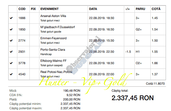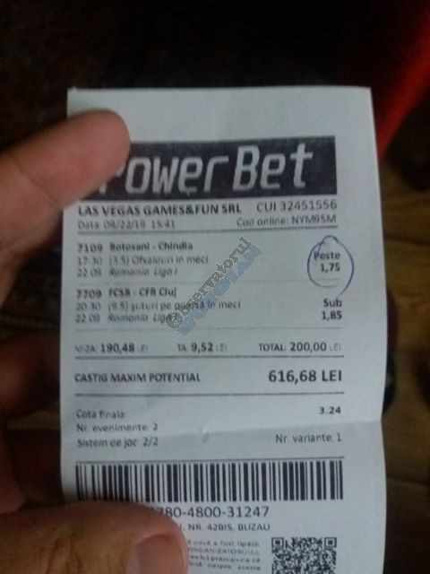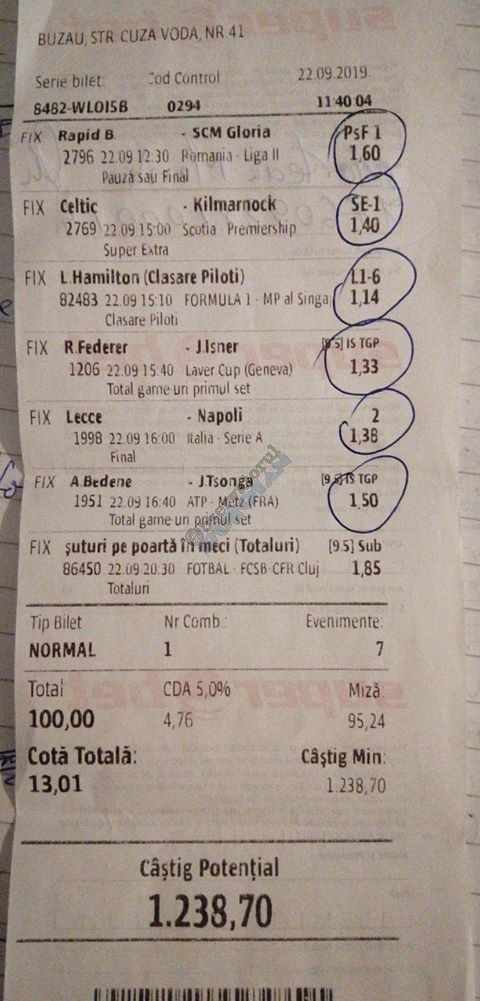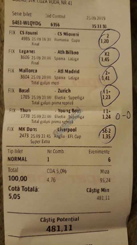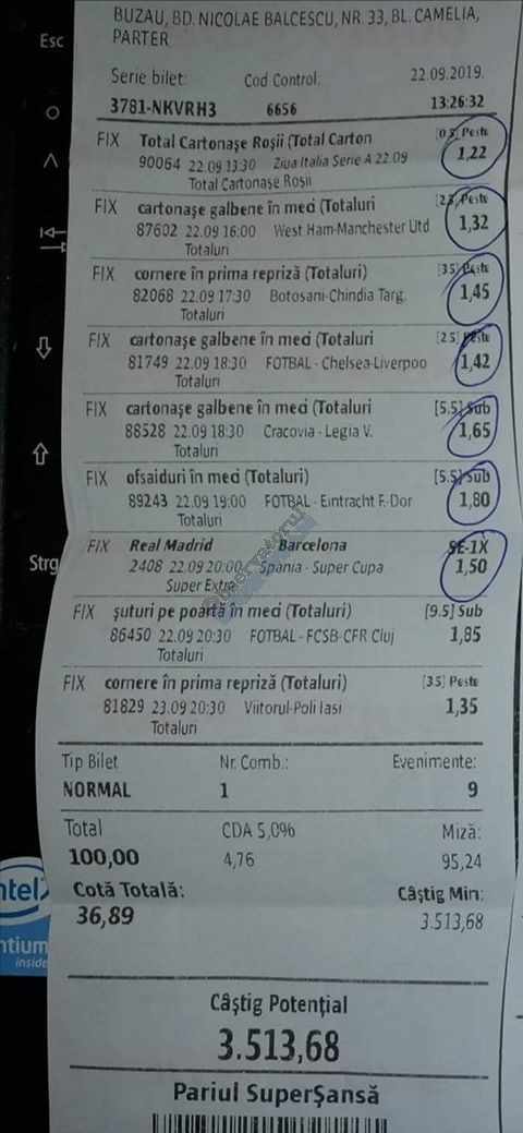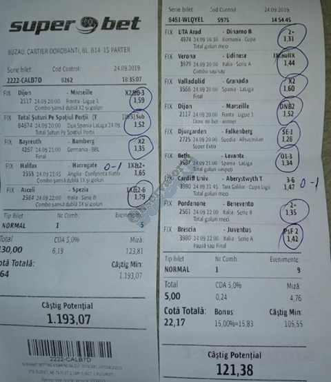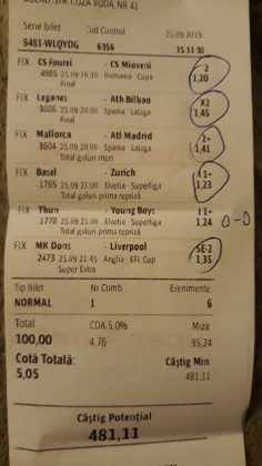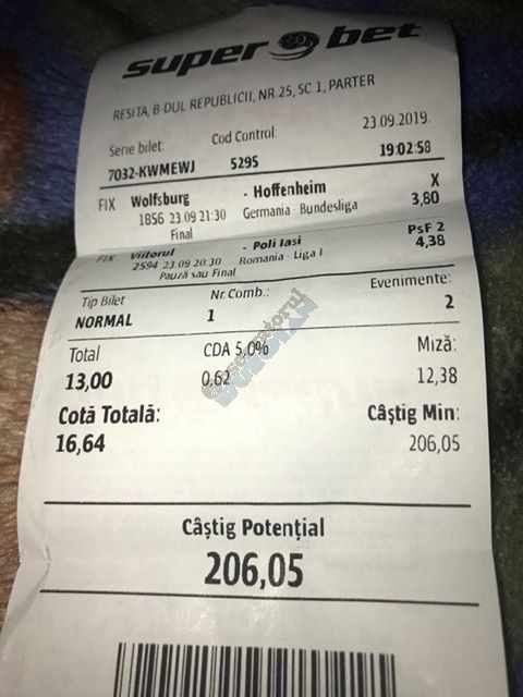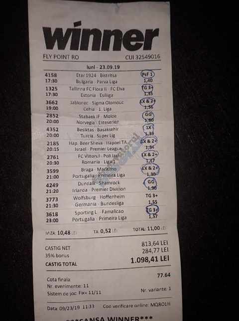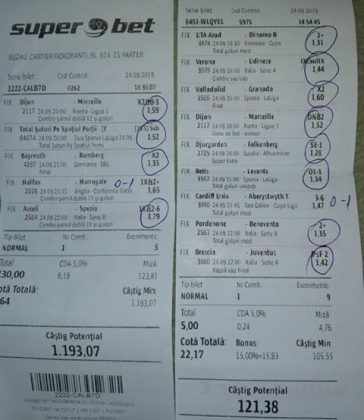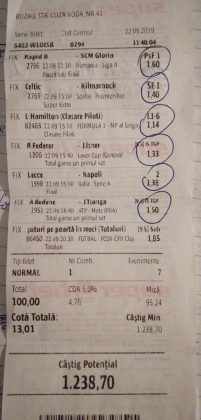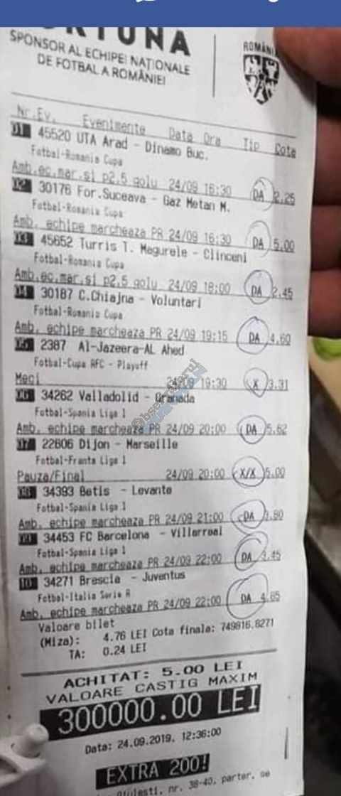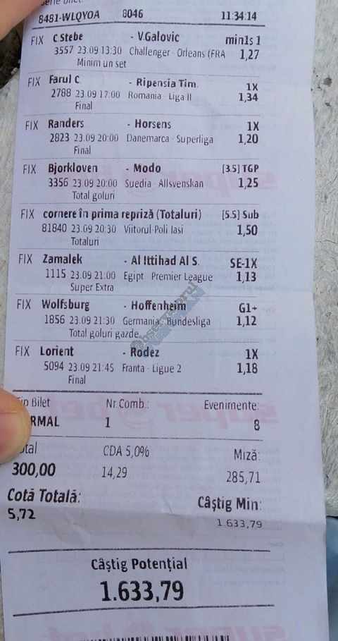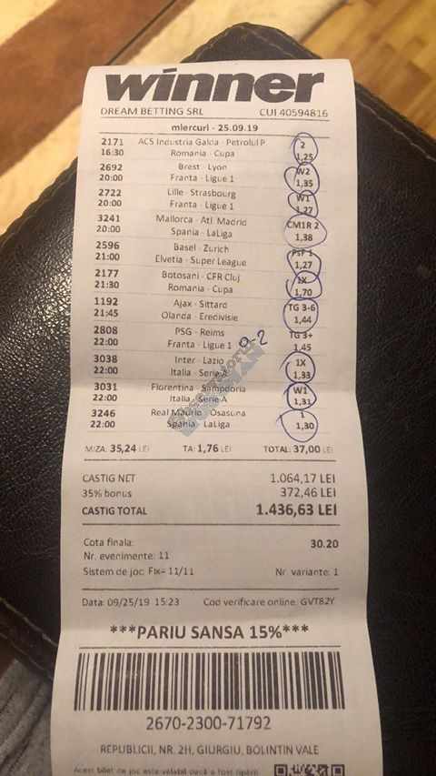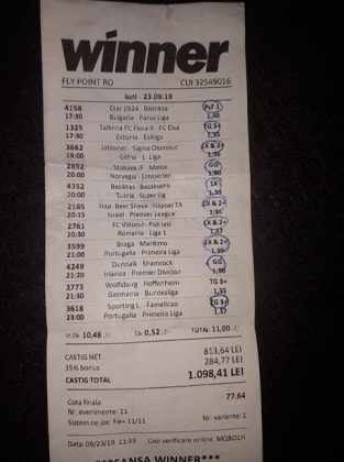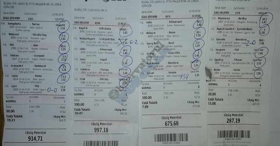 Galeria foto de astăzi nu este foarte voluminoasă ca și număr de bilete, dar este, cu siguranță, cea mai valoroasă ca și bani încasați de oamenii care postează biletele în spațiul virtual! Hai să începem cu un parior care a ținut capul de afiș și în numărul trecut al ziarului nostru, tot prima poziție în topul cronologic a ținut-o și atunci. Este reșițeanul Claudiu Crișan, cu care vorbeam luni seară, atunci când eu eram la un pas să fac verzi primele două bilete ale săptămânii, despre intuiția criminală pe care a avut-o să joace psf 2 la Viitorul contra Iașiului, ori acel X solist la Wolfsburg. Mi-a răspuns că acei 13 lei erau tot bugetul de pariuri pentru acea zi, căci dacă ar fi avut 100 de jucat, pe toți i-ar fi pus pe mâna moldovenilor! Și trecem acum la sume mai atractive, fără a minimaliza cumva meritele celor care joacă cu cap, metodic, disciplinat bani mai putini decât ce-o să vedeți în continuare. Urmează trei bilete consecutive ale subsemnatului (foto 2,3 și 4), câștigate relativ ușor după o serie începută vineri seara și oprită exact unde o vedeți, la biletul de 1600. Pentru că marți și miercuri am ratat niște chestii pe care o să vi ke arăt un pic mai încolo. Și m-am dus iar la două zile proaste… Vă scot din atmosfera biletelor-șampanie încasate de mine la începutul acestei săptămâni și v-il prezint pe cel cu nr. 5 jucat de Vali GG, un specialist în “speciale” cu care m-am consulat și eu la biletul de 3500, de fapt două evenimente pe care le discutasem duminică la prânz la cafea și pe care el s-a hotărât să le joace și într-o variantă mai simplă decât “combo”-ul acela lung, dar pe o sumă mai mare decât suta obișnuită. La Botoșani au fost vreo 7 ofsaiduri, iar în meciul de seară, fără nici-o contră, doar 5 șuturi amărâte, deci VERDE! Al 6-lea bilet vine de la Sebastian Gentile, deja un obișnuit în online, în lumea pariorilor, dar egalul de la Wolfsburg care l-a făcut fericit pe Claudiu (foto 1) l-a privat pe el de 1000 de lei în portofel! Pentru că tot suntem la pagube, iată în poza nr. 7 nu mai puțin de patru bilete ratate de subsemnatul în weekendul trecut la mare artă! Ba la un gol, ba la nu știu ce meci aiurea, ba pe dreaqu să-i cânte… Să uit de ratări, vă aduc în prim-plan biletul nr. 8, iar autorul e Valentin Hunter, unul dintre profesioniștii din lumea bettingului. Din 200 și-o cotă 12 ies vreo 2300, numai buni de plănuit lovituri decisive caselor de pariuri pentru tot restul săptămânii! Înainte de marele bilet, cunoscut deja tuturor jucătorilor români, iată încă două gherle de marți seară (foto nr. 9), cea cu cele trei ceasurile rele și cu tot atâtea goluri lipsă pe biletele portughezului repatriat Marian Uno. Și cum mai mereu am ținut la rece, pentru poziția cu nr. 10, un bilet de super-clasă, hai să ne delectăm privirile (a câta oară?) cu ce a putut scoate din minte un bucureștean anonim și biletul său de la o agenție situată în cartierul Giulești! Meciuri din aceeași seară de marți, din toate competițiile și continentele (cupe, campionate, lumea arabă, Europa…) pe care pariorul, proaspăt câștigător al fabuloasei sume de 3 miliarde, le-a plasat fără prea mare chef. Pentru că dacă ar fi fost vorba de ceva calculat, gândit, analizat, atunci ar fi plasat mai puține evenimente, 8 de exemplu, și tot același succes l-ar fi avut, pentru că el atinsese deja plafonul maxim de câștig stabilit de agenția respectivă! Sau ar fi jucat aceleași meciuri, dar pe sume mai mici, 2 lei de exemplu, și ar fi făcut vreo 3 bilete identice, iar suma rămânea aceeași însă multiplicată cu numărul de bilete plasate! Ce s-o mai lungim, norocul, Dumnezeu sau ghiavulu au pus palma peste capul lui, s-au dat goluri fenomenale (Cazorla de la Villareal!!!) în minutele de final ale primelor reprize de la Valladolid, Barcelona și Brescia, iar suma aceea imensă cu enervant de multe zerouri îi tronează acum pe masa din bucătărie pentru selfi-urile de rigoare. Bravo frate, i-ai spart! Așa cum comentam și în mediul virtual miercuri dimineață, eu n-aș fi pus pe un asemenea bilet nici măcar leul pe care îl bag câteodată într-un aparat de cafea, era de SF mai SF decât SF-urile!!! Doar că s-a făcut verde, iar bomba detonată în casieria furtuniștilor e una monumentală! Aș fi vrut să închei aici, doar că miercuri, cu puțin înainte să trimit scriptul către redacție, au mai apărut încă trei bilete. Cel cu nr. 11 vine de la Belgrad, iar autorul e Takir Copic, prieten bun al redacției noastre. Cum o fi reușit să evite nenorocirile produse de Napoli, PSG, West Ham, Man Utd ori Benfica, numai el știe… Pentru că la poziția a 12-a vedem biletul lui Alin Ticu, care n-a jucat pe victoria parizienilor, dar nici nu s-au marcat trei goluri în meci care să-i aducă bănuții (puțin peste 1400) în portofel. Iar pentru că ghinionul se oprește întotdeauna la nr. 13, iată cum mă blochez eu, a doua seară consecutiv, într-un mare 0-0 la pauză! Marți în Cupa Austriei, miercuri în Elveția. Iar de joi trebuie să dublez miza și să mai scad un pic cota, undeva spre trei, să jucăm la recuperare…