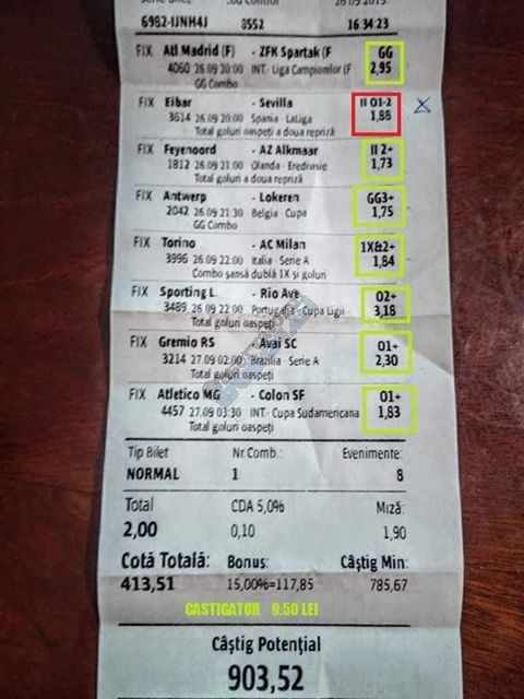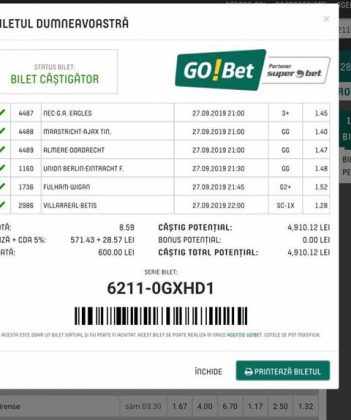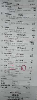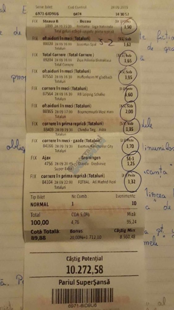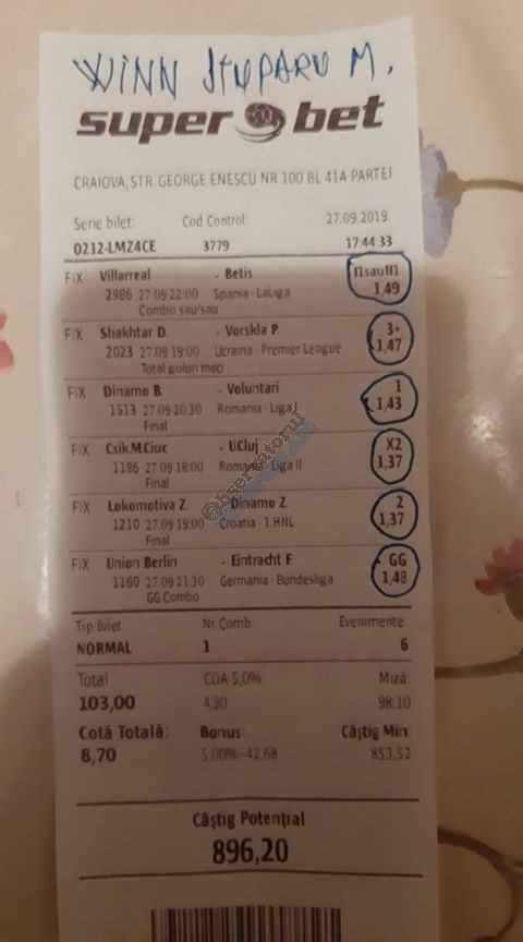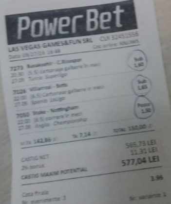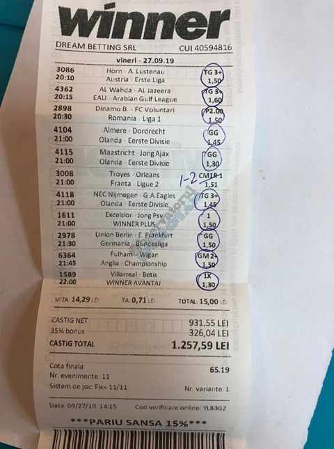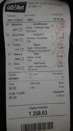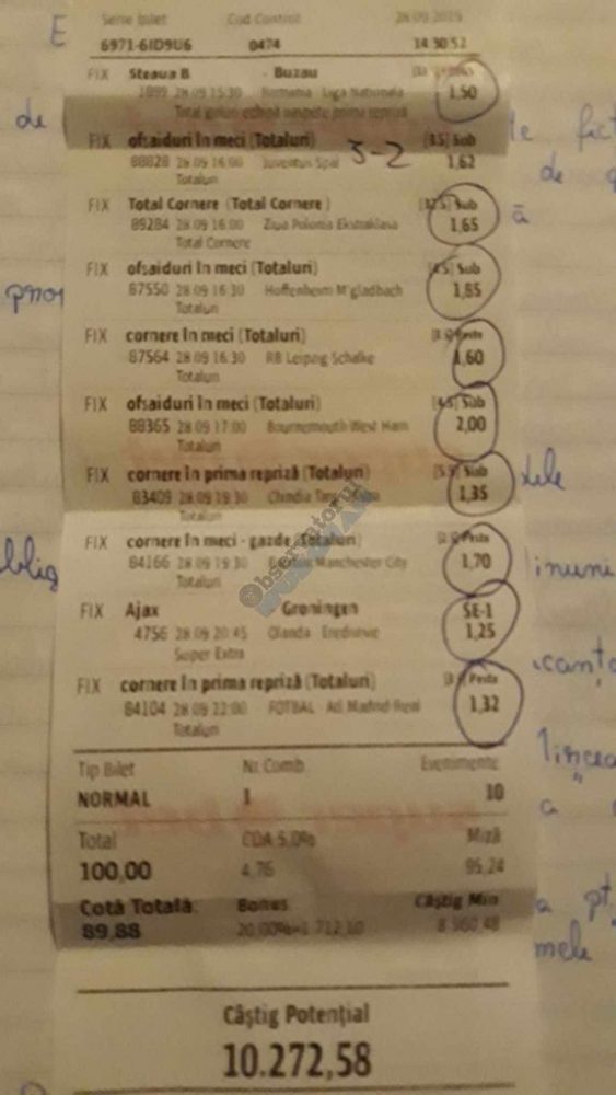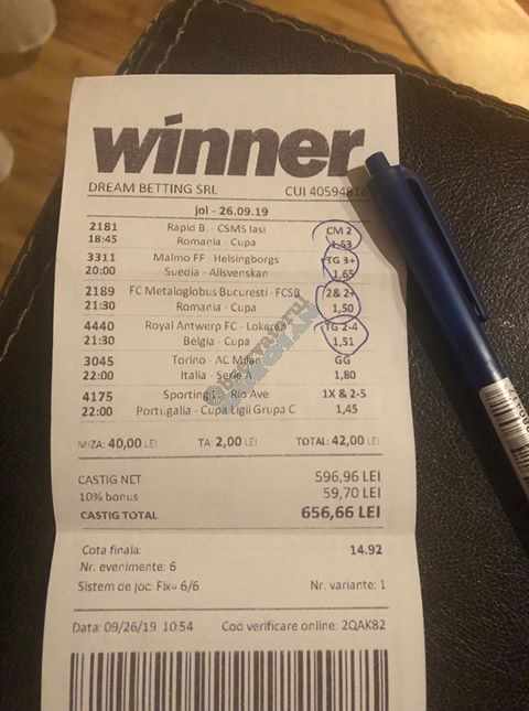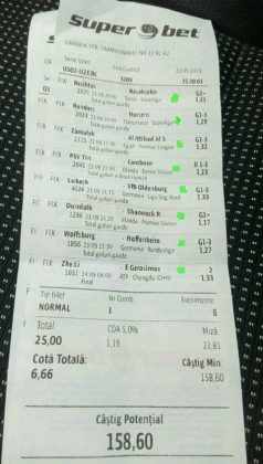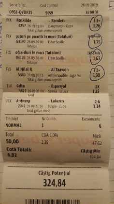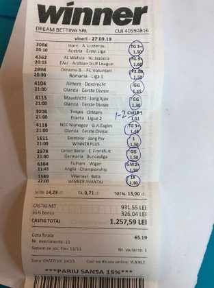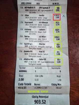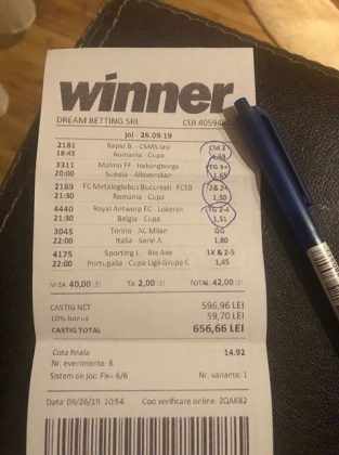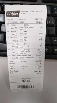 Galeria foto de astăzi este foarte voluminoasă ca și număr de bilete, dar este, cu siguranță, și foarte valoroasă dacă discutăm de banii încasați de oamenii ce postează biletele în spațiul virtual! Hai să începem (foto nr. 1) cu un parior foarte bun, dar care uneori pleacă cu valul unui meci anticipat de toată planeta, dar care sfârșește într-un cine știe ce nenorocit de rezultat… Este vorba de Lucian Burdea din Oradea, iar biletul lui este o simfonie a golurilor marcate de gazde, cu două mici excepții, dar atât de simplu pare atunci când se face verde!!! Doar că m-a luat cu frisoane când am văzut cota finală… Biletul cu nr. 2 este al campionului de la concursul în “Cotă 2”, Valentin Hunter, dar la el să facă o cota 10-12 cam de două ori pe săptămână pare să fie deja obișnuință. Tot de o simplitate dezarmantă este și biletul cu nr. 3, al bucureșteanului Petruș Mitu. Șase evenimente de joi seară, cu bombițele de la Eibar și Torino driblate ca Messi în zilele lui bune, iar cota 5 îi transformă cei 86 pariați în patru hârtii de-o sută! Tot joi seara mai apar câteva tichete interesante, iată-l pe cel jucat de Alin Ticu (foto nr. 4) și ratat la mare artă de a doua prostie consecutivă făcută de Sporting Lisabona pe teren propriu, după acel 1-2 contra lui Famalicao din ultima etapă de campionat! Apoi, la nr. 5, e un bilet jucat de subsemnatul chiar înainte să intru pe stadion la Rapid – Poli Iași. Avusesem pe el și victoria Viitorului la Cluj, dar se pare că acea cotă de 15 pentru 1/1 a fost mai tentantă pentru constănțeni decât o calificare în cupa fără glorie… L-am repetat, m-am trezit că nu mai am decât câteva zeci de lei în portofel, așa că a trebuit să mă mulțumesc cu cei vreo 300 câștig, dar numai după ce băieții de la Celta Vigo au egalat în min 90+5! Un alt păgubit al serii de joi este Georgescu Gabriel, iar splendoarea de bilet (foto nr. 6) în care a investit doar doi leuți amărâți s-a blocat în faptul că Sevilla n-a mai avut nici-o replică în a doua repriză a meciului de la Eibar. Au condus 2-0 la pauză, la final au pierdut 3-2, dar colegului nostru îi era necesar măcar un gol al nenorociților de elevi ai lui Lopetegui, deja cu un picior în afara stadionului, aproape de a doua demitere consecutivă după cea de la Madrid din startul sezonului trecut. Începe acum o serie de bilete de vineri, iar primul, de fapt al 7-lea din galerie, este al lui Adrian Dumitrescu. Curajos și simplu, acest mini-combo de 5 evenimente i-a deblocat crisparea abia în repriza secundă a meciurilor sale, alese inspirat și cu cote foarte atractive pentru toți pariorii. Iar la urmă s-a ales și cu 1200, bani de cheltuială într-un weekend prin Lugoj, că în Făget nu cred că-s așa mari atracții! Biletul nr. 8 vine din Germania, de la Alin Dulău, care ne predă lecția “cum să faci 100 verde dintr-o monedă de 2 euro”. Foarte inspirat atunci când a văzut peste 1,5 în prima sau că echipele gazdă vor marca minim două goluri! Seria continuă cu biletul nr. 9, postat de Robert Florin din Marea Britanie și minunăția de inspirație cu care a reușit cota de 37 și atragerea spre propriul buzunar a unei sume de 600 și-un pic de sterline! Well done! Acum, pentru că tot vorbim de bilete excelente, hai să-l vedeți la nr. 10 și pe cel de nota 10! Plasat de Alin Ticu, deja un obișnuit al rubricii, în special pentru modul în care e lovit de ghinion/neinspirație, biletul de față ar trebui să ne schimbe percepția despre faptul că încă așteptăm miliardul cu doar 2-3 lei pariați. Omul nostru vine cu un bet de 600 de lei pe o cotă 8+, iar emoțiile l-au ținut tare de tot din scurt până pe finalul meciurilor de la Berlin și Londra, dar la urmă a marcat teritoriul cu 4900! Și tot el este autorul biletului succesiv (nr. 11), ratat din cauza înfrângerii pe teren propriu a celor din Troyes. Avem acum (foto 12) din nou musafiri de la Craiova. E o domnișoară, Iuliana Dida, care croiește un combo perfect împreună cu Mihai Stuparu și din șase evenimente fac din sută mie! Sau p-aproape. Iată-ne ajunși la biletul nr. 13 și, surpriză, nu e unul lovit de ghinion! Jucat de Vali GG, unul dintre puținii profesioniști în “speciale” pe care i-am cunoscut de-a lungul timpului, iată doar o mostră și aici de cum se plasează 150 pe trei evenimente care n-au nimic în comun cu scorul final al partidelor în cauză! Revenim la Alin Ticu din Bolintin Vale, deja la al 4-lea bilet din episodul de față, și mai trecem în catastif încă un verde (foto 14), 900 de lei încasați sâmbătă seară, când chiar îi trebuia o sursă de finanțare pentru nunta la care fusese invitat. Eu le-aș pune în plic chiar biletul câștigător celor doi tineri însurăței… Biletul cu nr. 15 vine de la Buzău, autorul de artă pură fiind Pompiliu Untaru, suporterul înfocat al Gloriei, cea fără drept de promovare și care face o minune de 2/1, parcă special să încaseze colegul nostru un câștig multiplicat cu cota de 28!!! Urmează acum alte două bilete ale subsemnatului (nr. 16 și 17), lucrate telefonic cu același Vali GG menționat un pic mai devreme și care m-au făcut fericit de 8000 și ceva de ori, deși se putea chiar și mai mult decât dublu, dacă Ronaldo singur n-ar fi fost surprins în ofsaid de trei ori în victoria echipei sale contra ferrarezilor de la SPAL! Bun și-așa, ce naiba să zic… Ne apropiem de final, iar la nr. 18 e biletul lui Laur Balaurul, unul dintre amiciI dragi inimii mele. Un bilet pierdut pe meciul celor de la Gent, dar cât ghinion băi frate, gol anulat și două bare, tot ca să nu ia și omul ăsta aproape 800 de lei! Tocmai din țara nemților ne trimite un bilet la fel de păgubos și Nache Laurențiu. La noi chestia asta s-ar fi numit bonus dublu, la ei nu există așa ceva, iar panaramele de la Leeds n-au fost în 