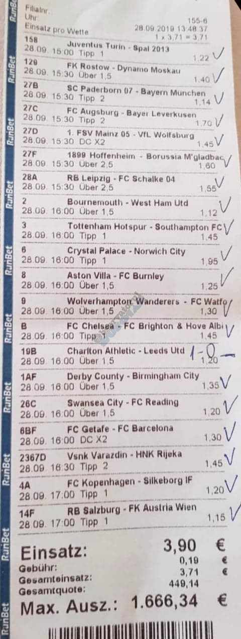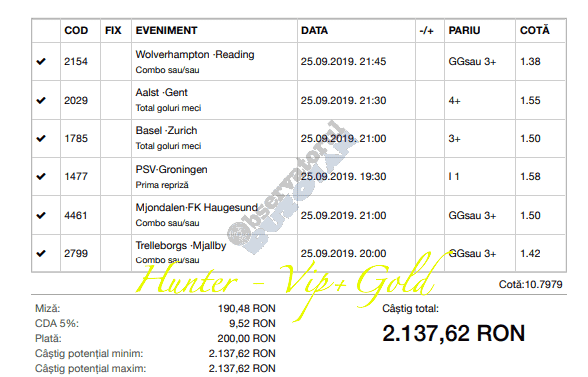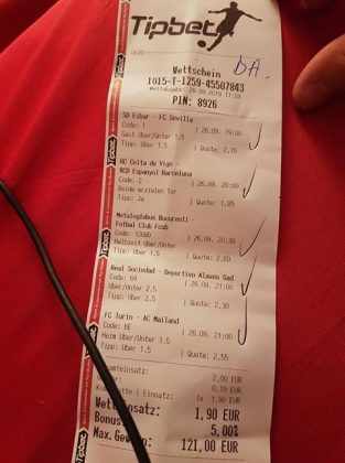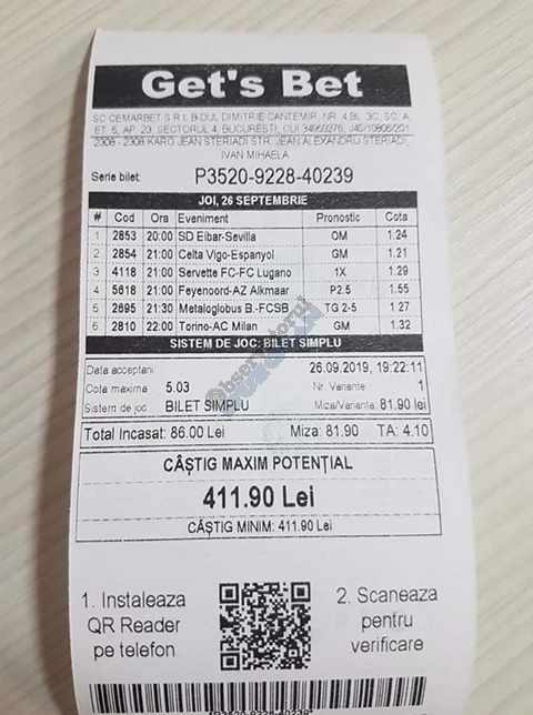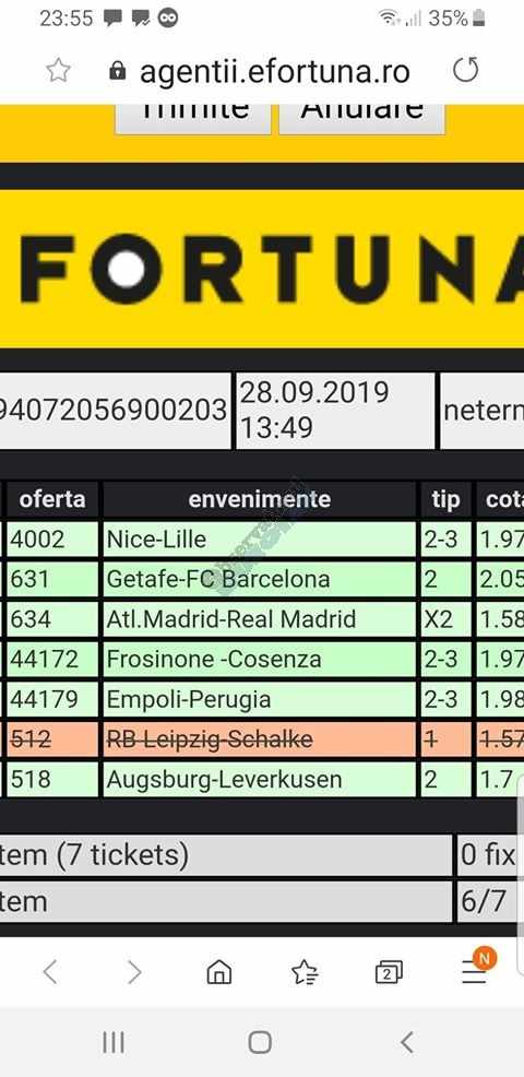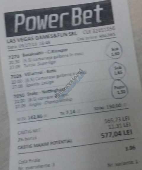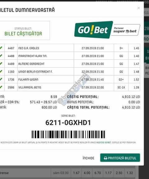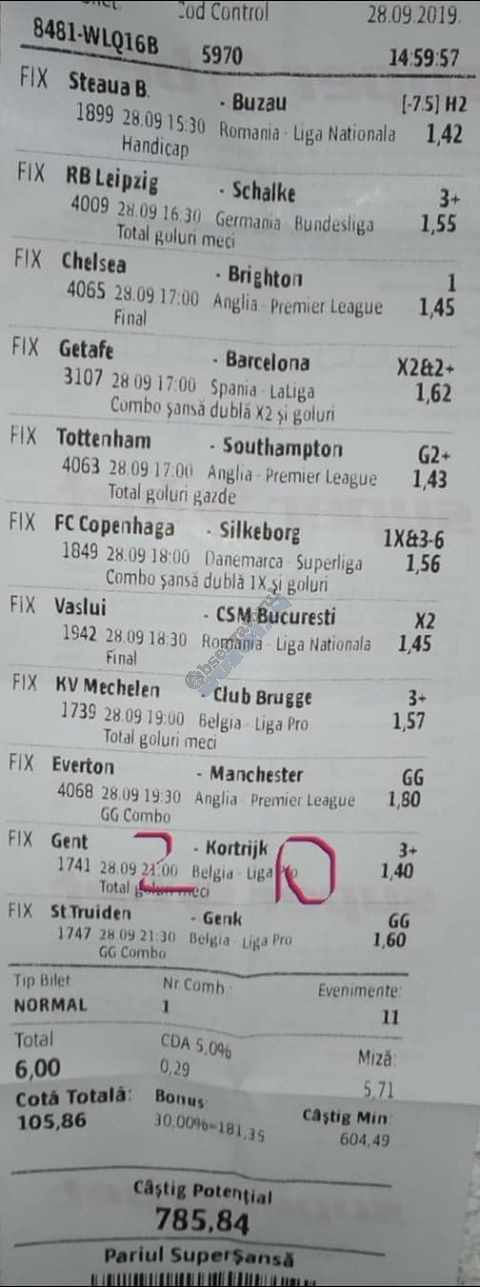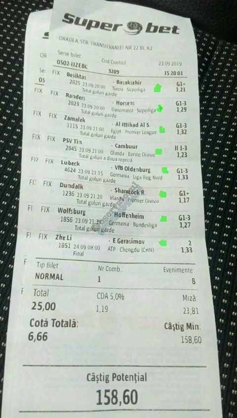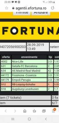 Galeria foto de astăzi este foarte voluminoasă ca și număr de bilete, dar este, cu siguranță, și foarte valoroasă dacă discutăm de banii încasați de oamenii ce postează biletele în spațiul virtual! Hai să începem (foto nr. 1) cu un parior foarte bun, dar care uneori pleacă cu valul unui meci anticipat de toată planeta, dar care sfârșește într-un cine știe ce nenorocit de rezultat… Este vorba de Lucian Burdea din Oradea, iar biletul lui este o simfonie a golurilor marcate de gazde, cu două mici excepții, dar atât de simplu pare atunci când se face verde!!! Doar că m-a luat cu frisoane când am văzut cota finală… Biletul cu nr. 2 este al campionului de la concursul în “Cotă 2”, Valentin Hunter, dar la el să facă o cota 10-12 cam de două ori pe săptămână pare să fie deja obișnuință. Tot de o simplitate dezarmantă este și biletul cu nr. 3, al bucureșteanului Petruș Mitu. Șase evenimente de joi seară, cu bombițele de la Eibar și Torino driblate ca Messi în zilele lui bune, iar cota 5 îi transformă cei 86 pariați în patru hârtii de-o sută! Tot joi seara mai apar câteva tichete interesante, iată-l pe cel jucat de Alin Ticu (foto nr. 4) și ratat la mare artă de a doua prostie consecutivă făcută de Sporting Lisabona pe teren propriu, după acel 1-2 contra lui Famalicao din ultima etapă de campionat! Apoi, la nr. 5, e un bilet jucat de subsemnatul chiar înainte să intru pe stadion la Rapid – Poli Iași. Avusesem pe el și victoria Viitorului la Cluj, dar se pare că acea cotă de 15 pentru 1/1 a fost mai tentantă pentru constănțeni decât o calificare în cupa fără glorie… L-am repetat, m-am trezit că nu mai am decât câteva zeci de lei în portofel, așa că a trebuit să mă mulțumesc cu cei vreo 300 câștig, dar numai după ce băieții de la Celta Vigo au egalat în min 90+5! Un alt păgubit al serii de joi este Georgescu Gabriel, iar splendoarea de bilet (foto nr. 6) în care a investit doar doi leuți amărâți s-a blocat în faptul că Sevilla n-a mai avut nici-o replică în a doua repriză a meciului de la Eibar. Au condus 2-0 la pauză, la final au pierdut 3-2, dar colegului nostru îi era necesar măcar un gol al nenorociților de elevi ai lui Lopetegui, deja cu un picior în afara stadionului, aproape de a doua demitere consecutivă după cea de la Madrid din startul sezonului trecut. Începe acum o serie de bilete de vineri, iar primul, de fapt al 7-lea din galerie, este al lui Adrian Dumitrescu. Curajos și simplu, acest mini-combo de 5 evenimente i-a deblocat crisparea abia în repriza secundă a meciurilor sale, alese inspirat și cu cote foarte atractive pentru toți pariorii. Iar la urmă s-a ales și cu 1200, bani de cheltuială într-un weekend prin Lugoj, că în Făget nu cred că-s așa mari atracții! Biletul nr. 8 vine din Germania, de la Alin Dulău, care ne predă lecția “cum să faci 100 verde dintr-o monedă de 2 euro”. Foarte inspirat atunci când a văzut peste 1,5 în prima sau că echipele gazdă vor marca minim două goluri! Seria continuă cu biletul nr. 9, postat de Robert Florin din Marea Britanie și minunăția de inspirație cu care a reușit cota de 37 și atragerea spre propriul buzunar a unei sume de 600 și-un pic de sterline! Well done! Acum, pentru că tot vorbim de bilete excelente, hai să-l vedeți la nr. 10 și pe cel de nota 10! Plasat de Alin Ticu, deja un obișnuit al rubricii, în special pentru modul în care e lovit de ghinion/neinspirație, biletul de față ar trebui să ne schimbe percepția despre faptul că încă așteptăm miliardul cu doar 2-3 lei pariați. Omul nostru vine cu un bet de 600 de lei pe o cotă 8+, iar emoțiile l-au ținut tare de tot din scurt până pe finalul meciurilor de la Berlin și Londra, dar la urmă a marcat teritoriul cu 4900! Și tot el este autorul biletului succesiv (nr. 11), ratat din cauza înfrângerii pe teren propriu a celor din Troyes. Avem acum (foto 12) din nou musafiri de la Craiova. E o domnișoară, Iuliana Dida, care croiește un combo perfect împreună cu Mihai Stuparu și din șase evenimente fac din sută mie! Sau p-aproape. Iată-ne ajunși la biletul nr. 13 și, surpriză, nu e unul lovit de ghinion! Jucat de Vali GG, unul dintre puținii profesioniști în “speciale” pe care i-am cunoscut de-a lungul timpului, iată doar o mostră și aici de cum se plasează 150 pe trei evenimente care n-au nimic în comun cu scorul final al partidelor în cauză! Revenim la Alin Ticu din Bolintin Vale, deja la al 4-lea bilet din episodul de față, și mai trecem în catastif încă un verde (foto 14), 900 de lei încasați sâmbătă seară, când chiar îi trebuia o sursă de finanțare pentru nunta la care fusese invitat. Eu le-aș pune în plic chiar biletul câștigător celor doi tineri însurăței… Biletul cu nr. 15 vine de la Buzău, autorul de artă pură fiind Pompiliu Untaru, suporterul înfocat al Gloriei, cea fără drept de promovare și care face o minune de 2/1, parcă special să încaseze colegul nostru un câștig multiplicat cu cota de 28!!! Urmează acum alte două bilete ale subsemnatului (nr. 16 și 17), lucrate telefonic cu același Vali GG menționat un pic mai devreme și care m-au făcut fericit de 8000 și ceva de ori, deși se putea chiar și mai mult decât dublu, dacă Ronaldo singur n-ar fi fost surprins în ofsaid de trei ori în victoria echipei sale contra ferrarezilor de la SPAL! Bun și-așa, ce naiba să zic… Ne apropiem de final, iar la nr. 18 e biletul lui Laur Balaurul, unul dintre amiciI dragi inimii mele. Un bilet pierdut pe meciul celor de la Gent, dar cât ghinion băi frate, gol anulat și două bare, tot ca să nu ia și omul ăsta aproape 800 de lei! Tocmai din țara nemților ne trimite un bilet la fel de păgubos și Nache Laurențiu. La noi chestia asta s-ar fi numit bonus dublu, la ei nu există așa ceva, iar panaramele de la Leeds n-au fost în 