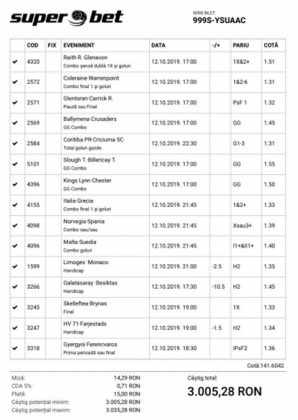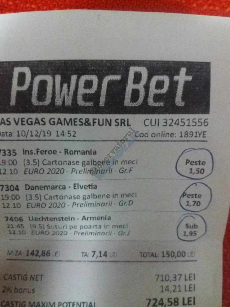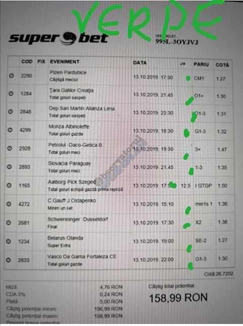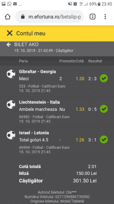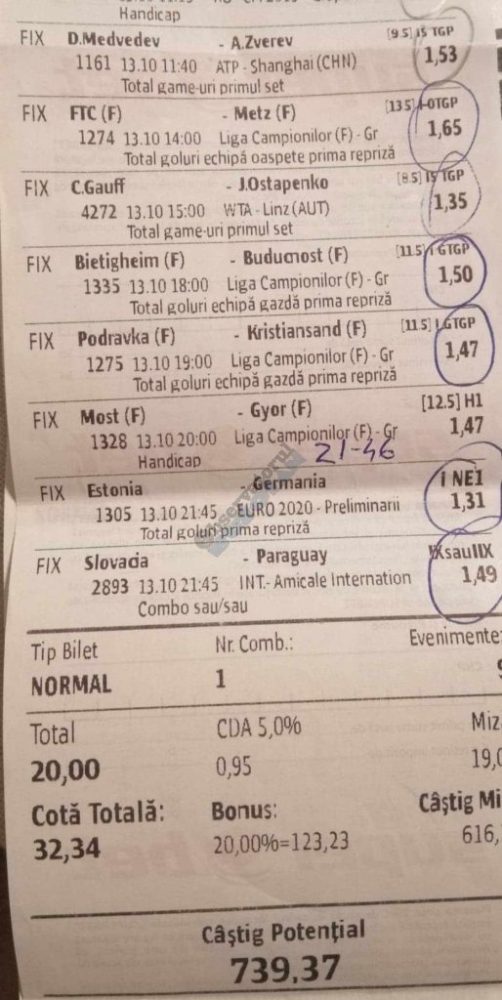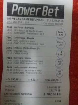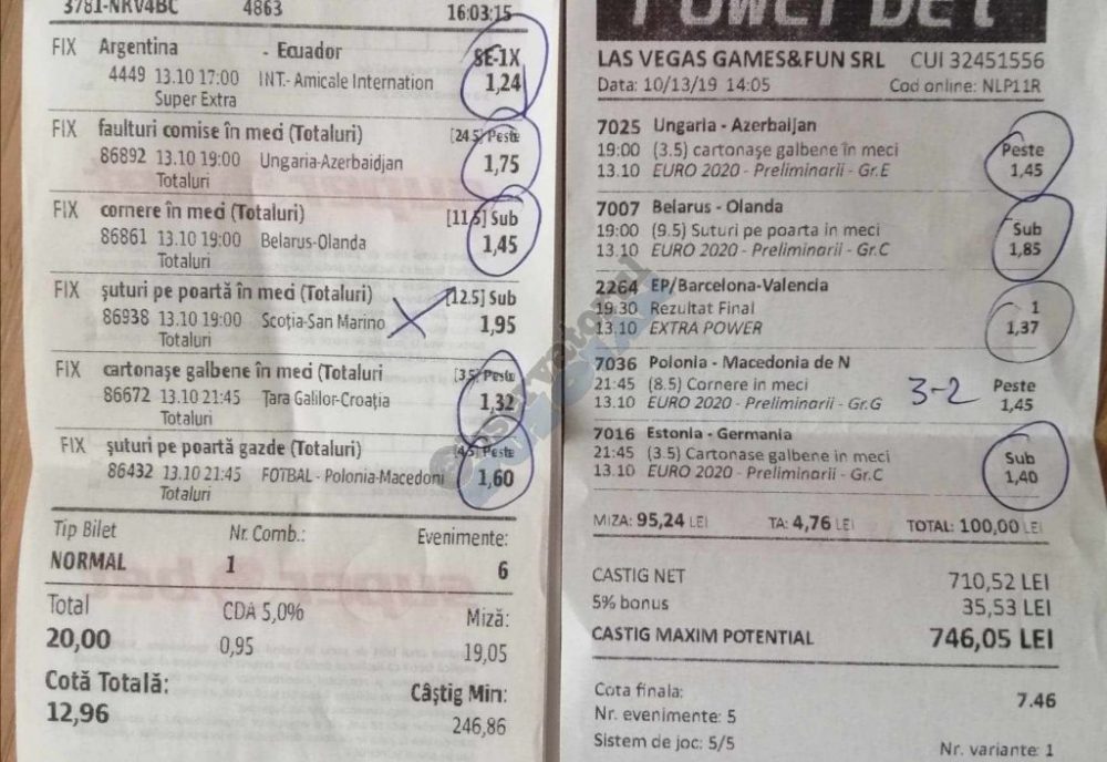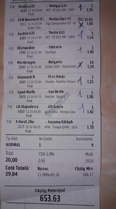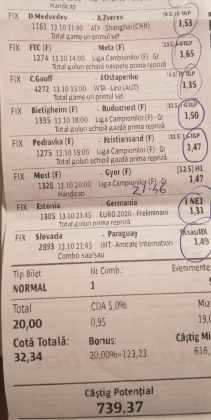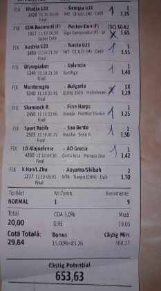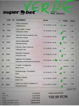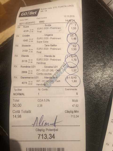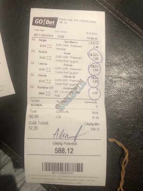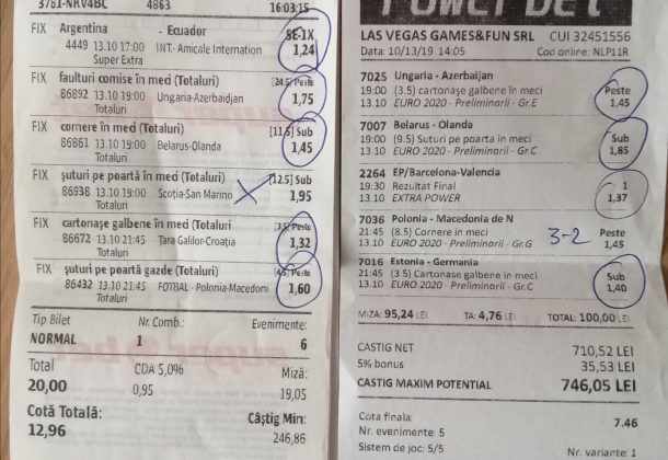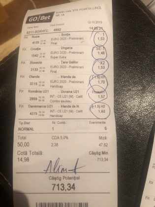 Galeria foto de astăzi este una foarte spectaculoasă, ceea ce iese din mințile voastre atunci când jucați la pariuri, continuă să mă uimească zi de zi văzând biletele pe care le postați pe grupurile de profil! Primele, dar nu singurele, două bilete de azi vin de la Alin Ticu, cu bune și cu rele, ca la pariuri. Pe cel de 700 îl încasează după o revenire senzațională a Olandei, iar pe cel de 500 îl ratează tot în prelungiri când belgienii s-au găsit mai cu moț să marcheze și al 9-lea gol în poarta prăpădiților din San Marino. În rest niște combinații perfecte. Avem apoi biletul nr. 3, postat de Romulus Aurelian, și modul simplu în care și-a construit piramida câștigătoare, ceva în genul biletelor de pronosport de acum 30 de ani. Poza cu nr. 4 e un super-bilet al lui Tibor David, lung ca o zi de vară, dar verde ca ceapa de primăvară! 15 lei pariați, 3000 încasați, iar noi n-avem nimic altceva de comentat. Urmează o tripletă perfectă (nr. 5, 6 și 7) pusă pe tapet de Vali GG, omul fără Facebook, dar cu care mă consult și eu săptămânal pe “speciale”, iar investiția de 550 de lei o multiplică până dincolo de 4000. (Apoi un platou de fripturi și o bere rece, se știe!) Urmează acum trei bilete în două poze (8 și 9) ale subsemnatului, jucate duminică la prânz, toate pierdute la câte un singur eveniment. Ghinion, lipsă de inspirație, prea multe evenimente pe bilete, cauzele sunt multe și interpretabile. La poziția a zecea avem biletul de nota 10. Este al grupului “Green Tickets”, cu propuneri de la toți membrii săi, și făcut verde-verde, a doua oară într-o săptămână. Bravo lui Lucian Burdea și amicilor săi! Trecem la biletul nr. 11, postat de Valentin Hunter, un obișnuit deja al paginii noastre cu cotele sale de 10-13, iar încasările aproape bisăptămânale îl fac unul dintre cei mai constanți și profitabili jucători din peisaj. Ne întâlnim acum la foto nr. 12 cu Alin Dulău din Germania și vedem combinația perfectă pentru a transforma o monedă de 2 euro într-o hârtie verde de 100. Gut gemacht! Biletele de la pozițiile 13 și 14 sunt ocupate de Claudiu Turculeț, cote 2 de toată frumusețea și încasate cu ajutor divin sau voodoo! Scorul de la Israel – Letonia a înghețat la pauză, iar georgienii au reușit să evite egalul din Gibraltar abia în ultimele minute ale jocului ce părea câștigat de la pauză cu acel 2-0 liniștitor. Am început cu Alin Ticu, încheiem tot cu el și biletul nr. 15. Conceput din ideile lui combinate cu ceva jucat și de mine, verde excepțional și noroc fantastic la faptul că site-ul UEFA.com a validat exact 10 cornere la meciul grecilor, deoarece arbitrul îl fluierase și pe al 11-lea, dar nu i-a mai lașat pe eleni să-l execute. Iar amicul nostru din Bolintin Vale a încasat prima de aproape 2600, dar și investiția a fost de toată lauda, 350 de lei!