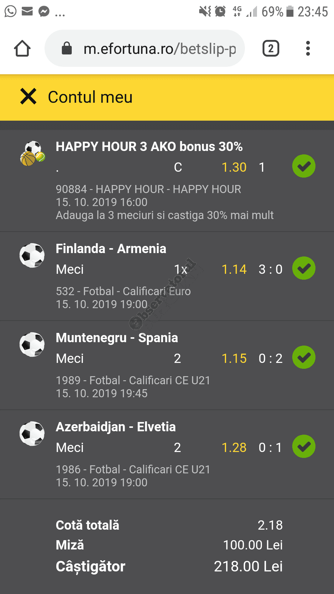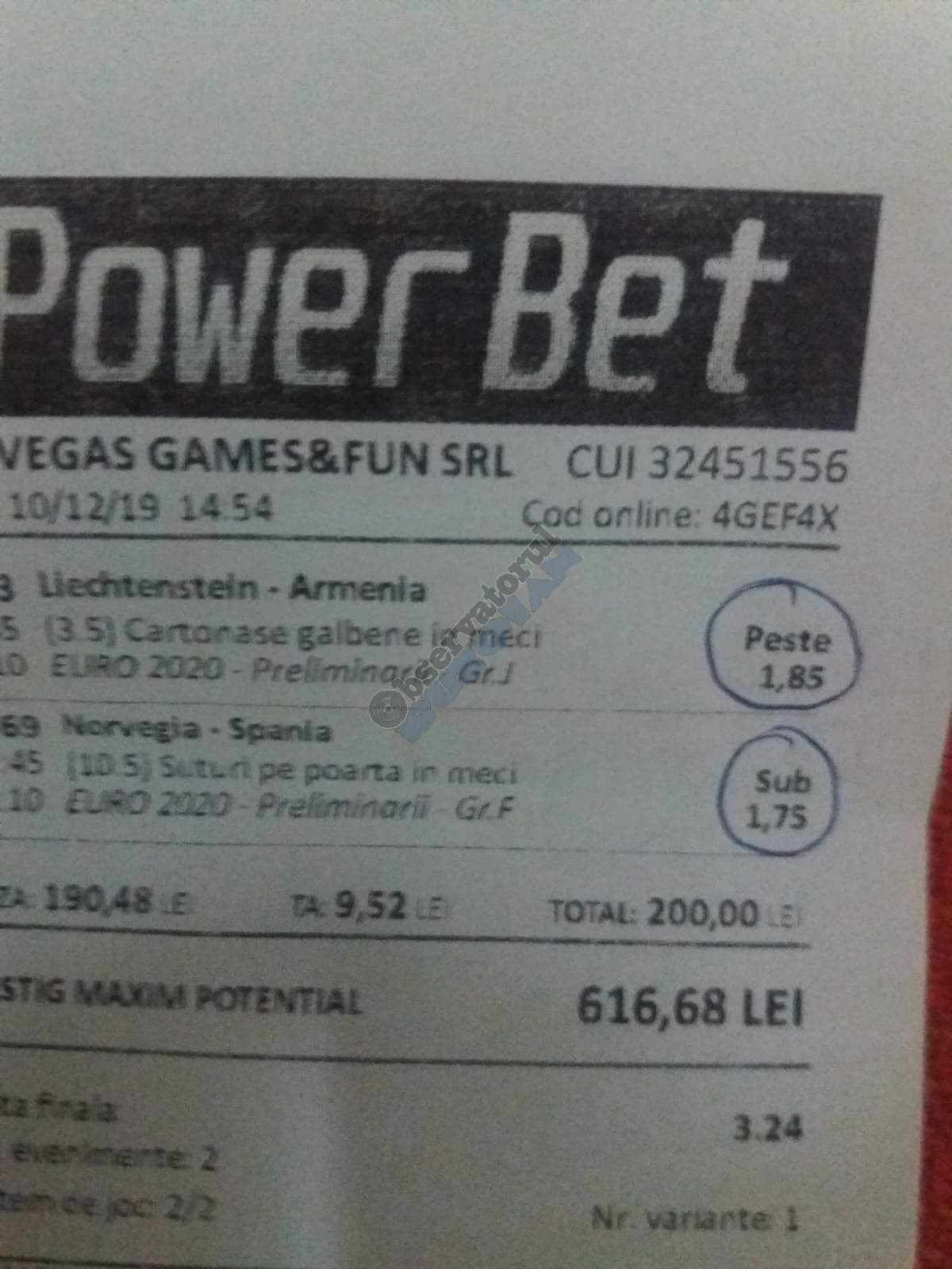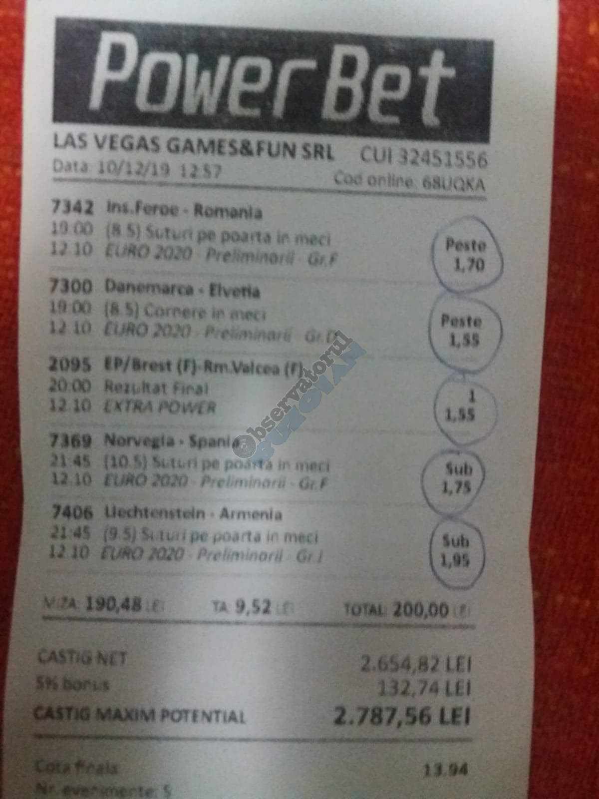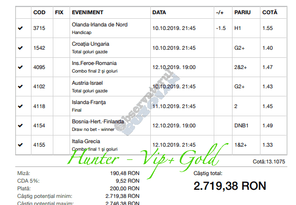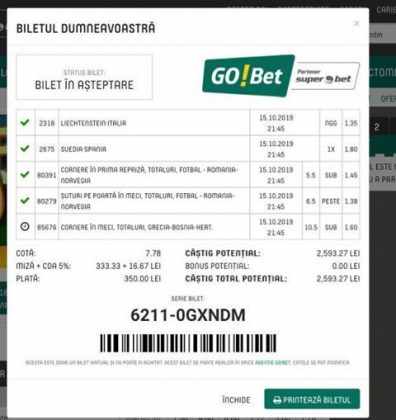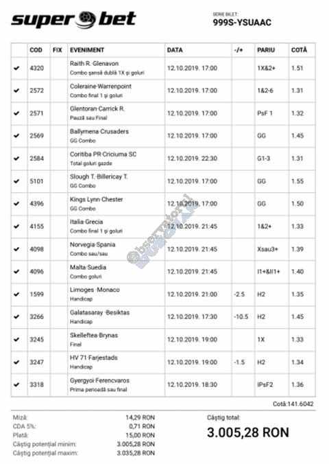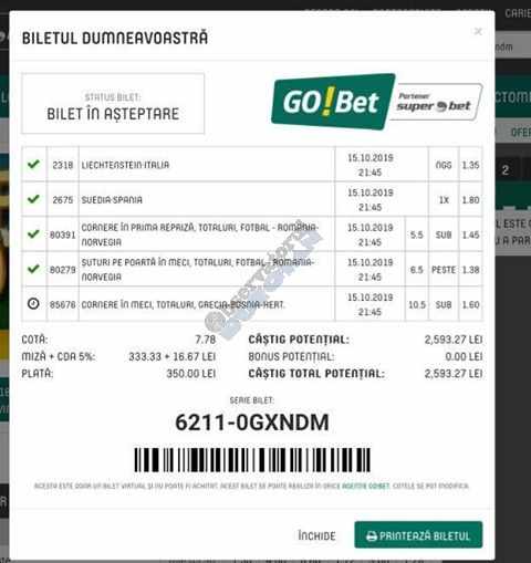 Galeria foto de astăzi este una foarte spectaculoasă, ceea ce iese din mințile voastre atunci când jucați la pariuri, continuă să mă uimească zi de zi văzând biletele pe care le postați pe grupurile de profil! Primele, dar nu singurele, două bilete de azi vin de la Alin Ticu, cu bune și cu rele, ca la pariuri. Pe cel de 700 îl încasează după o revenire senzațională a Olandei, iar pe cel de 500 îl ratează tot în prelungiri când belgienii s-au găsit mai cu moț să marcheze și al 9-lea gol în poarta prăpădiților din San Marino. În rest niște combinații perfecte. Avem apoi biletul nr. 3, postat de Romulus Aurelian, și modul simplu în care și-a construit piramida câștigătoare, ceva în genul biletelor de pronosport de acum 30 de ani. Poza cu nr. 4 e un super-bilet al lui Tibor David, lung ca o zi de vară, dar verde ca ceapa de primăvară! 15 lei pariați, 3000 încasați, iar noi n-avem nimic altceva de comentat. Urmează o tripletă perfectă (nr. 5, 6 și 7) pusă pe tapet de Vali GG, omul fără Facebook, dar cu care mă consult și eu săptămânal pe “speciale”, iar investiția de 550 de lei o multiplică până dincolo de 4000. (Apoi un platou de fripturi și o bere rece, se știe!) Urmează acum trei bilete în două poze (8 și 9) ale subsemnatului, jucate duminică la prânz, toate pierdute la câte un singur eveniment. Ghinion, lipsă de inspirație, prea multe evenimente pe bilete, cauzele sunt multe și interpretabile. La poziția a zecea avem biletul de nota 10. Este al grupului “Green Tickets”, cu propuneri de la toți membrii săi, și făcut verde-verde, a doua oară într-o săptămână. Bravo lui Lucian Burdea și amicilor săi! Trecem la biletul nr. 11, postat de Valentin Hunter, un obișnuit deja al paginii noastre cu cotele sale de 10-13, iar încasările aproape bisăptămânale îl fac unul dintre cei mai constanți și profitabili jucători din peisaj. Ne întâlnim acum la foto nr. 12 cu Alin Dulău din Germania și vedem combinația perfectă pentru a transforma o monedă de 2 euro într-o hârtie verde de 100. Gut gemacht! Biletele de la pozițiile 13 și 14 sunt ocupate de Claudiu Turculeț, cote 2 de toată frumusețea și încasate cu ajutor divin sau voodoo! Scorul de la Israel – Letonia a înghețat la pauză, iar georgienii au reușit să evite egalul din Gibraltar abia în ultimele minute ale jocului ce părea câștigat de la pauză cu acel 2-0 liniștitor. Am început cu Alin Ticu, încheiem tot cu el și biletul nr. 15. Conceput din ideile lui combinate cu ceva jucat și de mine, verde excepțional și noroc fantastic la faptul că site-ul UEFA.com a validat exact 10 cornere la meciul grecilor, deoarece arbitrul îl fluierase și pe al 11-lea, dar nu i-a mai lașat pe eleni să-l execute. Iar amicul nostru din Bolintin Vale a încasat prima de aproape 2600, dar și investiția a fost de toată lauda, 350 de lei!