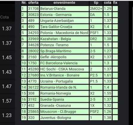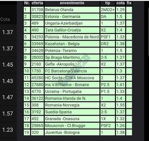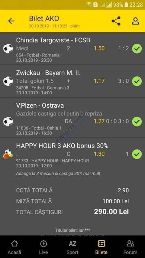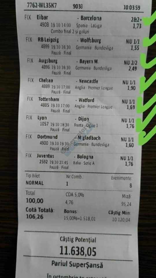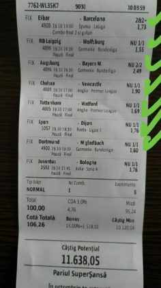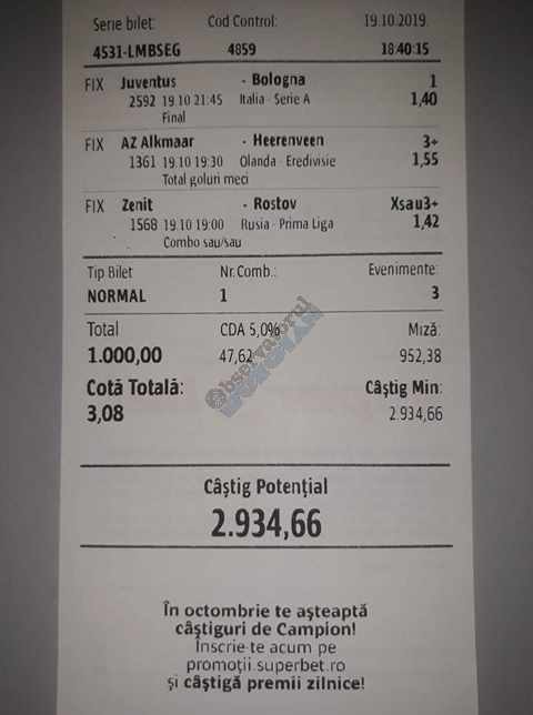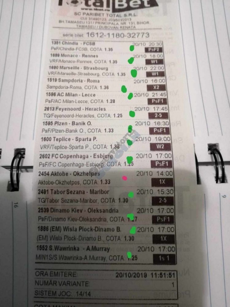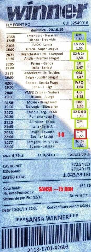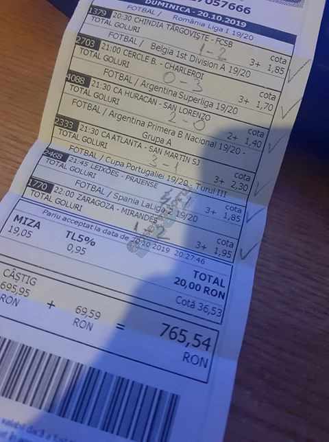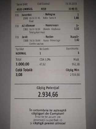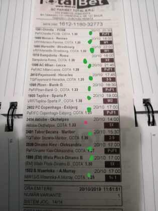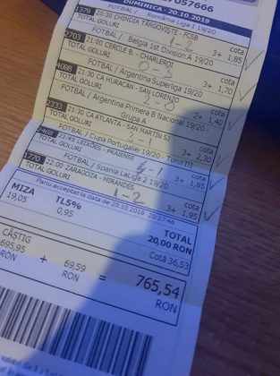 Galeria foto de astăzi este una mai specială, ținând cont de tragedia de care vă vorbeam în deschidere. Avem bilete frumoase, avem bani mulți încasați de pariori, avem și ratări monumentale. Prima poză e un monument de curaj combinat cu noroc. Biletul nr. 1 îl joacă Ionutz Pașca, simplu, din trei evenimente enervant de ușoare, dar pe o sumă imensă în lumea jucătorilor de zi cu zi: 1000 de lei și o cotă 3. Dacă de primele două meciuri s-a descotorosit ușor, încă de la pauză, cu al treilea, cel al lui Juve a avut de furcă pentru că în prelungirile meciului oaspeții din Bologna au avut un penalty, neacordat nici cu VAR, o bară transversală și o paradă de zile mari a lui Buffon! Trecem la biletul nr. 2, din aceeași categorie a curajului nebunesc și al norocului ce te atinge o dată în viață. Este plasat de un amic al lui Gabriel Șusteru și conține (cu excepția primului meci, pe care cred că l-a pus doar de probă, să vadă dacă nu cumva ar trebui repetat, părerea mea!) doar contre la pauză/final pe meciurile tuturor favoritelor de sâmbătă: Chelsea, Bayern, Dortmund etc. Și trece prin niște cumpene incredibile și acest bilet, plasat pe 100 de lei: Augsburg și Watford deschid scorul și ușurează teribil cele două meciuri cu super-favorite în prim-plan, lui Dortmund i se anulează cu VAR un gol în prima repriză pentru un ofsaid (inexistent) cu 8 (opt!) pase în urmă, iar Juventus este egalată la doar câteva minute după ce deschisese scorul și părea să ruineze frumusețe de bilet!!! Mai e ceva de comentat? Haideți să vedeți și două gherle acum. Biletul nr. 3 vine de la Oradea, de la Lucian Burdea, și se împiedică tocmai în Kazahstan la o dublă de “1X”, iar biletul 4 e al unui buzoian, Gabriel Georgescu, un optimist fără limită atunci când crede că Levante îi va putea da gol Sevillei pe tărâm andaluz. Și banii au rămas la agenții, băieților li s-au dat firimituri… Polemica se declanșează imediat în jurul biletului cu nr. 5, postat de Daniel Ochi. Omul spune că nu-i al lui, ci al unui amic, dar toată lumea îi face proști pentru că au jucat doar 19 meciuri și nu 20 ca să prindă acel mult vânat ‘bonus dublu”. Asta era problema aici? Băi, fraților, doar să numeri până la 19 și te ia plictiseala, darămite să mai faci verzi atâtea meciuri întinse pe aproape două săptămâni! Vedem acum în foto nr. 6 biletul, pardon, gunoiul de bilete jucate de Alexandru Brebene și ratate (plus vreo 15 milioane jucați) din cauza păguboșilor de la Bayern Munchen ori Tottenham! Revenim cu lucruri mai serioase și urmărim micul, dar puternicul combo plasat de Dani Turcu în biletul nr. 7. Eu nu pot face altceva decât să aplaud inspirația și faptul cum a ajuns la meciurile din Sud-America cu verde încă de la pauză (sau pe aproape la Chindia…)! Biletul nr. 8 vine de la Florin Iancu și este o mostră de inteligență pentru că-și procură gratis acea cota de 1,30 oferită de agenția lui pentru că a plasat biletul într-un interval orar prestabilit. Cote mici, simple, ușoare, iar suta i se triplează mai ceva ca prăjitura din copaia bunicii pusă pe soba caldă! Am ajuns aproape de final și am hotărât să-l susțin necondiționat pe Bogdan Pop, milionarul care a înebunit România cu stilul său neortodox (din cauza sumelor pariate), dar corect (pentru că joacă un singur eveniment). Așadar e vorba de biletul nr. 9 și o sumă de 225 de milioane vechi pe victoria lui Inter la Sassuolo, conturată încă de la pauză, ba chiar cu gol în min. 2 marcat de Lautaro Martinez. Să cânte lăutarii, frate, lasă fomiștii să vorbească aiurea-n tramvai, ei joacă 2-3 lei pe bilete, urlă ura în ei! Închid galeria cu biletul de nota 10, postat deja cu o săptămână în urmă tot aici și care îi aparține fostului nostru coleg, Cătălin Lupescu. El l-a jucat pe cel de 2 lei, cotă un pic peste 1000, apoi l-a postat pe unul dintre grupuri, iar un curajos l-a plasat pe 100 de lei și a încasat 1,3 miliarde!!! Inspirație, curaj și noroc, dar peste toate, valoare.
