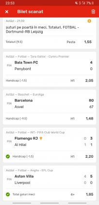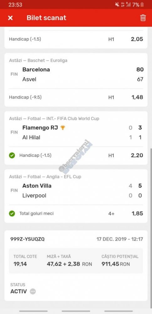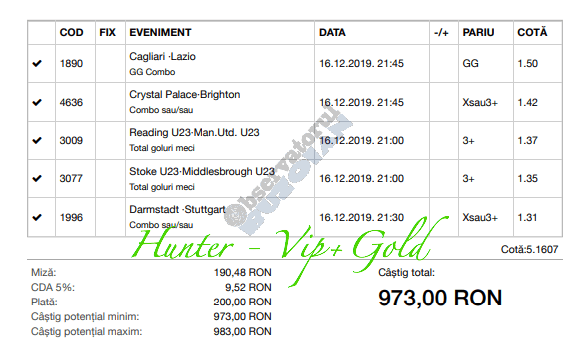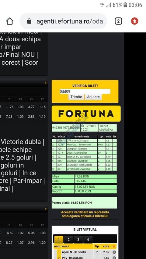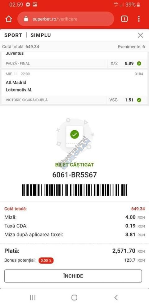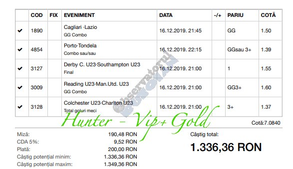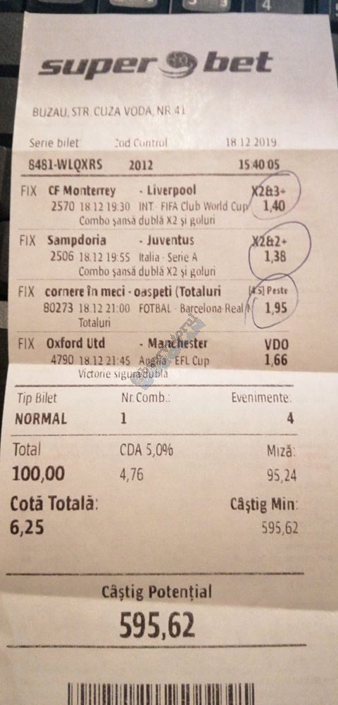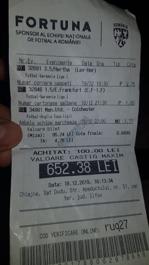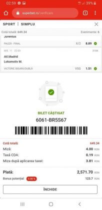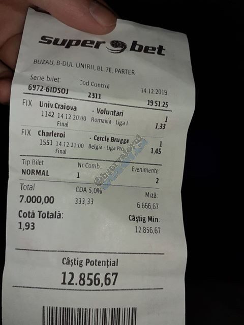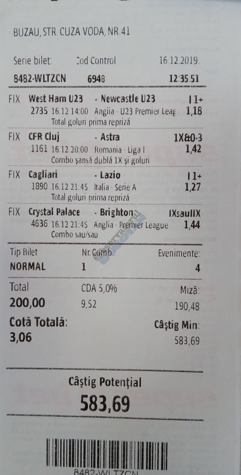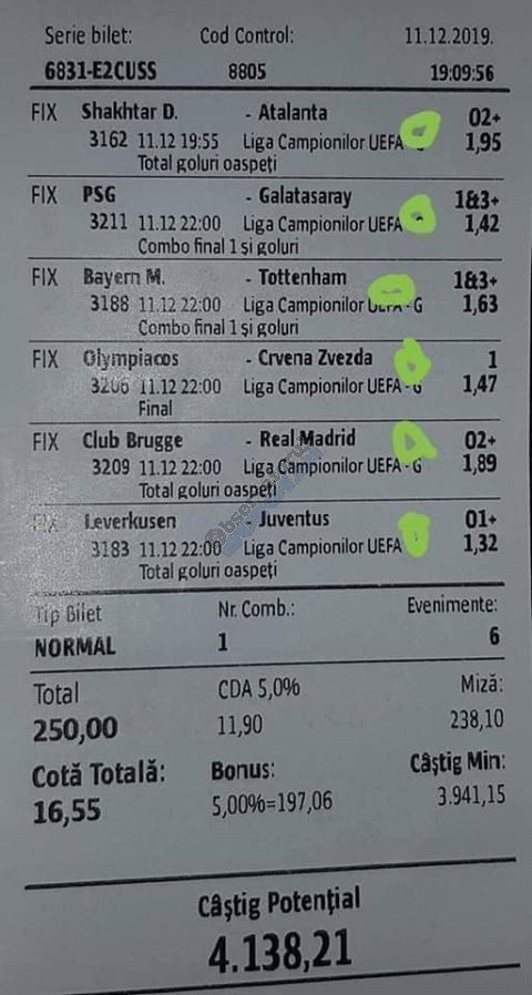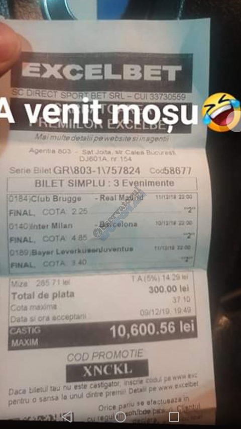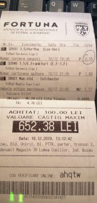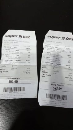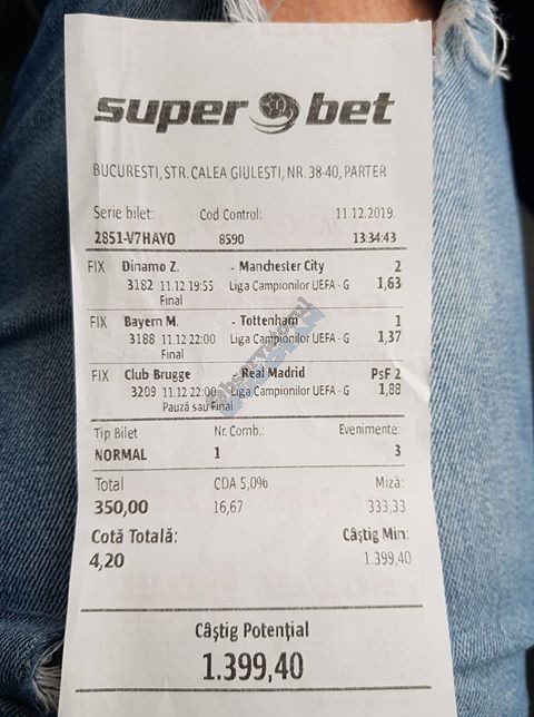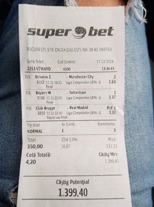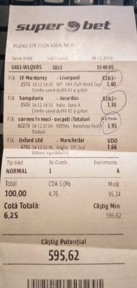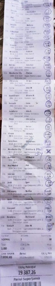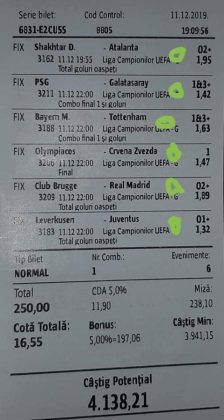 Pentru că timp de zece zile am făcut doar actualizări ale ofertei și nu am mai umblat la galeria foto, iată că a venit timpul să vă prezint multe, dar multe bilete câștigătoare. De fapt azi chiar nu avem în program să prezentăm drame, lacrimi și sughițuri (cu o două excepții!), doar bucurie și mult verde. Iată cum arată un bilet de superclasă, e primul din listă și Pappa Doc e autorul lui. (Nu am făcut captură de ecran după întreg biletul, dar codul de agenție vi-l oferă pe tavă. Iar cota de 8+ cu p/f e demnă de tot respectul ca și inspirație supremă!) Urmează biletul nr. 2 postat de englezul Gabriel Hodorog și singurul ratat al acestui episod. Dacă săptămâna trecută ați văzut cum se pariază 1000 de lire pe un singur meci (Voluntari – Viitorul) și se și face profit, iată-l acum pe colegul nostru cum aruncă la gunoi 500 din cauza excesului de încredere în Shahtar jucat în dublă! Uffff, chiar că a durut asta, nu? În aceeași ultimă etapă de Ch. League face bani cu un trio perfect și Gheorghe Viorel (foto nr. 3), iar suma pariată este una de mare curaj, 350 de lei, așa cum puțini dintre noi sunt dispuși să o facă. Câștigul îi umple portofelul, iar bucureșteanul stă liniștit acum până la următoarea etapă din cupele europene. Foto nr. 4 ne arată biletul lui Ka Do, deja abonat al rubricii nostre, iar cota de aproape 17, curajoasă prin ceea ce a ales să parieze, e una care ar putea concura oricând la titlul de biletul săptămânii. Autorul următorului bilet (nr. 5) este un amic al lui Nache Laurențiu, rezident în Stuttgart, care a dorit să rămână anonim. Așa că îl băgăm în cerneală pe neamț și iată isprava reușită cu 300 pariați pe victoriile-solist realizate de Real, Juventus și Barcelona în ultima zi de Champions: peste 10 mii de lei! Tot de suta de milioane sare și Bogdan Niculescu cu biletul următor (nr. 6), două meciuri relativ ușoare erau să-i dea bătăi de cap cu cei 7000 (!?!) pariați, în special din cauza evenimentelor de pe “Centralul” craiovean! Dar totul s-a terminat cu bine, iar golul lui Balașa de pe final a fost realmente unul salvator. O minunăție ne prezintă pe tavă și Ilie Iordache în poza nr.7. Cu 50 de lei a făcut o cotă de 300+, în care a combinat meciurile sigure cu ceea ce multă lume credea că vor fi non-combaturi (Barca, Juve). La urmă a numărat și el ceva în jur de 15 mii de lei, iar Crăciunul parcă e mai cald acum decât în alți ani! Hai să vedeți acum ce înseamnă să postăm înainte de jocuri biletele noastre. A făcut-o Franco Swiss cu ceea ce vedem la nr. 8, iar exemplul său a fost preluat imediat de Adrian Mușat + Laur Balaurul cu cele două de la foto nr. 9. Ideea elvețianului cu domiciliu în Iordania a fost excelentă, la fel și curajul și încrederea celor doi buzoieni care au copiat milimetric tichetul său verde. Și pentru că Franco are realmente o săptămână excelentă, iată că biletul său din foto 10 primește și titlul de “biletul de nota 10” al acestei episodului! Iar faptul că lumea are încredere în ideile sale ni-l demonstrează Bogdan Niculescu (foto nr. 11) care îl reproduce identic, doar că undeva pe lângă București. Continuăm cu un alt bilet excelent, cel din foto nr. 12, conceput de Austrus Wiener, iar modul în care a evitat acel amărât de 0-0 din El Clasico (cu cornerele Realului) pe mine m-a lăsat cu gura căscată! Și norocul a intervenit aici cu golul din prelungiri al lui Liverpool ori paradele lui Claudio Bravo care au ținut “victoria dublă” a celor de la City, dar fără noroc noi am fi doar fire de nisip în bătaia vântului stârnit de aranjamentele caselor de pariuri cu actorii din teren… Următorul bilet (nr. 13 și 14) vine de la George Valentin, un buzoian stabilit la Dublin și revenit acum în țară cu ocazia Crăciunului. Foarte tare, foarte inspirat și cu evenimente din tot spectrul zilei de marți. Din 50 de lei a făcut 900, așa că orice alt comentariu ar părea simplă gargară. Ne pregatim de încheiere, dar ne uitam si cum procedeaza un profesionist, Valentin Hunter. Iar biletele sale (nr. 15 și 16) cu cote 5-7 sunt de o simplitate enervantă! De ce nu vedem toți acest hobby la fel de ușor, la fel de clar, la fel de necomplicat? Ne luam așadar “La revedere” cu un bilet infernal (foto nr. 17) de lung, cu 30 de evenimente, conceput de mintea analitică a lui Bil Călin. (Foarte bun jucător, în opinia mea, dar excesiv de încrezător că va da lovitura cu un astfel de BD. Bucăți de 5-6 meciuri din biletele sale ar umple de bani muuultă lume!) Vă las pe voi să-i analizați alegerile și să vedeți ce lovitură în plex a putut să-i dea Guardiola cu mizeriile pe care le produce an de an în Ch. League! Iar cu ucrainenii cred că-i la al doilea sau al treilea an consecutiv…