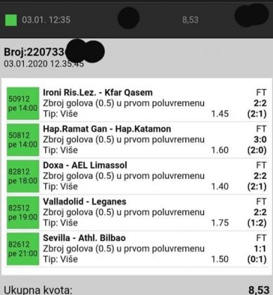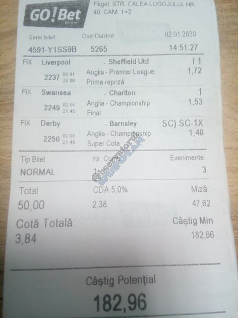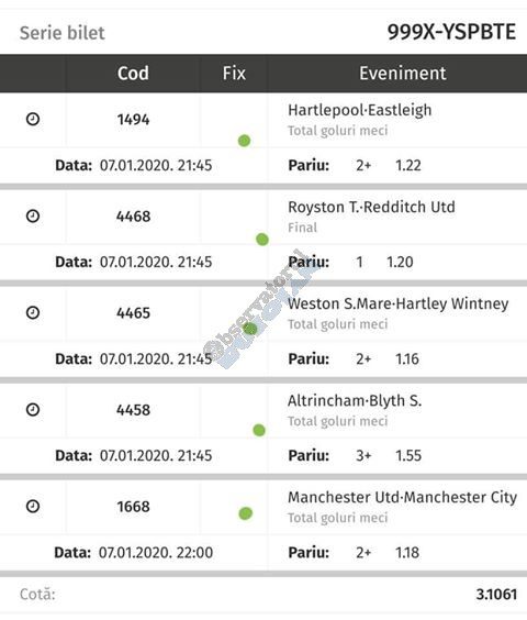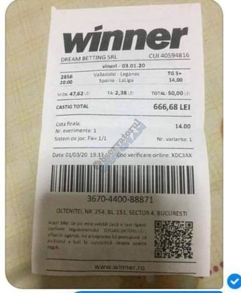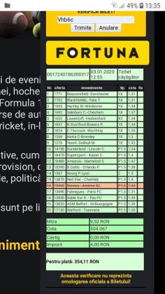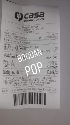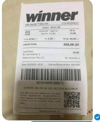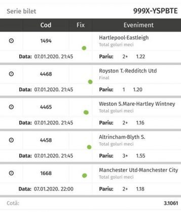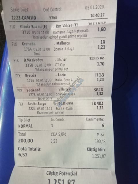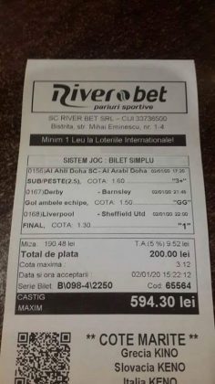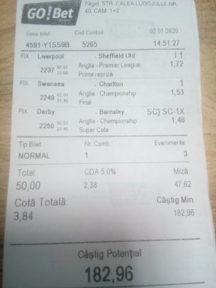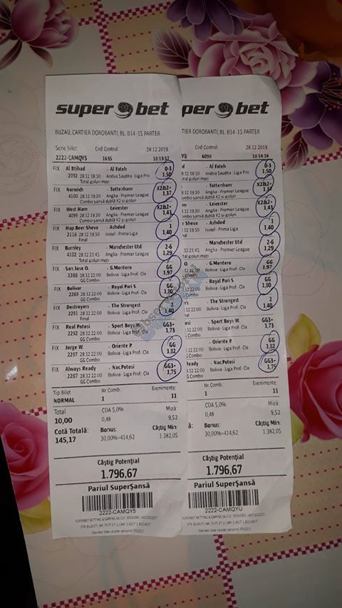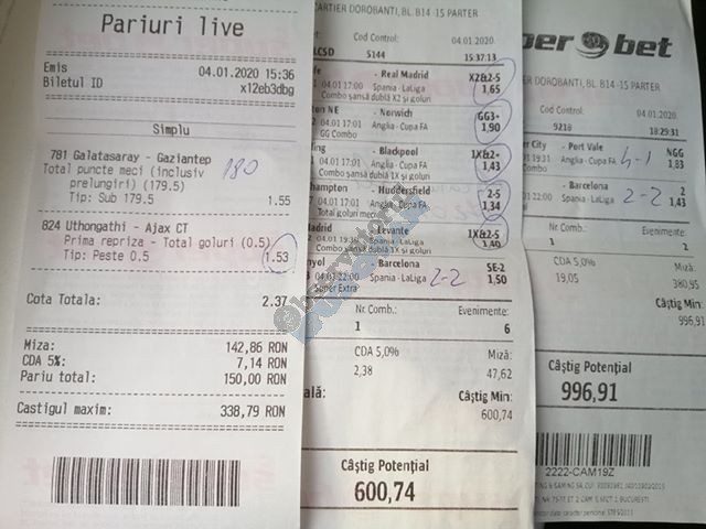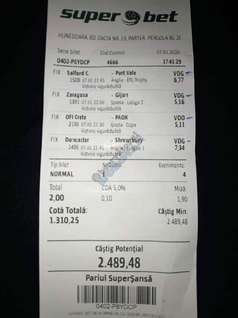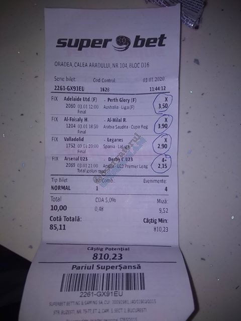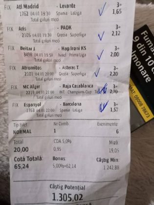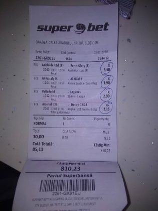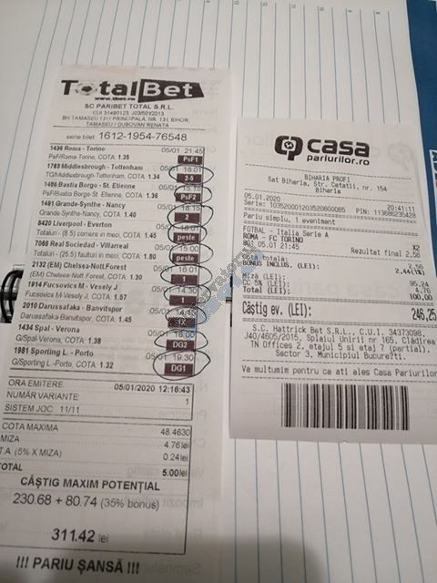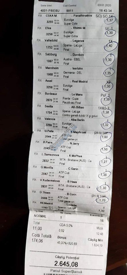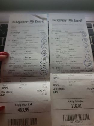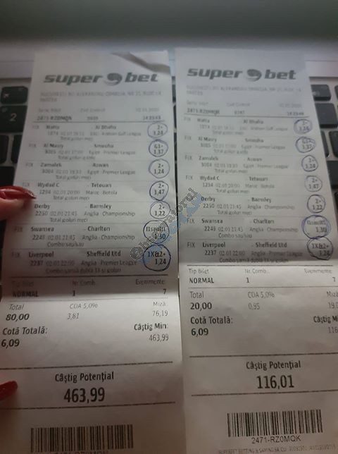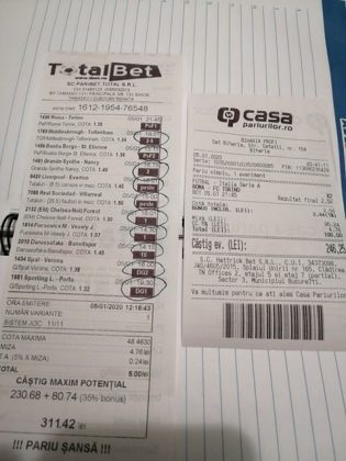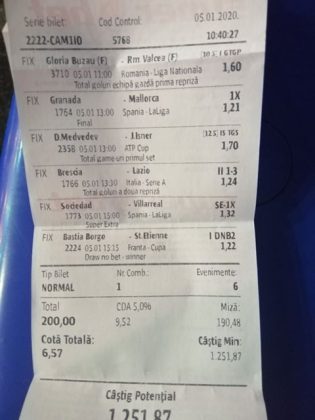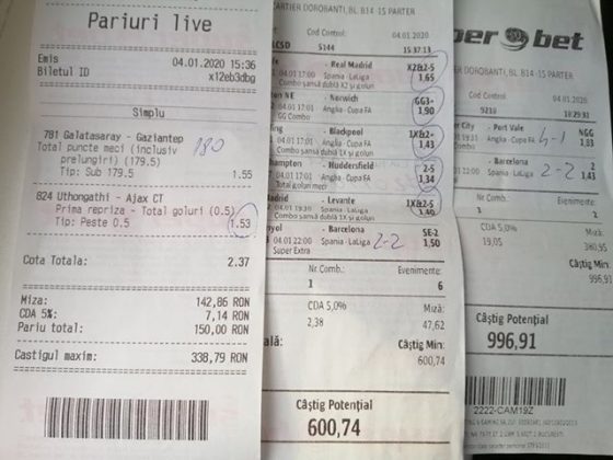 Pentru că timp de șapte, opt zile am făcut doar actualizări ale ofertei și nu am mai umblat la galeria foto, iată că a venit timpul să vă prezint și câteva bilete câștigătoare. Mai multe de data asta, mai interesante, dar am mai strecurat și picături de ghinion/lipsa de inspirație pe ici, pe colo. Debutăm cu dreptul, iar biletele gemene din poza nr. 1 par a fi ale unei fete, Nykkol Nykkol, cel puțin asta am înțeles eu din profilul de pe care a fost postat. Sau după unghiile ale frumoase cu care prezintă perechea verde-verde. Câte șapte alegeri inspirate pe fiecare dintre ele, emoții din belșug, dar și niște bănuți de-o seară frumoasă în club băgați la portofel. Excelent! Trecem la biletul nr. 2, al lui Alexe Gabriel și chiar mă bucur să văd câștiguri frumoase pe cote 2-3 simple, pe bani mulți, făcute cu cap limpede și scop unic de a scoate bani din agenție! Al treilea win al zilei vine de la Oros Răzvan, și el tot cu alegeri puține, pe același calapod al învingătorului, o cotă de 3+ și banii în portofel. Am ajuns la primul tra-la-la al episodului, biletul nr. 4 postat de Nache Laurențiu. El forțează un 5+ la un meci din La Liga pe care casele de pariuri îl creditau cu o cotă incredibilă la 2+ (1,65), și nu puțini au fost cei care au profitat de asta! S-au dat trei goluri în primul sfert de oră, totul decurgea conform planului de a detona bombița aceea mică, pe final vine și egalarea gazdelor, așa că speranța într-o victorie de senzație a lui Valladolid era justificată. Dar pentru că suma eventuală de câștig a fost stabilită de Sarsailă însuși, banii au rămas acolo, iar el se oftică și azi că nu le-a dat softul peste cap. După un nebun, hai și la al doilea! Este Morna George Ciprian, posesorul biletului nr. 5, iar exprimarea mea este în scop literar, nu că aș fi vreun doctor psihiatru… Admirați frumusețea celor trei X-uri și mai comentați ceva! Pentru că în on-line se găsiseră niște deștepți să-l certe că de ce n-a postat biletul înainte, să se inspire și alții! Păi care era tâmpit să joace așa ceva, binențeles, în afara proprietarului de drept pe care nu ai cum să-l judeci, l-a văzut perfect și banii sunt la el! Haideți la nr. 6, continuăm pe linia zăpăciților, iar Remus Ștefan preferă să-i zicem așa, iar el să încaseze săptămânal câte 13 milioane, corect? Dar ce curaj să joci 3+ în Israel sau Algeria, am rămas prost! Ciu Ciu, omul de nota 10 de săptămână trecută, a mai produs o minune. Abia revenit în Germania, țara de adopție, s-a gândit să mai recupereze ceva măcar din biletele de avion și a făcut-o cu trei meciuri (foto nr. 7) din diviziile inferioare ale Angliei, minunat inspirat și cu speranța că abia și-a intrat în mână cu acest prim verde la început de an! Și vine tot din afara României și biletul nr. 8, al bosniacului Takir Copic, unul dintre profesioniștii cu care colaborăm în on-line. Și nu vreau să subliniez decât că și el a profitat de meciul disecat un pic mai sus, cel de la Valladolid, alegerea lui fiind incredibilă, “gol în prima” la o cotă de 1,75. La fel cum dealtfel a ales toate cele cinci evenimente de pe bilet, dar inspirația asta (ca și a altora, fără deosebire de sumele câștigate) mă umple de bucurie! Acum ar fi trebuit să vedeți biletul de nota 10, deocamdată îl retrogradăm o poziție, la nr. 9, iar autorul vine din Argeș, e Neluță Modrojan, un alt colaborator de nădejde din echipa selectată de colegul Vali M. Un bonus dublu care ar fi trebuit să fie perfect, 20 de alegeri excepționale se blochează la Rennes, unde al doilea gol al meciului se încăpățânează să nu intre, iar din 9000 de lei virtuali piteșteanul nostru rămâne doar cu 300, of, of of! Premiantul ediției de azi este buzoianul Adrian Achim. O pereche de gemeni de nota 10, cu foto nr.10, chiar dacă unul dintre evenimente a intrat în hibernare și a primit cota 1, iată rețeta victorioasă propusă de un jucător extrem de curajos în alegeri și pentru care riscul îl reprezintă cotele mici! Bravo, frate, jos pălăria cu două mâini! Continuăm călătoria, pentru că în aceste zile multe bilete ne-au trecut pragul contului de Messenger. Și mai vedem cum lovește ghinionul din toate pozițiile (sau lipsa de inspirație…) pe propunerile lui Franco Swiss. Sunt cele patru bilete din foto 11 și 12. Le iau la rând, că nu pot rezista. Ziua începe cu un live pierdut pe un meci de baschet la un singur punct, mama lor de turci! Apoi, pentru că intrase în panică din cauza meciurilor de FA Cup de la Southampton și Reading, face biletul de 400 de lei pe victoria Barcelonei și un NGG la City contra unei trupe de liga a 4-a, simplu și elegant, nu? Doar că cele două evenimente din Anglia revin pe direcția corectă, iar speranța omului era acum că va încasa ambele bilete. Guardiola și mizerabilii lui o comit din nou, Barcelona e o altă prostituată a săptămânii trecute, așa că banii, vreo 2000, rămân în casierie, iar amicul nostru cu gaură în buget. A doua zi merge să recupereze daunele și face un alt bilet aproape de perfecțiune. Îl duce lejer la primele cinci evenimente (handbal, tenis, fotbal), dar pentru că era în avionul de Amman nu a putut contacta pe nimeni să-i contreze pe live ultimul meci, când Sociedad conducea la pauză cu 1-0, așa că alți 1200 rămân păgubiți. Mama mea, Doamne! Rețeta este identică cu ce vom vedea la nr. 13, biletul lui Burdea Lucian, și el un membru de nădejde al echipei cu care s-a înconjurat Vali Mocanu pe parcursul anului trecut. Doar că el are tot timpul din lume să pună contră la meciul Romei, pierdut acasă 0-2 cu Torino, așa că daunele de pe biletul de bază au fost anihilate la modul profesionist. Tot un meseriaș în domeniu postează și biletul nr. 14, este Radu Marinescu. Un fular cât tot postul Crăciunului, cot