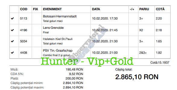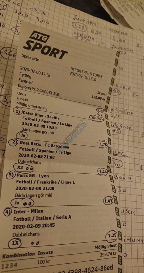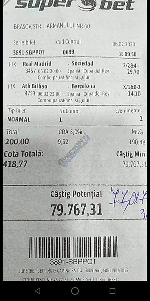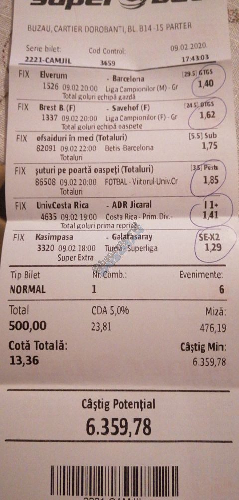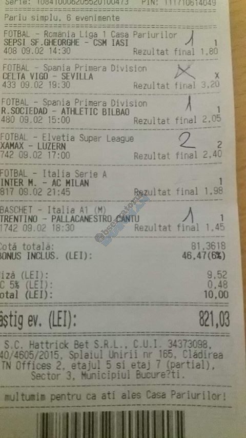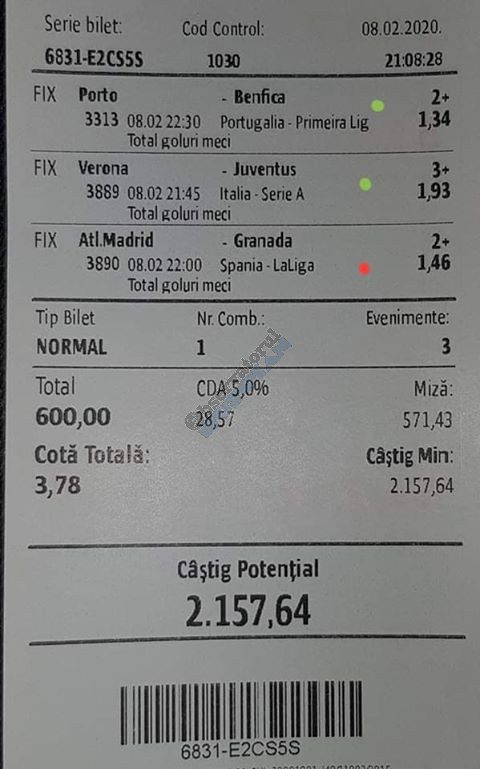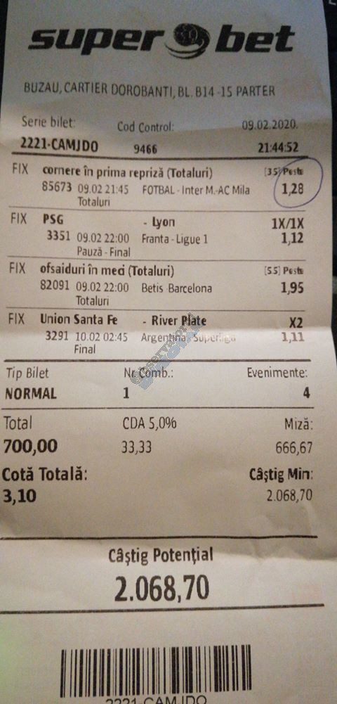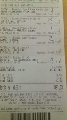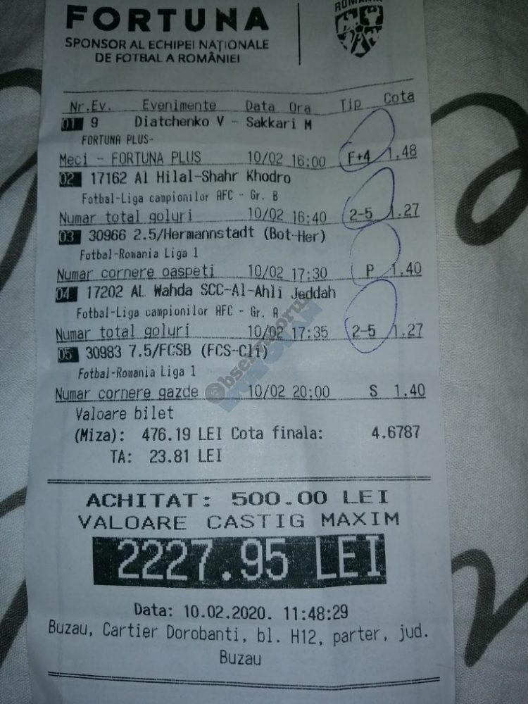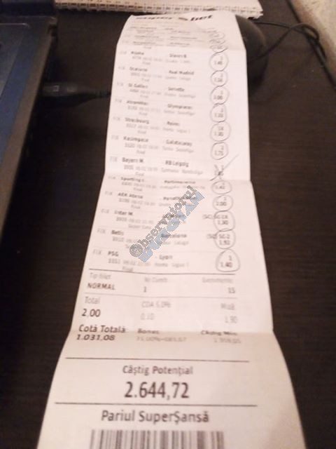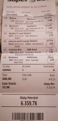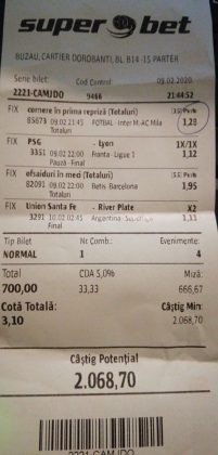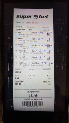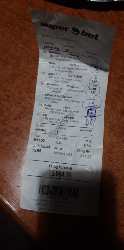 Pentru că timp de patru-cinci zile am făcut doar actualizări ale ofertei și nu am mai umblat la galeria foto, iată că a venit timpul să vă prezint și câteva bilete câștigătoare. Sunt mai multe de data asta și foarte interesante. Am găsit și destule ratări monumentale, din care am și ales vreo câteva să vi le prezint azi ca să vedeți pagube imense în buzunarele unora dintre colegii noștri. Debutăm cu dreptul (foto 1), iar acest bilet de Pronosport (cei de peste 45-50 de ani știu la ce mă refer) postat de Nache Laurențiu este al tatălui sau. Simplu, soliști, old school. Al doilea bilet e pus la nervi de “iordanianul” Franco Swiss, după ce pierduse pe Viitorul, iar fratele său a trebuit să alerge jumătate de cartier și să plaseze biletul câștigător cu 8 (!!!) secunde înainte să înceapă primul eveniment, “Il derby della Madonina”. A fost verde, nici nu văd cine l-ar fi încurcat… Iar acum începem cu o serie de ratări fantastice. Prima (foto nr. 3) vine de la Valentino Altobello, cel care a vrut să facă un cadou soției sale (o minivacanță la Amsterdam de Ziua Îndrăgostiților), iar cei 500 investiți păreau simplu de transformat în 6400, costul celor trei zile de fumat prin Cartierul Roșu. Doar că meciul Barcelonei le-a dat planurile peste cap. Din “GG3+” l-a transformat într-o specială pe ofsaiduri, se dă în prima repriză toată marja de 5 pariată, astfel că repriza secundă era doar un chin și-o suferință. Să vă mai zic că ofsaidul păgubos a venit în min. 89? Tot duminică, pe la ora 23, mă sună și Mihai Baltag, colegul de la ziar, să-mi arate prostia (foto nr. 4) făcută când a pariat pe Bayern și a ratat premiul de 2600. (Eu pariasem 1X și 3-6 goluri.) Tot el mai ratase cu vreo 3-4 zile în urmă alte 44 de milioane pariind la Aves – Porto 3+ și s-a terminat 1-1, așa că nervii lui, combinați cu două pahare de vin, ne-au ținut vreo juma de oră în telefon sporovăind despre fotbal. Și continuăm cu pagube. Biletul 5 vine din București, de la Romulus Aurelian , tot un bilet gen Pronosport, ca la Nache cel Bătrân. La scorul de 1-1 afișat de tabela din Vigo prin minutul 90, omul bifează X, doar că prelungirile și golul victoriei gazdelor îi dau peste mâna pe care o întinsese deja spre casierie să pescuiască cei 800 de lei, premiul victoriei. Și iată încă unul pierzător, cel din poza nr. 6, postat de Ka Do și ratat pe meciul lui Atletico, în care spera să vadă minim două goluri marcate. “Mi-a fost teamă să pariez pe victoria gazdelor, cota era aceeași, am ales prost”, a sunat explicația dată celor ce-l consolau după, în online. Gata, revenim la premii încasate, dă-le naibii de gherle, să rămână istorie deja! Iată un bilet venit din Italia (foto 7) de la Smoli Neculai. Un fular de zile mari, cu rezultate scontate și văzute la perfecțiune, doar că premiul de aproape 2000 s-a micșorat cu vreo 250 din cauza anulării meciului dintre City și West Ham. Unde oricum jucase pe victoria gazdelor și nu cred că erau emoții… Biletul nr. 8 e tot de peste graniță, de la Takir Copic, un careu de ași din seara de duminică pe care a zis că a încasat în jur de 500 de euro la 50 pariați. Soliști intuiți perfect pe favorite și verde-verde! Suntem la biletul nr. 9, trimis din Suedia de Daniel Sandu și căruia nu-i găsim nici-o bubă pe care s-o comentăm răutăcios, ba chiar ne ridicam pălăria în fata simplității și inspirației, o cotă 4 și 400 de coroane la portofel! Și acum bomba săptămânii, biletul de nota 10 de la poziția 10 a galeriei noastre. A fost pariat sâmbăta trecută la Buzău de Sorin Tolescu, 900 e suma plasată și ceva în jur de 15 mii cea încasată. Dar fără o poveste, mâna întinsă nu primește pomană, așa că hai să vă zic. De pe tot biletul eu am apreciat doar două idei minunate, golul lui Chartlon la cota 1,77 și înscris în chiar prima repriză și handicapul de la Montpellier din Liga Campionilor din handbalul european, restul puteau fi văzute și pariate de oricare dintre noi, nimic special. Doar că apare prima cumpănă în meciul 3, cel de la Leyton, unde pariase 2+ și scorul înghețase cu un singur gol. Minutul 94 îl ridică în scaun, mai adaugă vreo câteva fire de păr alb și dă cu putere mai departe. Până la ultimul meci de pe bilet, cel de la Eindhoven, unde nici nu concepe să pună o contră măcar pe live! Și cele trei goluri așteptate rămân doar două, din nou până în min. 94 când se marchează un …autogol și banii nu mai sunt un vis frumos, ci pot fi numărați și răsnumărați. Incredibil cât noroc și câtă suferință pentru două rezulate care ar fi putut fi bifate încă de prin minutele 60-70 ale meciurilor respective! Iar de-acum încolo o să vă arat alte bilete incredibile, toate concurând cu șanse la orice premiu de frumusețe pe orice platformă de pariuri. La foto 11, din inima Londrei, apare Picu Purice, vechi client de-al nostru, cu un super-win. E luni seara, omul nu prea are din ce alege, dar combină două live-uri cu ce mai vede prin ofertă, cote toate peste 2, marchează 5 lire și trece în cont vreo 250 pentru că are și el un meci anulat din cauza temperiei. Poate chiar a fost mai bine așa, nu? Iată acum la pozițiile 12 și 13 un bilet și o contră, plasate de Franco Swiss, bani încasați pentru prima idee, dar cu un pic de noroc (încă un corner în favoarea FCSB-ului) iar mai fi adus alți 800. Și ce combinație a găsit la contra aia!!! Ca să nu mai zis de norocul fantastic la întoarcerea Mariei Sakkari din primul meci de pe bilet și golul din minutul 90 marcat de Al Wehda! Poza nr. 14 e a unui bilet postat de Valentin Hunter, amicul nostru de pe grupuri, profesionist (pentru că din pariuri își duce zilele) serios și simpatic. Remarc cu mare plăcere cum a văzut meciul din liga a doua franceză, un X2 de mare clasă