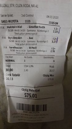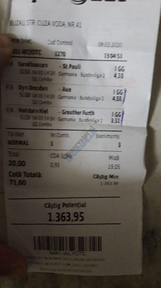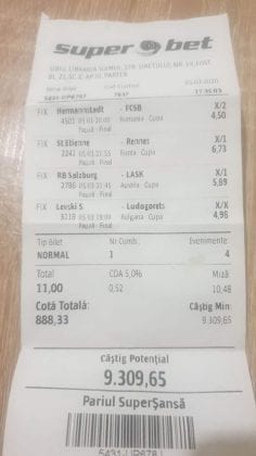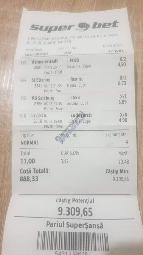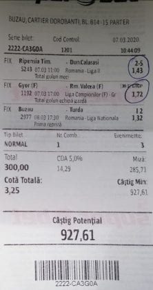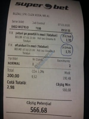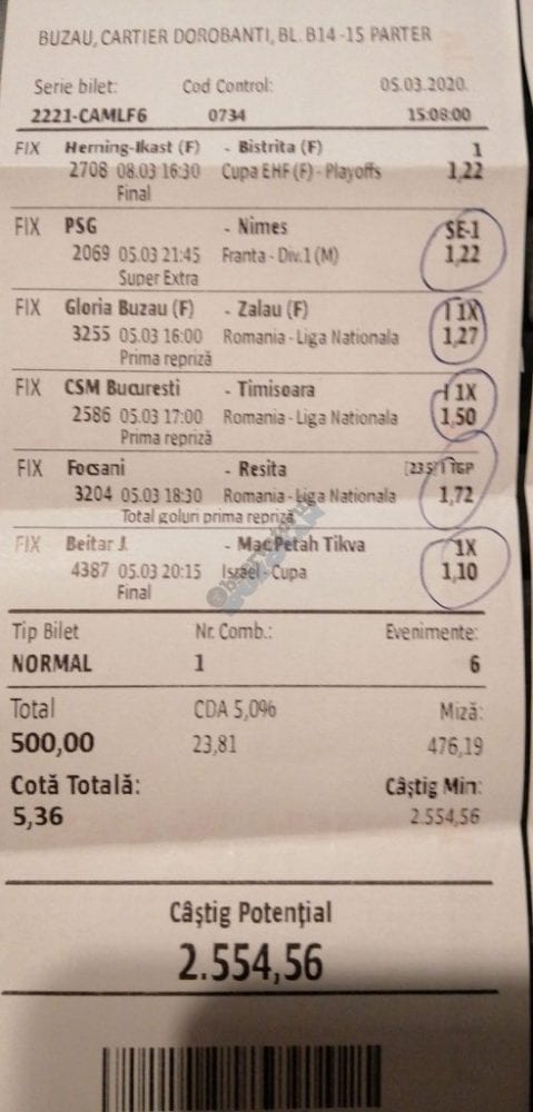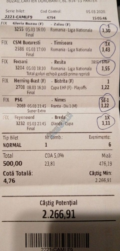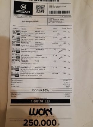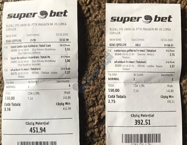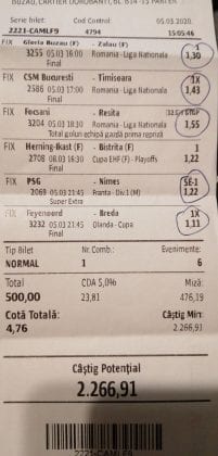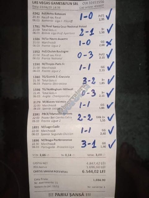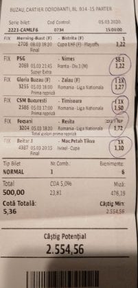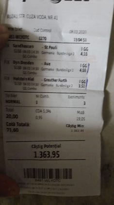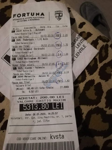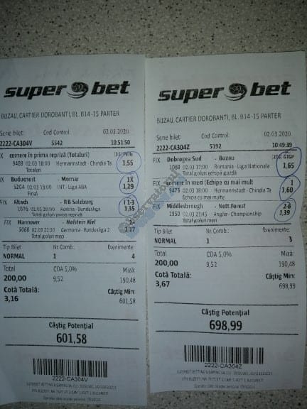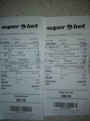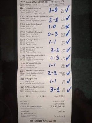 Pentru că timp de șase – șapte zile am făcut doar actualizări ale ofertei și nu am mai umblat la galeria foto, iată că a venit timpul să vă prezint și câteva bilete câștigătoare. Sunt destule și de data asta și foarte interesante. Debutăm cu dreptul (foto 1 + 2), iar acest prim duet de trei bilete mi-a confirmat ceea ce știam de mult timp, și anume că toate “specialele” lui Vali GG sunt minunat alese și valorificate! Iar acum începe jalea pe bani mulți, iar colegul Ka Do îl șicana pe Vali M. acum vreo câteva zile că dacă nu avem postări cu bani mulți pe cote de mizerie o să murim fără like-uri. Sunt două bilete fantastice (foto 3 și 4), în opinia mea, autorul este anonim pentru că are deja discuții în familie pe tema sumelor pariate, iar ultimele două victorii ale handbalistelor de la Gloria Buzău i-au adus ceva în jur de 3000 de lei profit, dar cu investiții de 13.000!!! Cote de mizerie, adevărat, 1.20 și 1.30, dar siguranță absolută. Fratele din Leicester al lui Nache Laurențiu vine cu biletul nr. 5, un trio perfect și lovit de noroc în prelungirile de la meciul lui St. Etienne, iar cei 150 de pound din portofel sunt răsplata curajului și a inspirației! Și pentru că tot veni vorba de noroc, hai să vă arăt ce face Gh. Bondoc cu biletul nr. 6. Joacă o sumă frumoasă pe meciuri relativ simple, dar cu niște răsturnări incredibile, noroc că alegerile sale au fost de tipul PSF și că echipele favorite au forțat tare în prima, altfel se alegea praful! Că același noroc + inspirație l-au atins și cu vreo 5300, asta-i și mai frumos! La fel ca și ceea ce urmează, adică biletul lui Răzvan Zavelcă (foto 7), o minunăție jucată vineri într-un casino, la tonomat, fără prea multe variante prin care să jongleze, cote între 1,50 și 2,40. Și din 3 lei face vreo 6500 cu cele 11 evenimente alese din toate competițiile posibile și imposibile! Ce-ai fumat, Răzvane, că prea ți s-a luminat capul, așa, deodată? Un alt parior inspirat este și Adrian Mușat, iar ceea ce vedeți în foto nr. 8 e doar unul dintre cele trei bilete jucate în timp ce ne beam cafeaua, împreună, sâmbăta trecută, puțin după ora prânzului. Vine cu o idee fixă că va juca 500 de lei pe două evenimente: minim două goluri în prima repriză la Liverpool și Atletico Madrid și un câștig eventual de 3200. Noi, deștepții, încercam să-l convingem să stea pe curul lui cu spaniolii, să se mai gândească, să-și bea cafeaua și să-și mănânce fursecurile… Exact la ora 14,20 traversăm strada spre agenție, doar că acolo observă că nu mai are baterie la telefon și nu poate deschide galeria foto să vadă codul biletului. Până apuc eu să sun la terasă unde erau Laur Balaurul și Vali M. trec secundele, el intră în panică, copiază după un alt băiat codul lui Liverpool și joacă doar acel meci cu “2+ în prima”. Renunță așadar la spanioli, dar cu inima strânsă. Când ne întoarcem la băieți, toți îi zicem că poate a fost un semn divin să nu joace pe Atletico. Golurile din Anglia vin repede, cei 500 pariați pe cota 1,95 se transformă în 900 și vrea să plece să mai joace live pe încă un gol în prima, dar nu are alți bani în portofel. Din zbor pescuiește 200 de la Vali, pariază chiar la milimetru, pentru că exact la ieșirea din agenție primește semnal sonor de pe Sofa că s-a marcat golul nr. 3 și o altă cotă 2 perfectă se face verde. Deci încă 400 încasați. La terasă este mare veselie pentru inspirația lui fantastică, pe la ora 15.30 se sparge gașca, dar Adrian al nostru are limbrici și lângă casa lui intră iar în agenție și aruncă alt mărunțiș pe nebunia cu “2+ în prima”. Și se termină 2-2, iar cota de 3,25 iese simplu și elegant. Dar dacă nu-i spălam noi creierul , nu făcea el 3200? A rămas cu 1000 pe plus, deloc rău, dar și sfaturile de pe margine sunt, de multe ori, proaste. Un alt curajos este și Răzvan, iar cea ce vedem în biletul nr. 9 merită aplauze. Pariază toți banii din contul său online, aproape 800 de lei pe 2+ la FCSB – Craiova plus o victorie cu 2-0 a Irinei Begu, dar totul este o consecință a faptului că pierduse un bilet foarte bun pe meciurile din handbalul românesc de duminică după-amiază. Cele două goluri vin încă din prima repriză, fata noastră câștigă ușor turneul challenger de la Indian Wells, iar Răzvănel își dublează suma din cont și ceva peste, acum are 1800 de pariat în următoarele zile. Și am ajuns la omul cu cel mai tare bilet al episodului. Este Alex Alex din Sibiu, iar aceste patru bucăți de pauză/final m-au dat pe spate. Cu 11 lei și o cotă de 888 sparge lumea în două joi seara, încasează vreo 9000 și ceva iar agenția de pariuri cred că a intrat în trepidație! Bravo, minunată inspirația! Urmează reușitele de săptămâna trecută ale colegului V. Mocanu, cinci bilete grupate în patru poze (de la nr. 11 la 14), pe care le-ați văzut și în postările lui zilnice. Nici nu mai ai ce comenta când vezi cu câtă acuratețe vede evenimentele, în special pe cele din handbal! Și nu zic nimic de alte 5-6 bilete aruncate la gunoi pe goluri primate în minutele de prelungiri sau pe alte chestii lipsă, un gol la handbal sau un corner la Clinceni… Nu putea lipsi un alt buzoian care joacă sume mari și cu inspirație înspăimântătoare, Sorin Tolescu. Are și el două bilete fantastice (15 și 16) jucate pe meciurile din 2. Bundesliga de duminică la prânz, câte două goluri în prima sau GG în oricare repriză. Și le face verzi, fraților! Cu 60 de lei plasați duce în portofel cam 1900 și uite cum a scos cheltuielile de 8 Martie și de 44 de pahare! Ne pregătim de final, dar mai avem două lovituri frumoase date de colegii noștri de suferință. Biletul nr. 17 este al lui Radu Suciu și îmi crește adrenalina când văd ce simplu punctează și ce curaj
