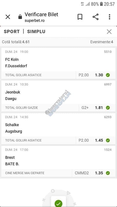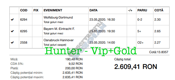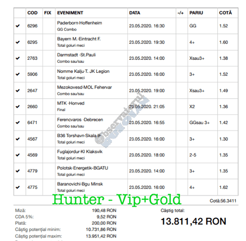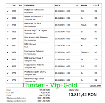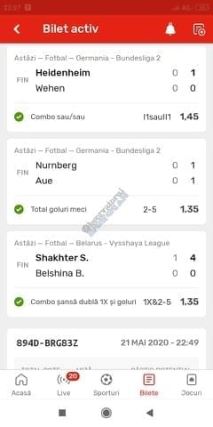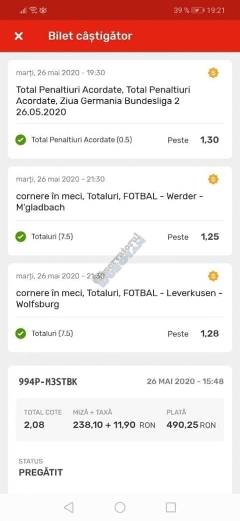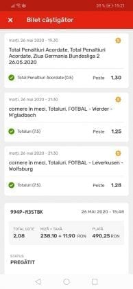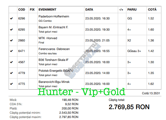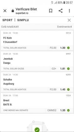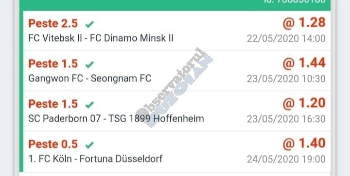 Avem și o micuță galerie foto. Biletele câștigătoare sunt rare în această perioadă, foarte multe dintre ele doar pe cote de maxim 10, dar trebuie repetat a mia oară că nici evenimentele din ofertă nu ne dau prea multe soluții! Primul dintre câștigători (foto nr. 1) este Florin Ghelbere. Un combo excelent, numai idei bune, iar eventualele bombe au fost anihilate simplu, jucând pe goluri, meserie, tată! Continuăm parada verde cu trei bilete postate de unul dintre profesioniștii cu pedigree din grupul nostru, Valentin “Hunter” (foto nr. 2, 3 și 4), care joacă “safe”, nu se complică în avioane și rachete, iar colaborarea de pe diverse platforme a făcut multă lume fericită pe timp de pandemie. Și mii de lei gaură celor de la casa de pariuri cu roșu preponderent. Urmează biletul nr. 5 al piteșteanului Nelu Modrojan, un careu de ași din care jumătate pe stil asiatic, dar el a mai făcut asemenea isprăvi în cele aproape trei luni de on-line exclusiv, marea majoritate pe counter-strike și darts. Vine acum biletul (nr. 6) al profesorului de lb. română, Cătălin Zaman pe numele lui, și vedem niște alegeri perfecte, doar pe număr de goluri. Simple, fără emoții. Închidem ediția cu o mostră de “cota 2” perfectă. E biletul (nr. 7) al lui Vali GG, speciale din ziua de marți a Bundesligii 1 și 2, penalty și cornere, toate rezolvate simplu încă din prima repriză.