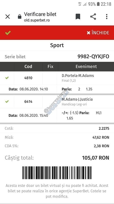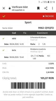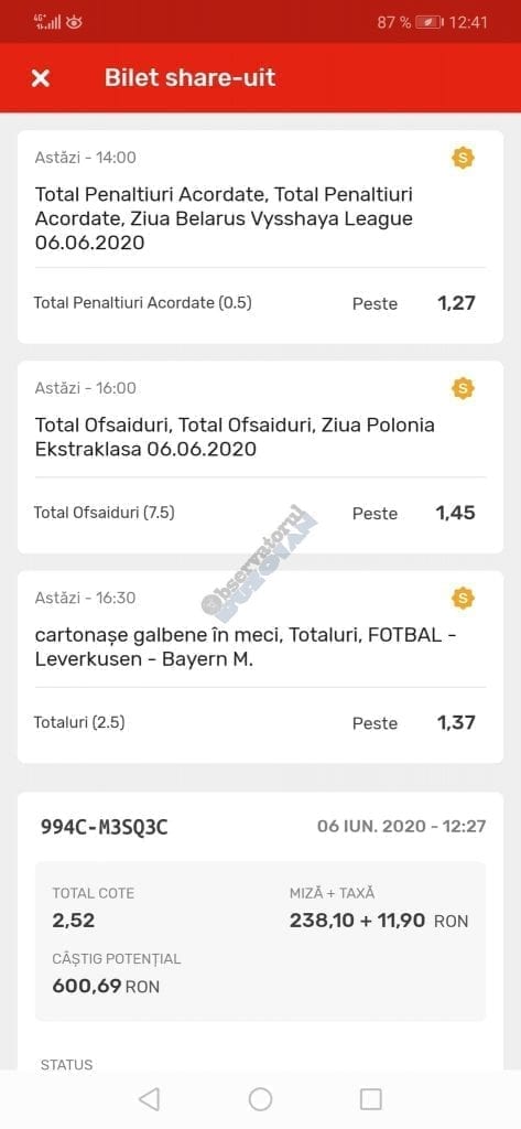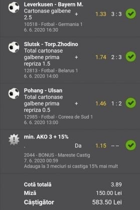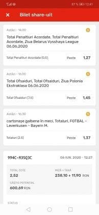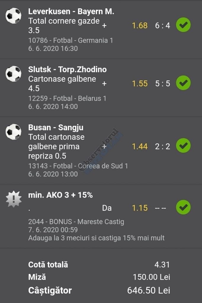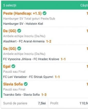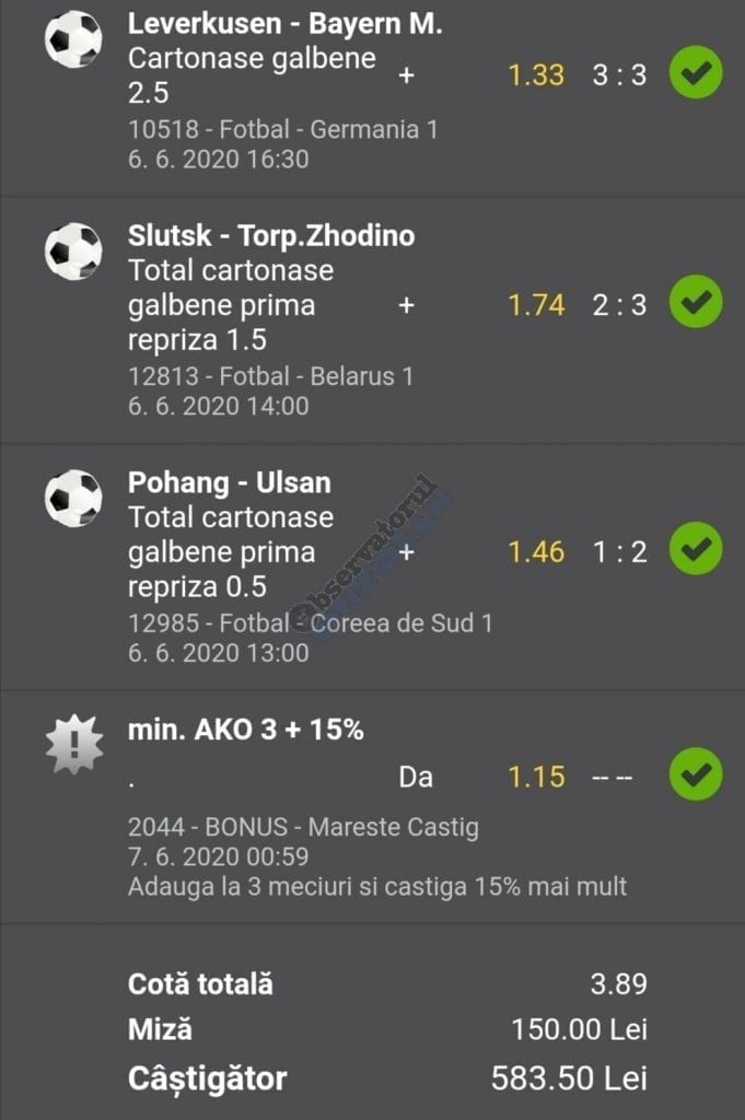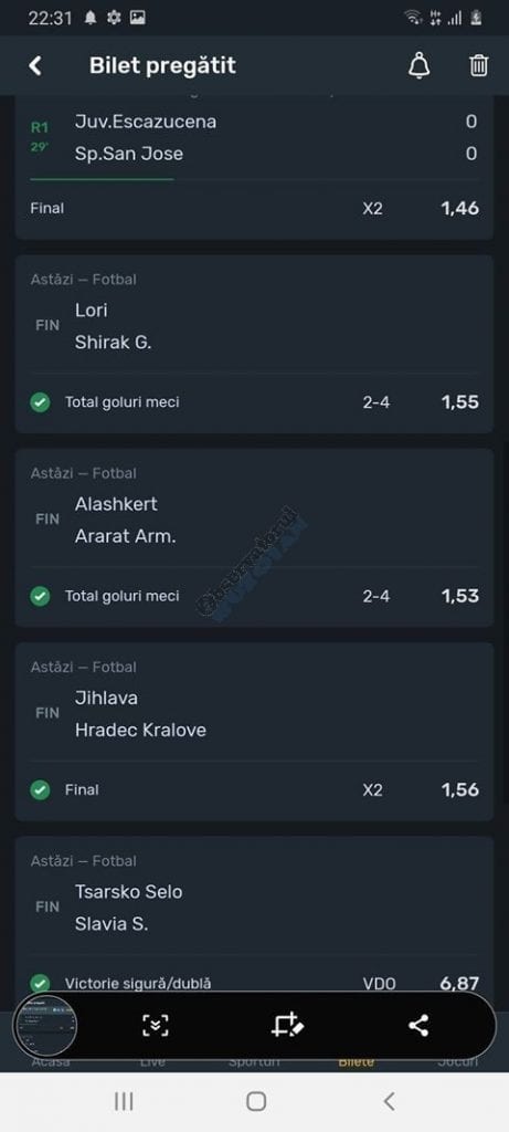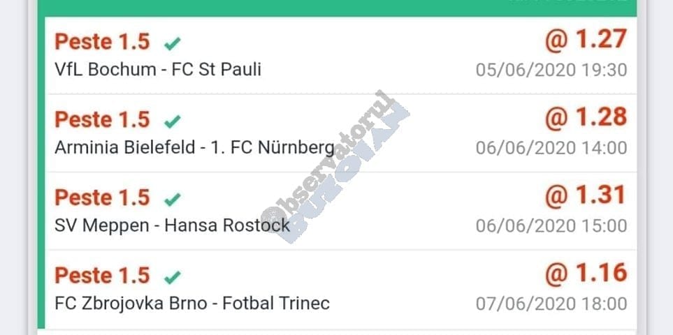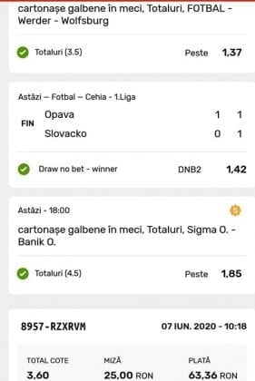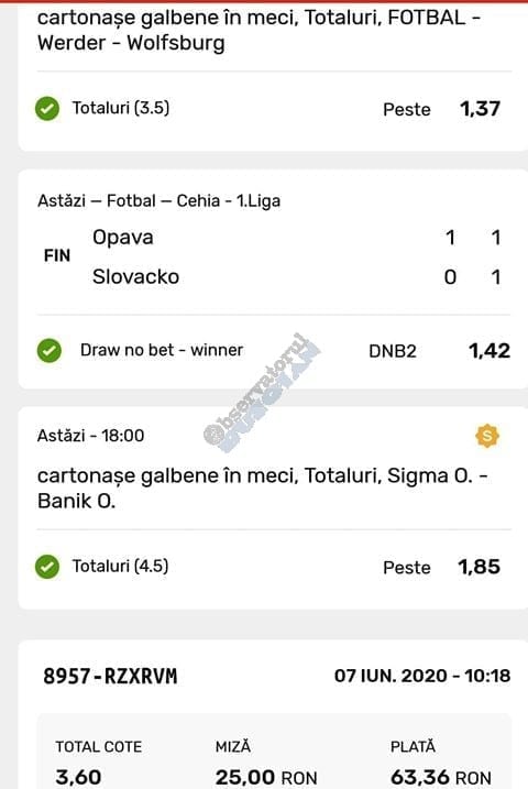 Avem și o galerie foto, nu cu biletele multor jucători, pentru că on-line-ul ăsta nenorocit încă este un obstacol! Și totuși se joacă, iar primele trei verzi (foto 1 – 3) sunt ale lui Vali GG, “specialul în speciale” cu care mă mai sfătuiesc și eu în weekend. Cred că le-ați văzut și postate pe diverse grupuri, așa cum au fost publice și cele jucate de mine (nu vă spun în ce sistem/condiții au fost plasate cu bani reali! Ar fi ca un autodenunț…) din foto nr. 4 – 7. Pierdute la milimetru, pe un campionat care mi-a scos peri albi în primele lui etape pe la jumatea pandemiei (Belarus) și de care nu vreau să mai aud în vecii vecilor. Amin! Apoi, continuăm cu biletul nr. 8 al profului de română Cătălin Zaman. Un careu de ași cu “2+” la toate meciurile, o cotă de 2 și-un pic care ar face fericit orice parior serios din galaxie, dacă ar apărea de 4-5 ori pe săptămână! Și în foto nr. 9, biletul lui Nicolae Vasile, vedem o mostră de bilet la mare siguranță. Cota 3+ reușită fără mari emoții, cu destule speciale strecurate pe acolo și o culoare care ne place atât de mult. VERDE. Hai c-am ajuns și la biletul de nota 10 al săptămânii, evident, plasat în foto nr. 10 și aparținând lui Florea Cristian. Aplauzele mele nu cred că sunt singulare, am mai văzut oameni pe unul dintre grupuri lăudându-i inspirația. Tot cam în aceeași zonă a perfecțiunii se încadrează și biletul lui Florin Ghelbere (foto nr. 11), dar mi-a apărut în cronologie după cel de dinaintea lui , așa că rămâne doar cu consolarea că ar fi putut obține coronița cu lauri. Banii sunt la el, altceva nu mai contează. Ultimul din lista acestei săptămâni este argeșeanul Neluță Modrojan, unul dintre campionii la COTA 2 INVITATIONAL, care face și el un verde scurt (foto nr. 12), special parcă pentru rubrica noastră de la Observator. De fapt să știți c-au fost vreo 5,6 în seria trimisă de el, dar m-a prins într-un moment mai aglomerat și l-am rugat să-și aleagă unul singur, vârful de lance!