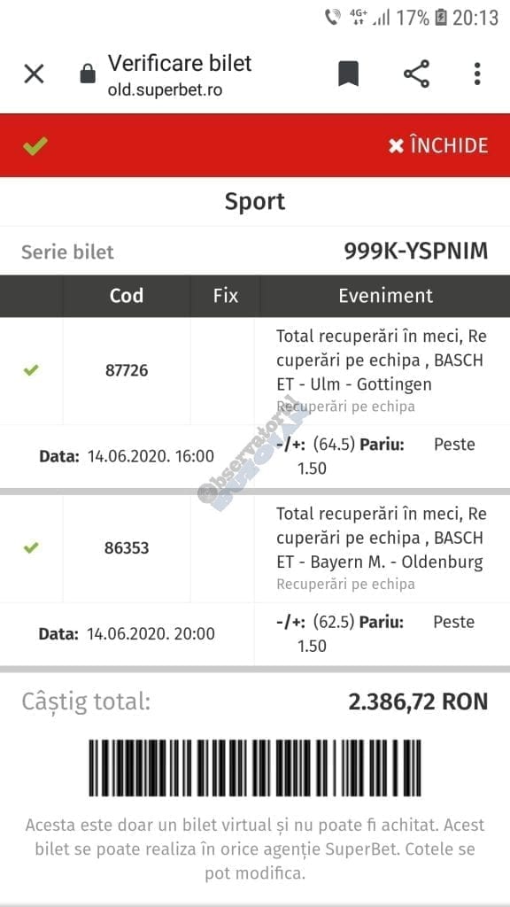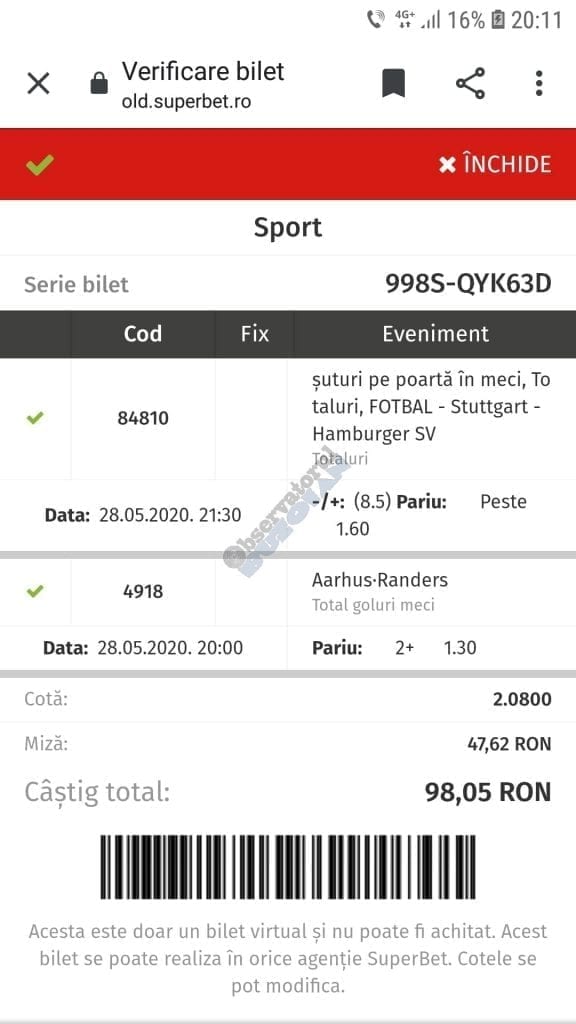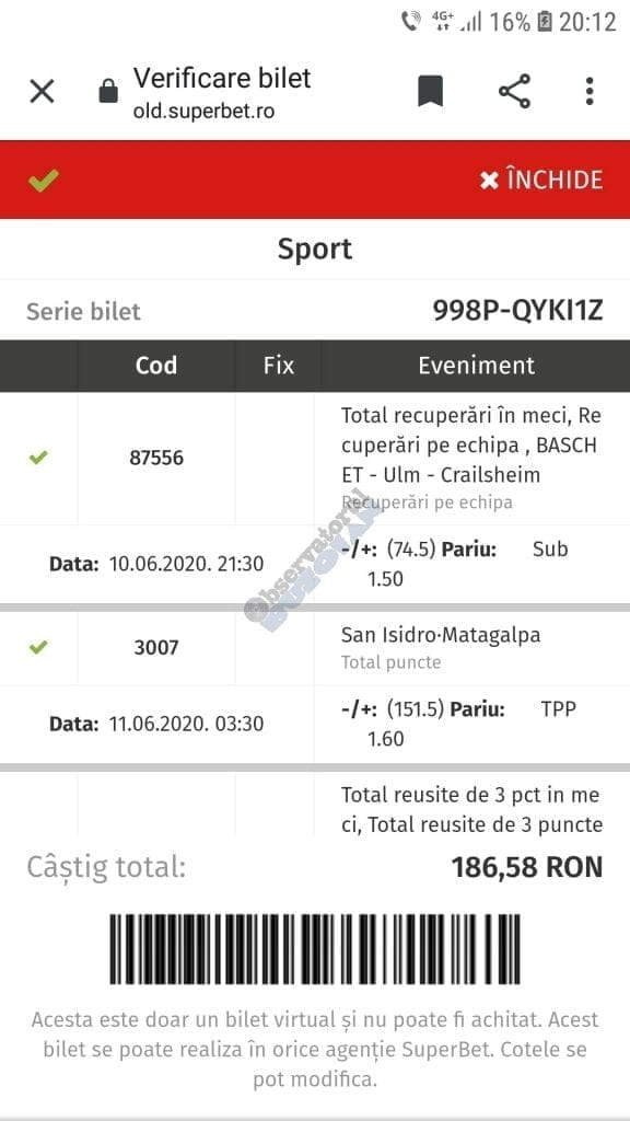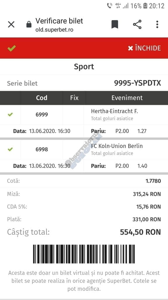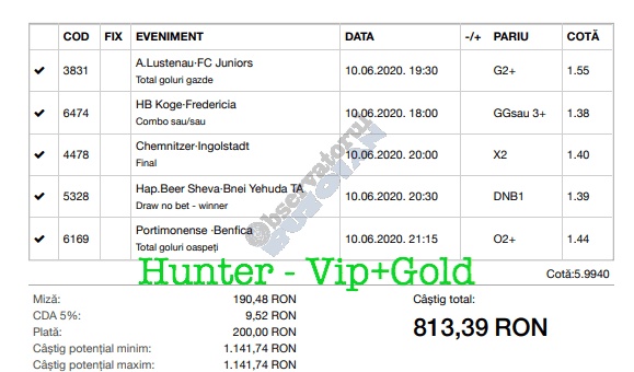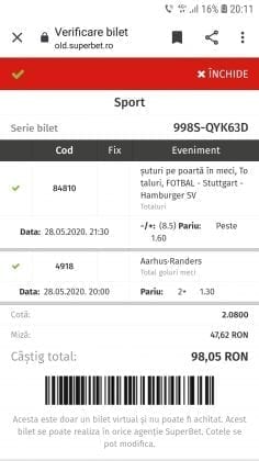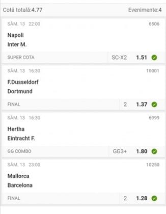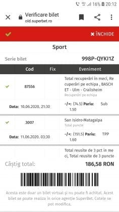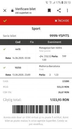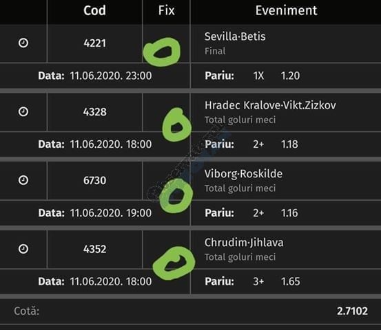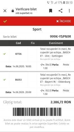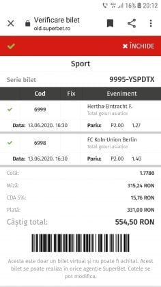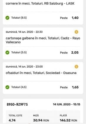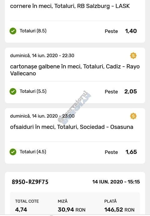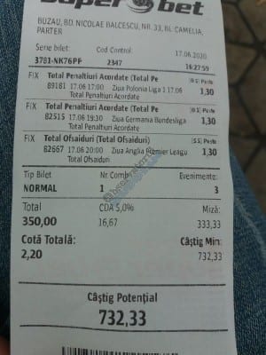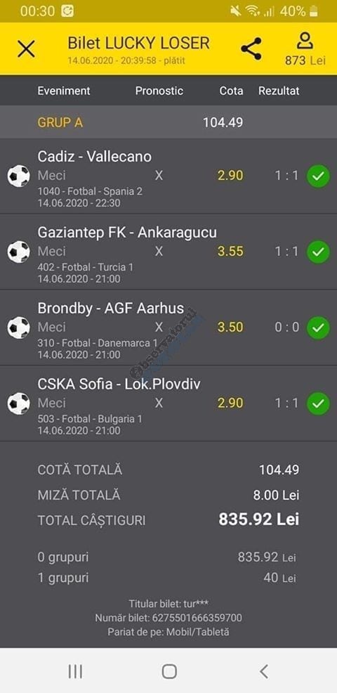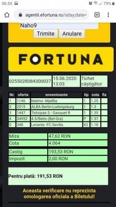 Avem și o galerie foto, cu biletele multor jucători, pentru că on-line-ul ăsta nenorocit nu mai este un obstacol! Prima fotografie a zilei este un bilet al colegului Vali M., autorul deschiderii acestui articol. A fost ultimul plasat de el înaintea redeschiderii agențiilor terestre și plasat online pe o sumă inaccesibilă muritorilor de rând, de aceea nici nu am vrut să-l arăt în toată splendoarea lui. Și, pregătiți-vă, mai are unul în desfășurare, plasat tot pe “4 cifre” cu tema de lucru numele campioanelor din Romania și Italia! Urmează două mostre de precizie pe “speciale” (foto 2 și 3) avandu-l ca autor pe Vali GG. Joacă buzoianul nostru cu o precizie aproape chirurgicală, rata sa de câștig fiind de 70-72%, iar când ratează vreun bilet o face realmente dramatic. Biletul cu nr. 4 vine din Bosnia, de la amicul Takir Copic, un jucător deja obișnuit al rubricii noastre, tot scurt, doar trei evenimente, și colorat în verde fără emoții. La fel cum o face și Ka Do în postarea sa (foto nr. 5), doar că el are un careu de ași în mână și banii în portofel. De la Gh. Cârstea și biletul 6 începem să creștem numărul meciurilor, de data asta sunt cinci bucăți și toate cu cote mici, ușoare și sporturi combinate, nu doar fotbalul pe care cu toții l-am așteptat atât de mult să revină în prim-plan! Revenim în Buzău și ne reîntâlnim cu Pompiliu Untaru (foto nr. 7), autorul unui patrulater de meciuri cu cote deja medii ca mărime, cu dificultate oarecum sporită, dar cu încasări perfecte pentru bugetul fiecăruia dintre noi. Cu cinci meciuri pe bilet și o cotă 6 demnă de toate manualele despre pariuri ne delectează privirile Valentin “Hunter”. Dar și el e client fidel al paginii noastre, așa că nu insistăm deloc cu laudele. Ne apropiem de punctul culminant al galeriei foto, iar la poziția nr. 9 vedem un alt parior “cu cap”, așa cum Nicolae Vasile și-a și denumit grupul său de follow-eri, un terțet de “speciale” care mă face și pe mine să-l pun pe lista de “urmăriți” pe nou-intratul între cele aproape 600 de nume care ne-au călcat pragul din februarie 2019 și până azi. Și am ajuns la biletul de nota 10 al săptămânii, evident din foto cu nr. 10, autor fiind Florin Iancu, care, modest, a spus că s-a inspirat în alegerea celor șase meciuri ușoare și simple din ideile grupului “Green Tickets”. Super-tare, bravo vouă! La mare luptă pentru marele premiu s-a aflat și acest bilet cu nr. 11, adus de Tavi Turcu. Fenomenală inspirație, patru meciuri, toate jucate “X solist” la o cotă de puțin peste sută și tot respectul nostru! Închidem cu o serie de cinci bilete în piramidă (foto 12-16) ale argeșeanului Nelu Modrojan, foarte inspirat și norocos, dar și curajos în a dubla zi cu zi pe “totul sau nimic”. Vedem data viitoare dacă seria câștigătoare a continuat…