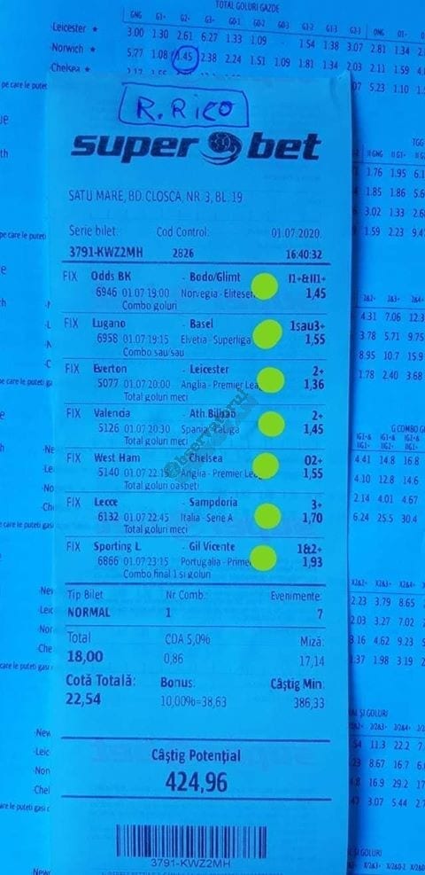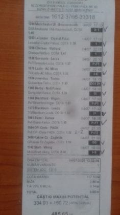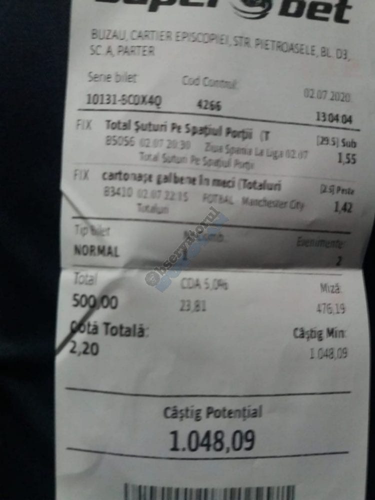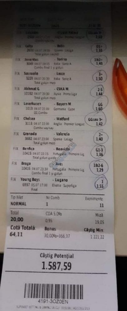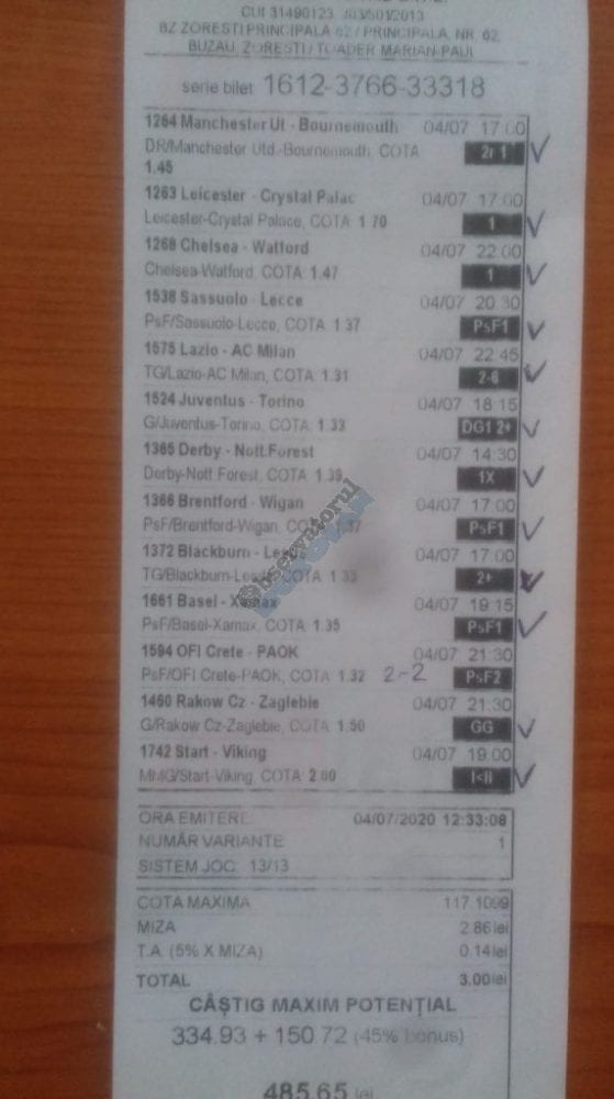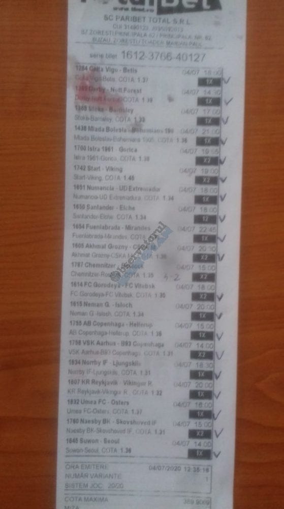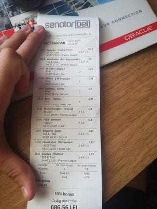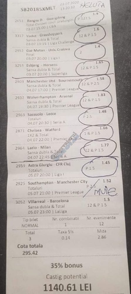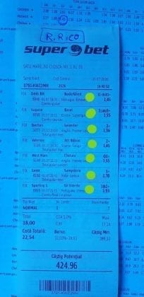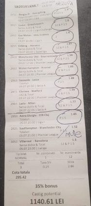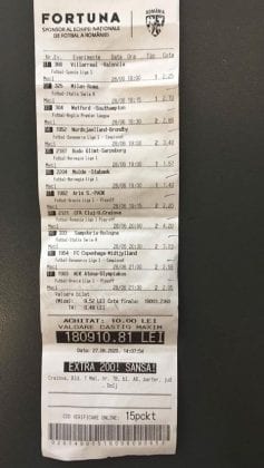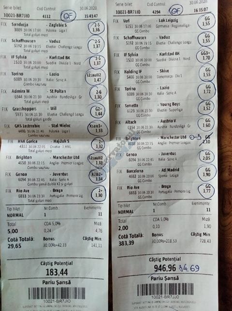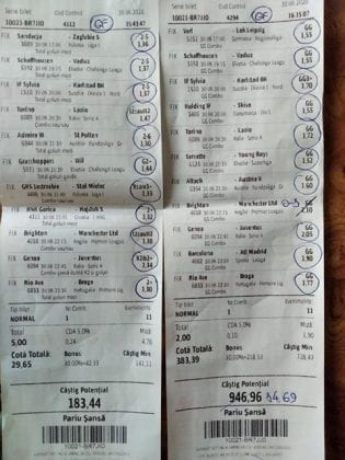 Avem și o galerie foto bine populată, cu biletele multor jucători, pentru că săptămâna în care v-am tot urmărit a fost destul de profitabilă. Nu e universal valabil acest termen, o să vedeți niște ratări de-o să vă ia capul! Sau, probabil, le aveți și voi pe ale voastre deja, cu Inter, cu Dinamo Zagreb, cu City ori CFR… Trecem la treabă pentru că e muuuult de povestit! Primul bilet al zilei vine de la Cristian Curcă, un debut în ziarul nostru. Meciurile nu sunt greu de analizat, dar variantele alese de el chiar că au fost! Meserie, frate! Apoi, biletul nr. 2, care de fapt conține un duet al lui Florin Ghelbere, ne arată simplitate, atât ca alegeri ale evenimentelor, cât, mai ales, ale soluțiilor! Siguranță maximă joacă colegul, nu se încurcă cu nave cosmice. Un bilet verde pur, unul la șansă și bugetul e ok pentru încă o săptămână de hobby, că e clar pentru mine că omul nu-și plătește facturile cu sumele câștigate și nici în vacanțe exotice nu merge! Pe aceeași linie se încadrează și Florin Iancu, cote mici și medii, meciuri cu echipe cunoscute și mize mici, doar de plăcere. Doar că în foto nr. 3 e un bilet atipic pentru el, cu cote mai atractive pentru jucători și un „5+” verde că brazii-n miezul iernii! Urmează trei poze ale colegului V. Mocanu (4, 5 și 6), cu două bune și-o ratare monumentală. La meciul Santa Clara – Maritimo, niște ciomăgari prin definiție, dar cu talente de blătuitori, se pariase că vor fi minim 5 galbene în meci, iar 4 se făcuseră deja în min 47. După aia, timp în care oaspeții au și marcat golul care îi va salva de la retrogradare, au mai fost în meci maxim 5-6 faulturi, deci absolut niciun motiv pentru vreun avertisment al arbitrului Xistra! Vorbim de două echipe care au bătut-o în jocuri consecutive pe Benfica, marea campioană a blaturilor din acest sezon, deci o familie mare și fericită de mizerabili! Trec de biletul nr. 7, o să-l analizez câteva rânduri mai încolo și ajung la nr. 8, al lui Ionel Cartan. Ultimul campion la COTA 2 INVITATIONAL a făcut ce știe mai bine, un verde din autoizolarea impusă de firmă. (Că au un coleg de birou descoperit pozitiv…) Iar biletul nr. 9 e al sibianului Gh. Cârstea, premiantul de săptămână trecută al ziarului care ne găzduiește această rubrică. E o cotă 2 în toată splendoarea acetui tip de joc, simplu, calculat, riscuri minimale. Am ajuns la premiantul săptămânii, Roberto Rico, iar el e responsabil de două bilete, cel cu nr. 7 și nr. 10. Al doilea realizat chiar de ziua lui de naștere, dar ideile, stilul și modul de a micșora riscurile sunt fenomenale! O să vă mirați de ceea ce urmează în foto nr. 11, e un bilet cu un câștig de 180 de milioane, al unui jucător anonim, dar postat de Valentina Ana Maria Păun. O nebunie pusă în glumă și un noroc cum doar prietenii de pe partea întunecată a orientărilor sexuale îl pot avea. Pe bune, las-o naibii de treabă! Minunat că s-au încasat banii, dar să nimerești atâtea chestii imposibile pe un singur amărât de bilet… Și o cotă finală de 19 mii… Mama mea, Doamne! Trecem peste, că ne ia capul. Și ajungem la o triplă (12, 13 și 14) jucată și câștigată de “specialul” Vali GG din Buzău, un om care pierduse infernal cu doar 5-6 zile în urmă, dar a reușit să se redreseze pe finalul săptămânii. Un alt buzoian urmează acum. E Pompiliu Untaru cu o dublă de “șanse” (foto nr. 15 și 16), nu foarte mulți bani, dar parcă se mai îndulcește amarul atâtor zile de kakao, nu? Biletul nr. 17 vine din Bosnia, de la amicul Takir Copic cu un careu de soliști 99% ai serii de sâmbătă. Niciunul n-a făcut pași aiurea, iar omul a bifat o cotă de aproape 5 și convertită în bănuți reali. Ne apropiem de final. Avem în poza nr. 18 biletul lui Florin Ionuț și cele 11 evenimente câștigătoare alese de el cu variante nu așa simple cum ar părea la o privire superficială. Apoi , la nr. 19, un prieten al ziarului, este argeșeanul Nelu Modrojan și suita sa de ghinioane care pare să nu se mai termine. I-ar fi trebui o victorie a lui Manchester City după golul marcat de gazde în primul sfert de oră, pentru că altfel nu se mai ajungea nicicum la “peste 2,5” și la cele 11 milioane care-l așteptau în agenție… Punem punct articolului cu un bilet câștigător (foto nr. 20) și un alt debutant în paginile Observatorului, Vasy Pintea din Constanța. Că el recunoaște public că a acceptat ideile unor băieți mai experimentați din grup sau că nu s-a riscat la ceva mai atractiv ca și cotă, preferând să joace “safe”, e un plus pentru caracterul său!