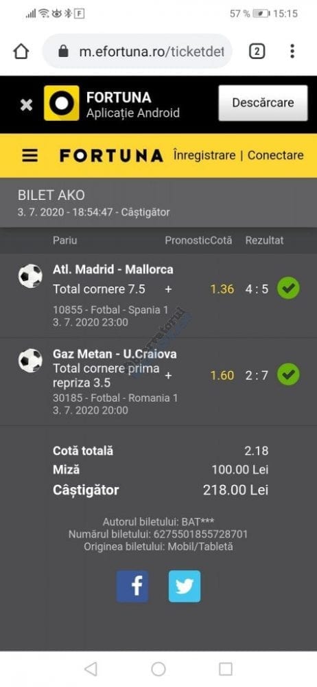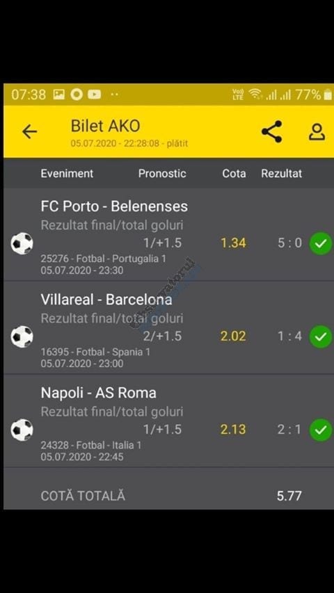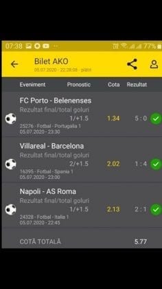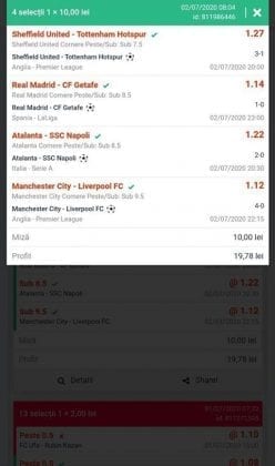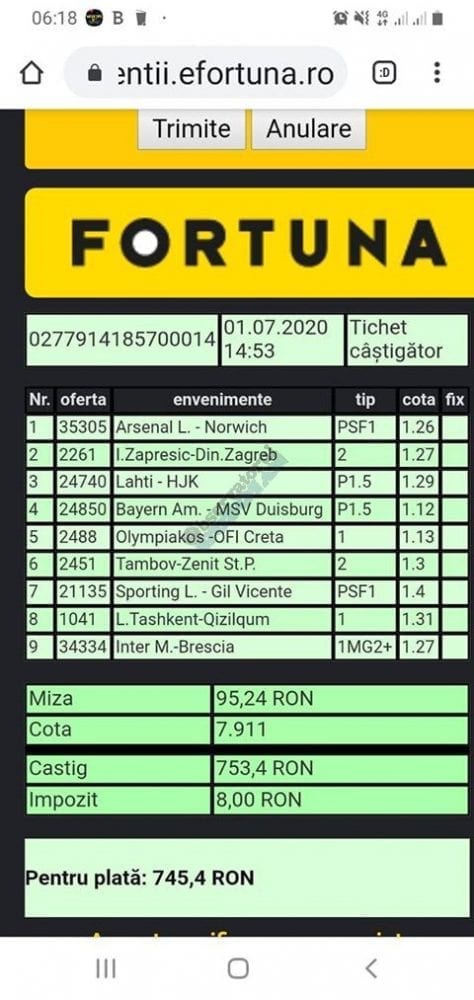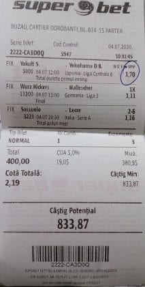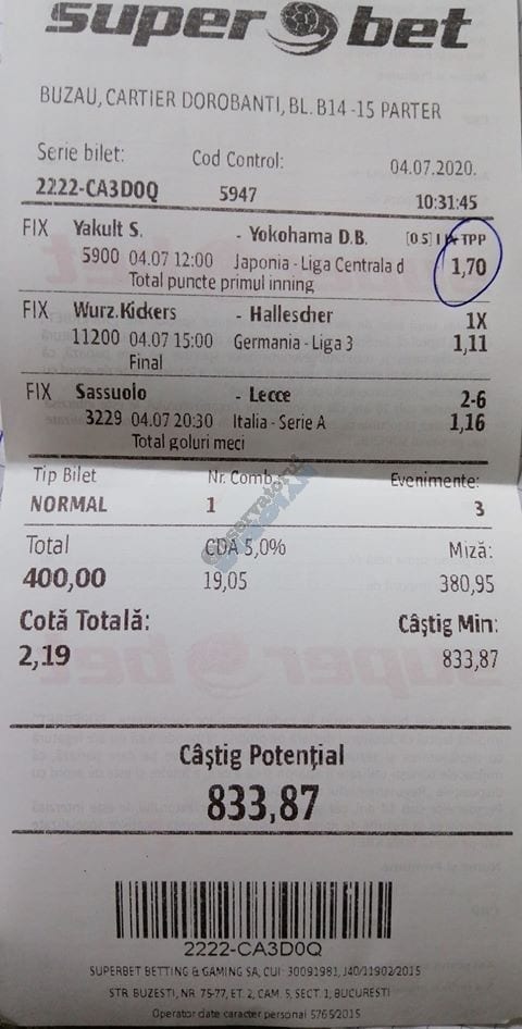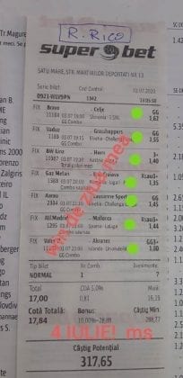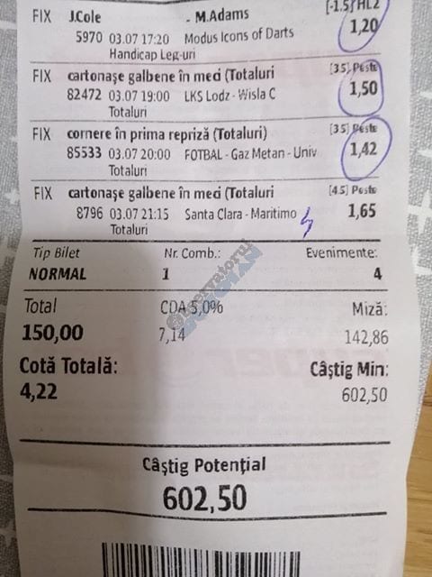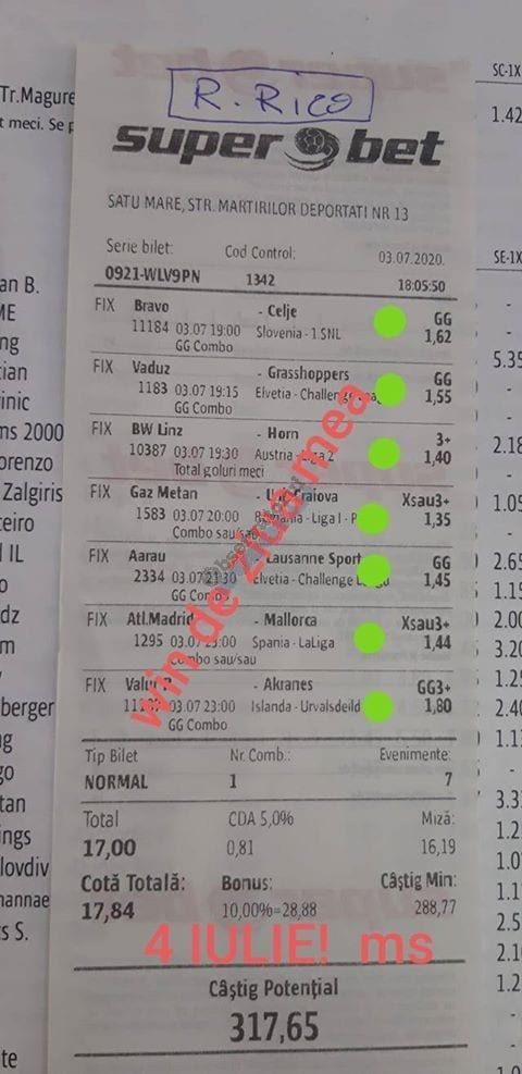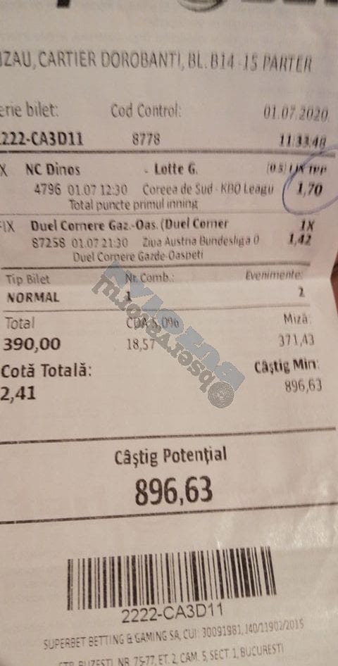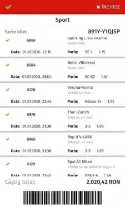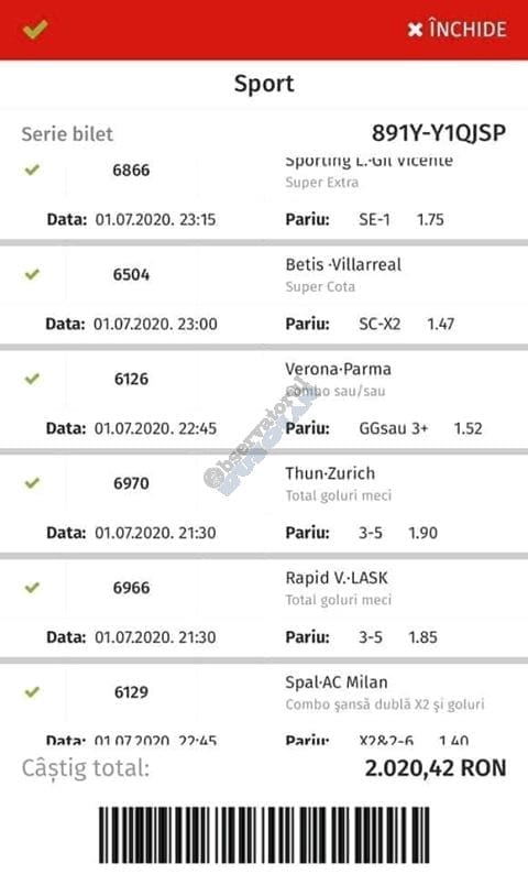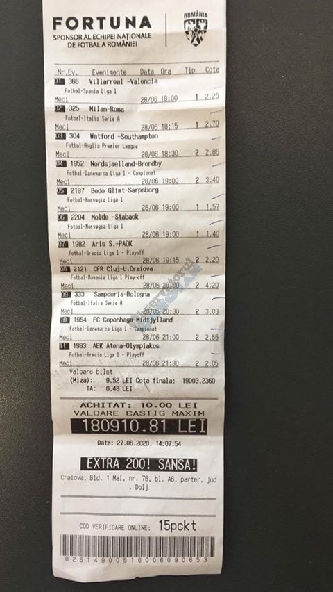 Avem și o galerie foto bine populată, cu biletele multor jucători, pentru că săptămâna în care v-am tot urmărit a fost destul de profitabilă. Nu e universal valabil acest termen, o să vedeți niște ratări de-o să vă ia capul! Sau, probabil, le aveți și voi pe ale voastre deja, cu Inter, cu Dinamo Zagreb, cu City ori CFR… Trecem la treabă pentru că e muuuult de povestit! Primul bilet al zilei vine de la Cristian Curcă, un debut în ziarul nostru. Meciurile nu sunt greu de analizat, dar variantele alese de el chiar că au fost! Meserie, frate! Apoi, biletul nr. 2, care de fapt conține un duet al lui Florin Ghelbere, ne arată simplitate, atât ca alegeri ale evenimentelor, cât, mai ales, ale soluțiilor! Siguranță maximă joacă colegul, nu se încurcă cu nave cosmice. Un bilet verde pur, unul la șansă și bugetul e ok pentru încă o săptămână de hobby, că e clar pentru mine că omul nu-și plătește facturile cu sumele câștigate și nici în vacanțe exotice nu merge! Pe aceeași linie se încadrează și Florin Iancu, cote mici și medii, meciuri cu echipe cunoscute și mize mici, doar de plăcere. Doar că în foto nr. 3 e un bilet atipic pentru el, cu cote mai atractive pentru jucători și un „5+” verde că brazii-n miezul iernii! Urmează trei poze ale colegului V. Mocanu (4, 5 și 6), cu două bune și-o ratare monumentală. La meciul Santa Clara – Maritimo, niște ciomăgari prin definiție, dar cu talente de blătuitori, se pariase că vor fi minim 5 galbene în meci, iar 4 se făcuseră deja în min 47. După aia, timp în care oaspeții au și marcat golul care îi va salva de la retrogradare, au mai fost în meci maxim 5-6 faulturi, deci absolut niciun motiv pentru vreun avertisment al arbitrului Xistra! Vorbim de două echipe care au bătut-o în jocuri consecutive pe Benfica, marea campioană a blaturilor din acest sezon, deci o familie mare și fericită de mizerabili! Trec de biletul nr. 7, o să-l analizez câteva rânduri mai încolo și ajung la nr. 8, al lui Ionel Cartan. Ultimul campion la COTA 2 INVITATIONAL a făcut ce știe mai bine, un verde din autoizolarea impusă de firmă. (Că au un coleg de birou descoperit pozitiv…) Iar biletul nr. 9 e al sibianului Gh. Cârstea, premiantul de săptămână trecută al ziarului care ne găzduiește această rubrică. E o cotă 2 în toată splendoarea acetui tip de joc, simplu, calculat, riscuri minimale. Am ajuns la premiantul săptămânii, Roberto Rico, iar el e responsabil de două bilete, cel cu nr. 7 și nr. 10. Al doilea realizat chiar de ziua lui de naștere, dar ideile, stilul și modul de a micșora riscurile sunt fenomenale! O să vă mirați de ceea ce urmează în foto nr. 11, e un bilet cu un câștig de 180 de milioane, al unui jucător anonim, dar postat de Valentina Ana Maria Păun. O nebunie pusă în glumă și un noroc cum doar prietenii de pe partea întunecată a orientărilor sexuale îl pot avea. Pe bune, las-o naibii de treabă! Minunat că s-au încasat banii, dar să nimerești atâtea chestii imposibile pe un singur amărât de bilet… Și o cotă finală de 19 mii… Mama mea, Doamne! Trecem peste, că ne ia capul. Și ajungem la o triplă (12, 13 și 14) jucată și câștigată de “specialul” Vali GG din Buzău, un om care pierduse infernal cu doar 5-6 zile în urmă, dar a reușit să se redreseze pe finalul săptămânii. Un alt buzoian urmează acum. E Pompiliu Untaru cu o dublă de “șanse” (foto nr. 15 și 16), nu foarte mulți bani, dar parcă se mai îndulcește amarul atâtor zile de kakao, nu? Biletul nr. 17 vine din Bosnia, de la amicul Takir Copic cu un careu de soliști 99% ai serii de sâmbătă. Niciunul n-a făcut pași aiurea, iar omul a bifat o cotă de aproape 5 și convertită în bănuți reali. Ne apropiem de final. Avem în poza nr. 18 biletul lui Florin Ionuț și cele 11 evenimente câștigătoare alese de el cu variante nu așa simple cum ar părea la o privire superficială. Apoi , la nr. 19, un prieten al ziarului, este argeșeanul Nelu Modrojan și suita sa de ghinioane care pare să nu se mai termine. I-ar fi trebui o victorie a lui Manchester City după golul marcat de gazde în primul sfert de oră, pentru că altfel nu se mai ajungea nicicum la “peste 2,5” și la cele 11 milioane care-l așteptau în agenție… Punem punct articolului cu un bilet câștigător (foto nr. 20) și un alt debutant în paginile Observatorului, Vasy Pintea din Constanța. Că el recunoaște public că a acceptat ideile unor băieți mai experimentați din grup sau că nu s-a riscat la ceva mai atractiv ca și cotă, preferând să joace “safe”, e un plus pentru caracterul său!