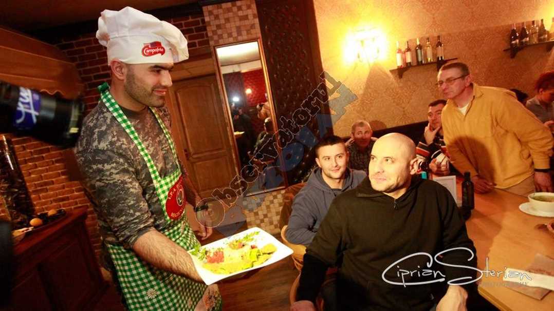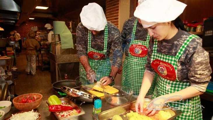 Timp de aproape două ore, cei 9 polițiști din care trei membri ai trupelor de intervenție rapidă în frunte cu campionul național de box Bogdan Dinu au gătit ciorbă de legume, pilaf cu legume, chiftele de post și salată de varză murată iar la final au montat totul pe farfurii demne de un concurs gen Master Chef.