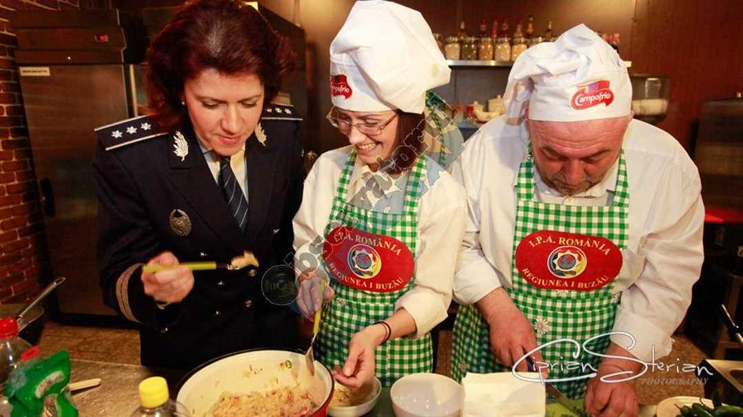 Nouă polițiști din cadrul IPJ Buzău adunați în trei echipe au pus, joi dimineață, uniformele în cui și s-au strâns în bucătăria unui restaurant din oraș pentru a găti mâncare pentru locatarii unui azil de bătrâni din comuna Ulmeni. Fiecare echipă formată din câte doi bărbați și o femeie a trebuit să gătească același fel de mâncare după rețetele proprii iar la final un juriu a desemnat care echipă a făcut cea mai bună mâncare, echipă care s-a deplasat la Ulmeni pentru a-i servi personal pe bătrânii de la cămin.