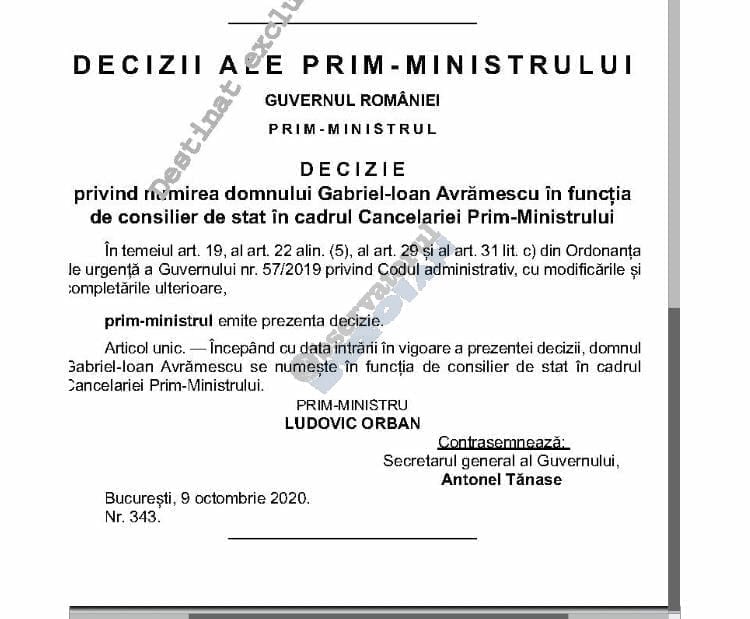 Astfel, începând de vineri, Avrămescu devine consilier de stat în cadrul Cancelariei Primului Ministru decizia fiind deja publicată în Monitorul Oficial.
