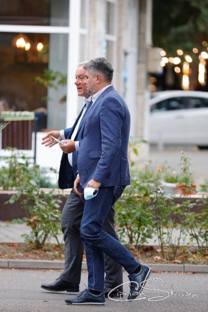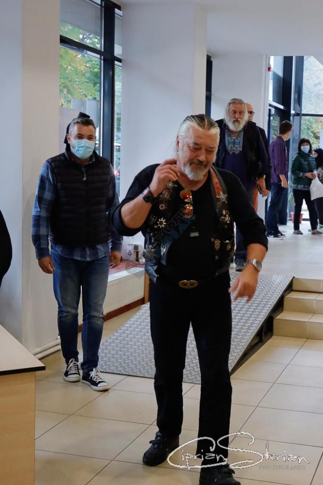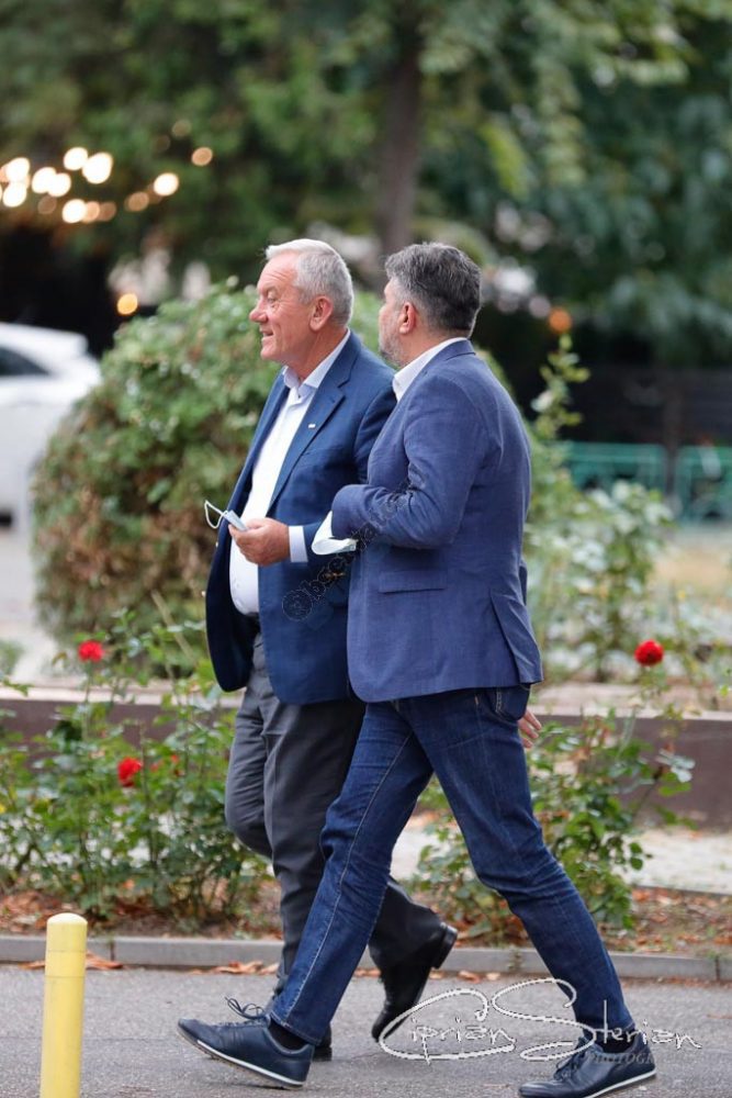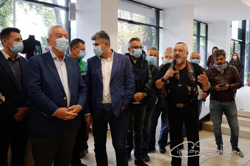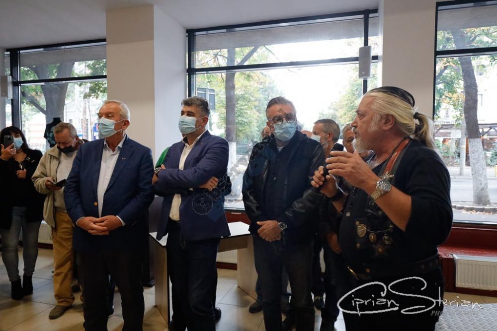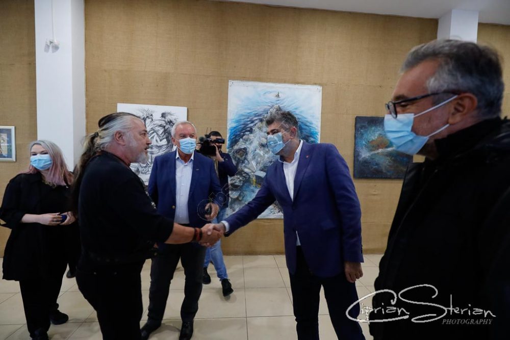 Cei doi artiști plastici care expun la Galeriile de Artă, solistul trupei Phoenix-Nicu Covaci și Valeriu Sepi se aflau la momentul sosirii șefului PSD la o terasă din apropiere și au venit după ce au fost anunțați de organizatori. Primarul municipiului Buzău Constantin Toma a făcut prezentările iar Ciolacu a glumit pe seama senatorului Lucian Romașcanu, fost ministru al Culturii.