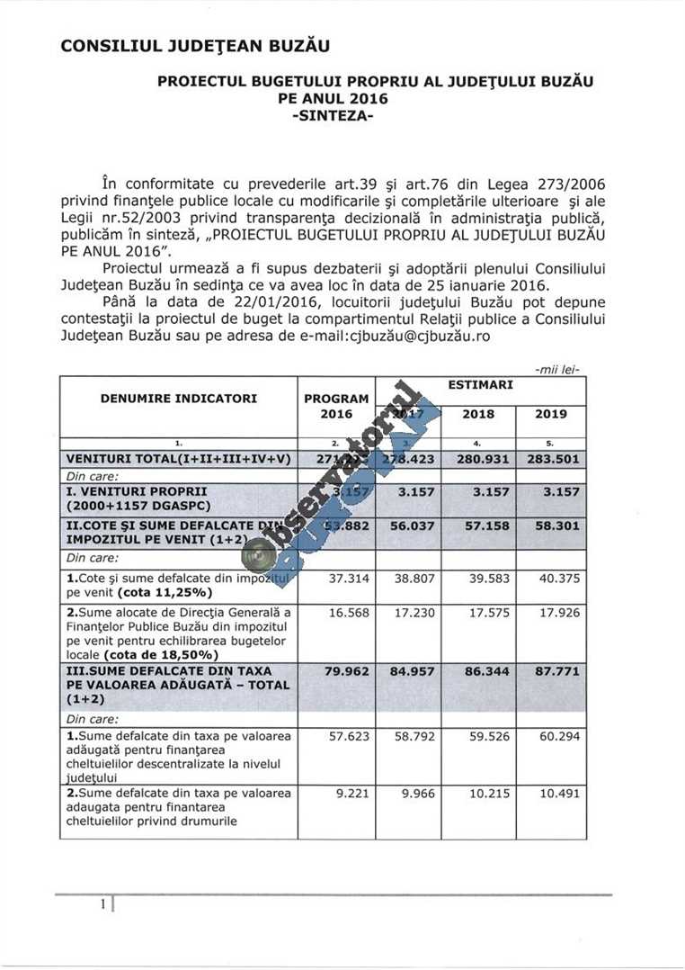 […] Consiliul Județean a lansat în dezbatere publică proiectul bugetului propriu al județului Buzău pe anul 2016 care urmează să fie aprobat în deliberativul județean în prima ședință ordinară de consiliu din 2016 care ar urma să aibă loc pe data de 25 ianuarie. Astfel, a fost publicată pe site-ul Consiliului Județean o sinteză a proiectului ce urmează a fi dezbătut în 25 ianuarie iar timp de 2 săptămâni buzoienii pot veni cu contestații și propuneri la proiectul de buget pe care le pot aduce la cunoștința factorilor de decizie lăsându-le la compartimentul de Relații Publice al Consiliului Județean sau la Sursă știre […]