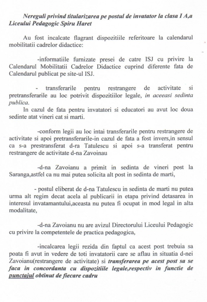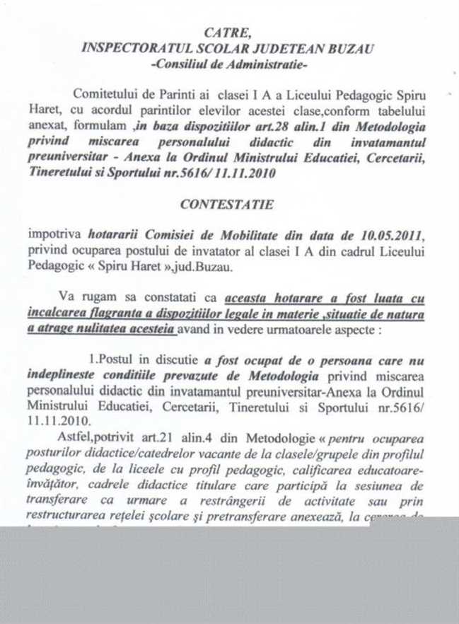 Cazul părinţilor revoltaţi de felul în cum a fost înlocuită învăţătoarea de la o clasă I din Liceul Pedagogic (Şcoala Normală „Spiru Haret”) arată modul în care imperfecţiunile din sistem forţează lumea la proteste de stradă. Dincolo de comentariile cu iz politic, care ar face deliciul în chestiune, ceea ce sesizează părinţii în cele două documente pe care le prezentăm în exclusivitate şi care vorbesc de la sine, este suficient cât să facă pretextul unui proces în instanţa de judecată. Am asista în premieră la situaţia în care mămicile şi bunicile acţionează în tribunal administraţia şcolilor, pentru a corecta ceea ce se susţine a fi o încălcare gravă a legislaţiei privitoare la mişcarea personalului didactic.