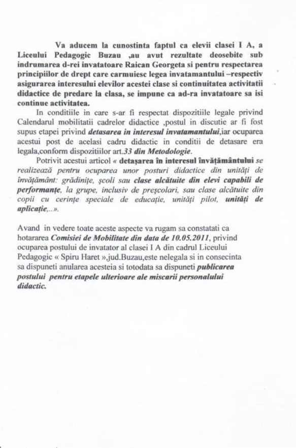 Trimise pe adresa redacţiei observatorulbuzoian.ro, cele două documente marchează şi o altă premieră. Pe fondul unor reacţii neconvingătoare ale conducerii Inspectoratului Şcolar şi ale sindicaliştilor care acuzau, până acum, o colaborare lipsită de consistenţă cu asociaţiile de părinţi, acţiunea Comitetului de părinţi ai elevilor clasei I A din Liceul Pedagogic poate fi şi o mostră a implicării reale în mersul şcolii, unde teoretic părinţii sunt un factor decident direct solicitat în acest sens, dar practic sunt lăsaţi să-şi spună păsurile în stradă. Aşa cum ne-a anunţat Nicoleta Ciubeică, preşedinta Comitetul de părinţi menţionat, cele două documente au fost înaintate către IŞJ Buzău, iar azi, părinţii se vor prezenta la sediul IŞJ, „în speranţa de a putea rezolva această problemă”.